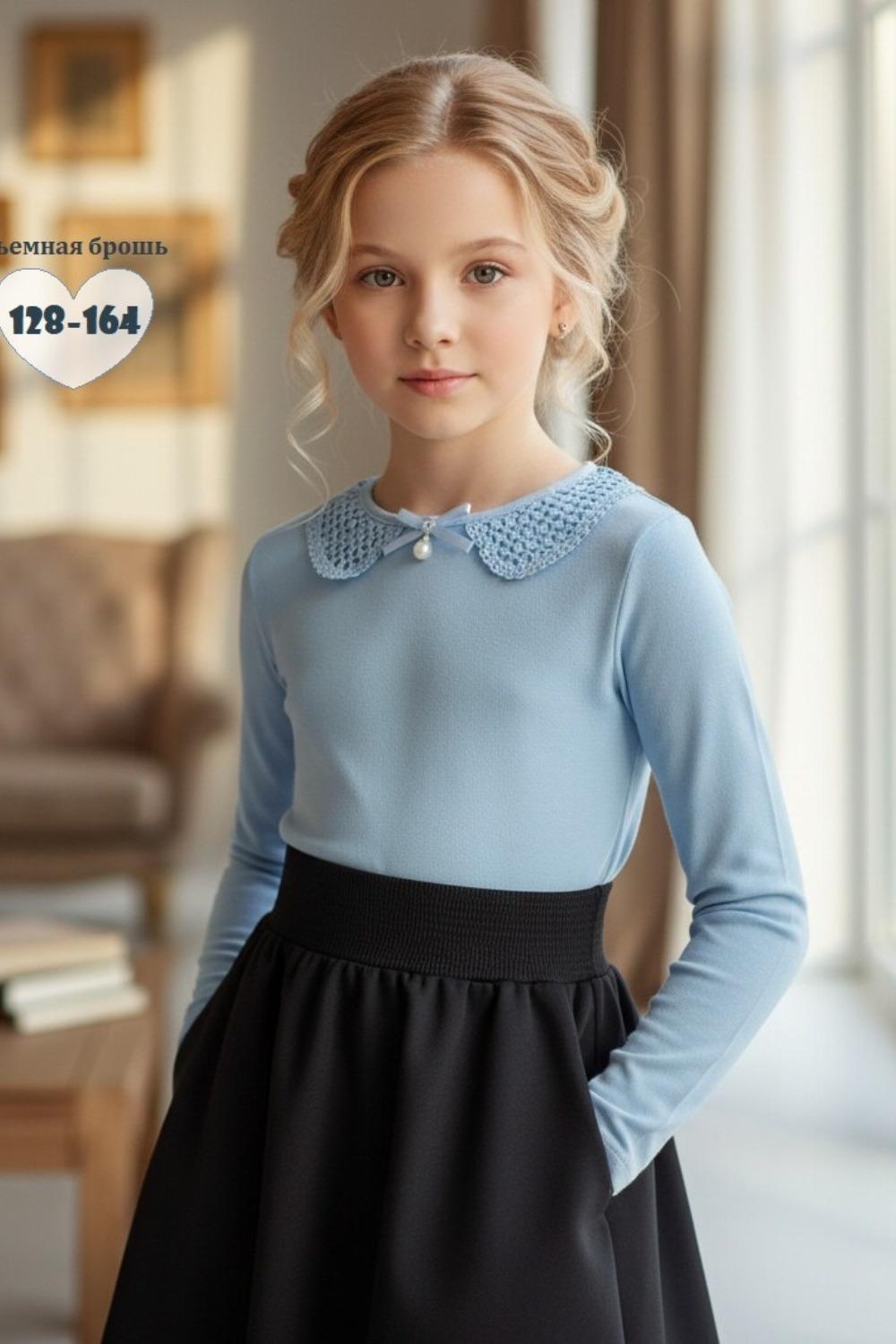Джемпер для девочек младшего и старшего школьного возраста, из трикотажного однотонного полотна – кулирка с лайкрой. Джемпер полуприлегающего силуэта, с втачным длинным рукавом, с кружевным воротником, с центральной застежкой на петлю и пуговицу на спинке. Спереди отсутствуют линии членения. На спинке вырез в виде «капельки». Срез горловины и капля окантованы. Рукав одношовный. Низа рукава и изделия подогнуты. Спереди по центру горловины прикреплен декоративный элемент.