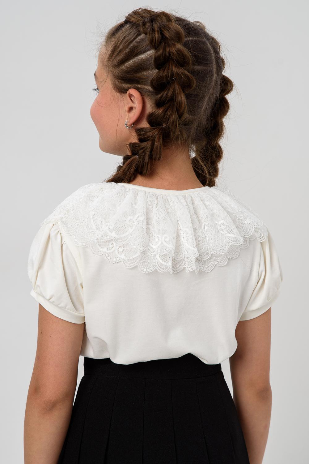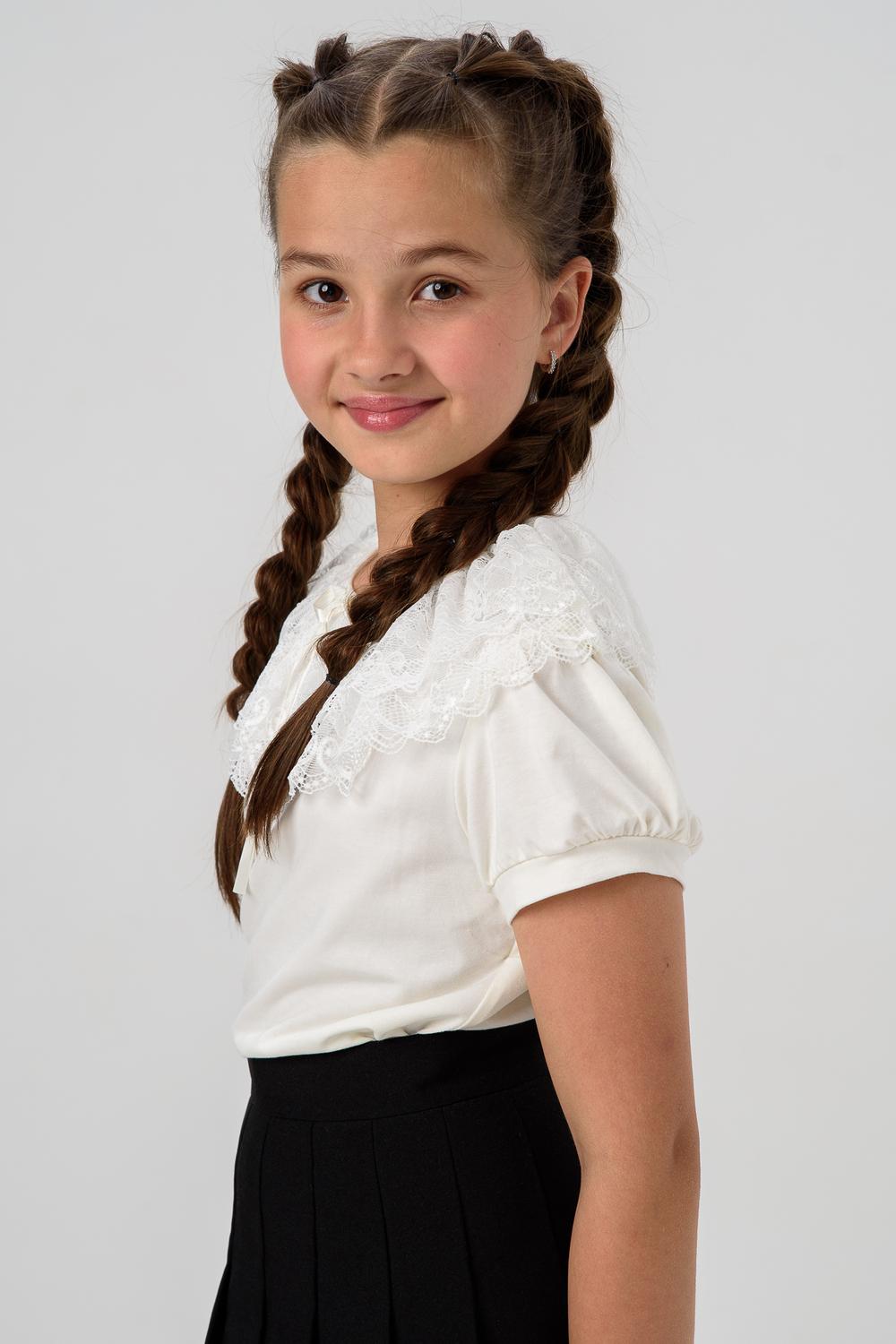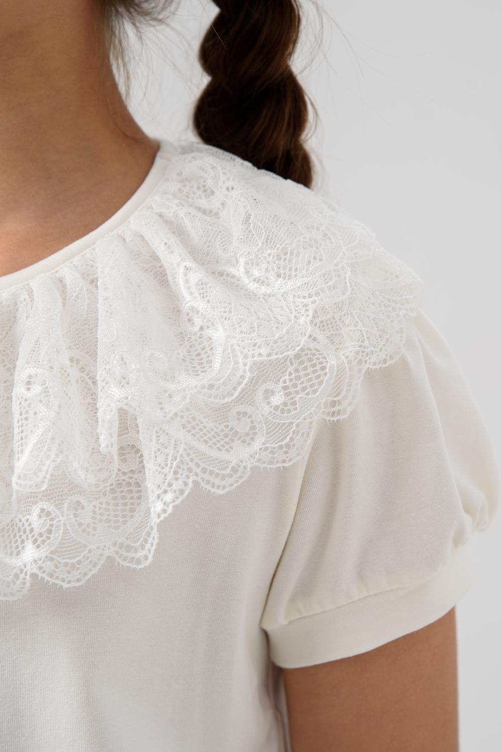 Джемпер для девочек младшего и старшего школьного возраста, из однотонного трикотажного полотна кулирка с лайкрой. Джемпер полуприлегающего силуэта, с втачным рукавом, без застежки. Спереди и на спинке отсутствуют линии членения. Срез горловины окантован с вложением присборенного кружева в 2 слоя разной ширины. Рукав одношовный, короткий, в виде «фонарика», на манжете. Низ изделия подогнут. По центру горловины прикреплен декоративный элемент.