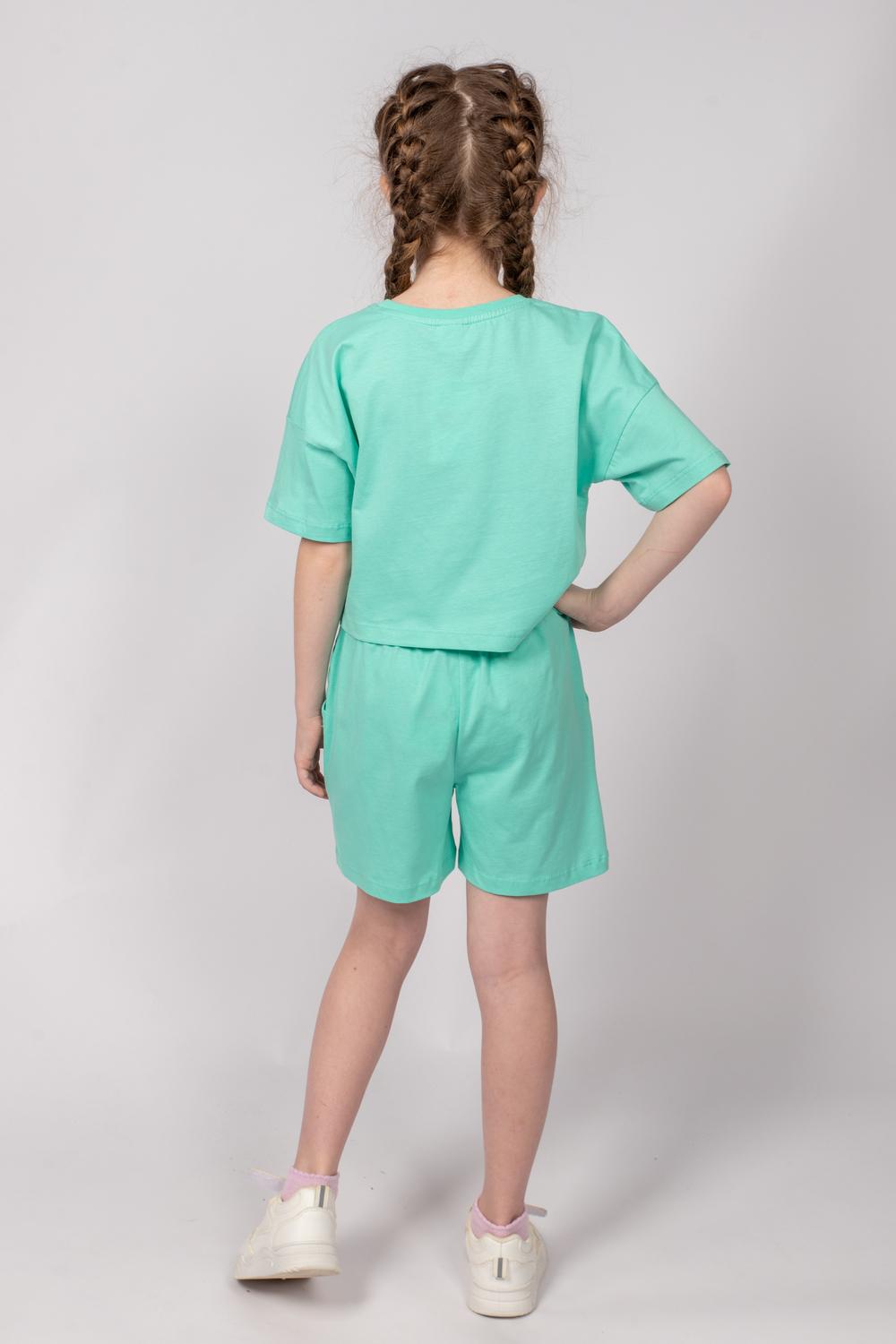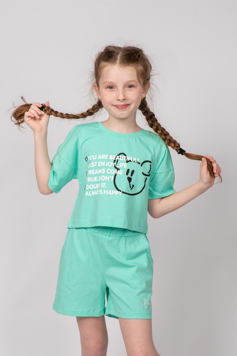 Модные и удобные трикотажные шортики - отличный выбор для девочек на летний сезон и для занятий спортом. В пояс вставлена эластична тесьма. На левой передней половинке шорт принт шелкография. Надпись переводится как "Красота".