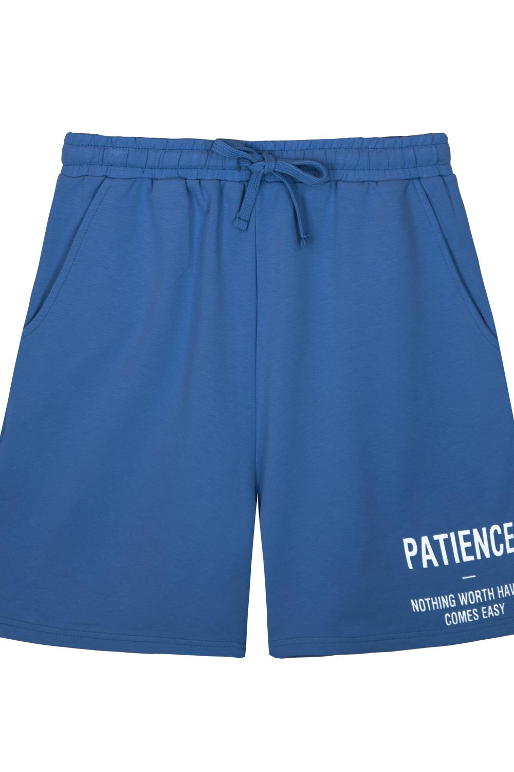 Шорты женские прямого силуэта. Отрезной пояс из основного полотна, с эластичной тесьмой закрепленной в шов. По поясу шорт вставлен плоский утягивающий шнурок, в цвет пояса. На передней половинке шорт выполнены карманы с отрезным бочком. Низ изделия обработан швом в подгибку. На левой передней половинке шорт принт шелкография. Надпись переводится как "Терпение; Ничто тоящее не делается легко". Модель рассчитана на рост 164-170см.