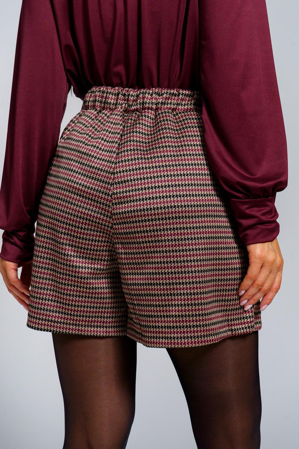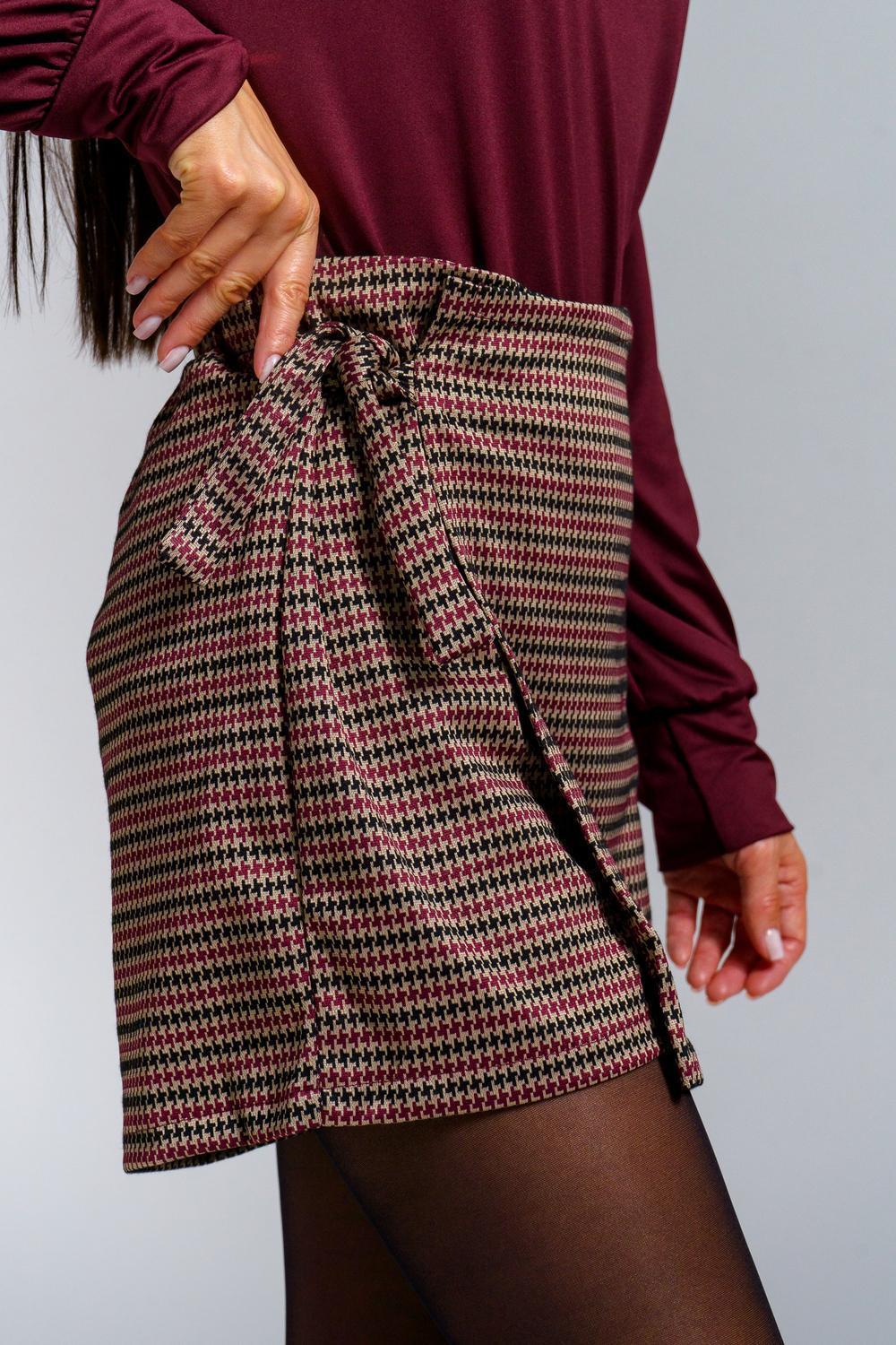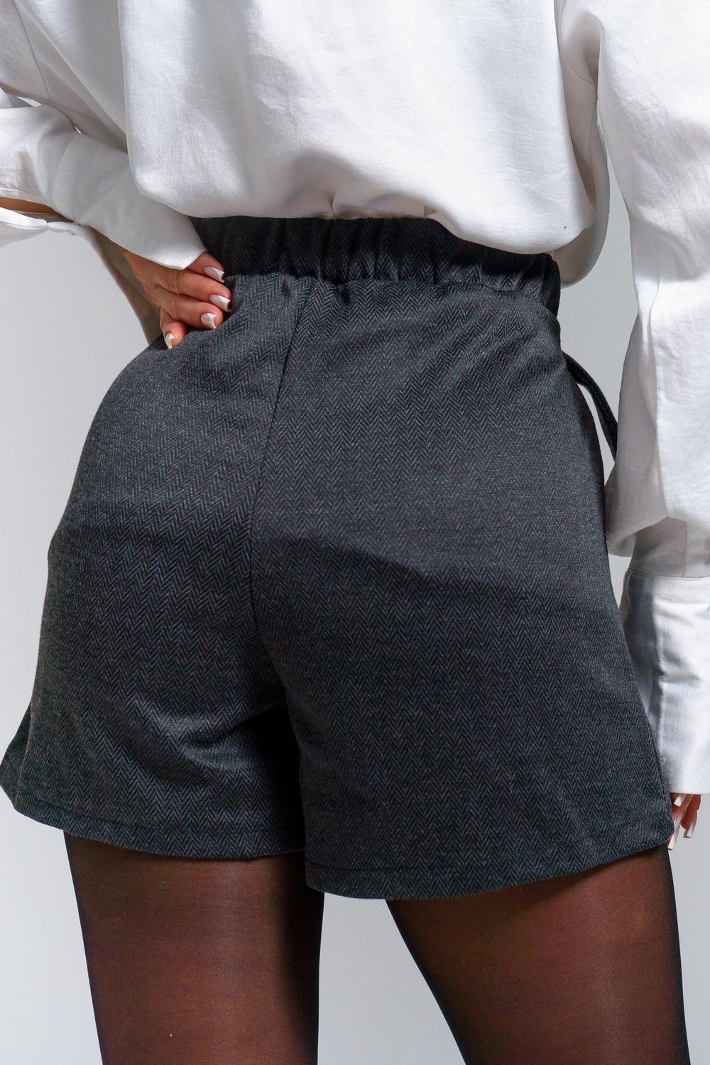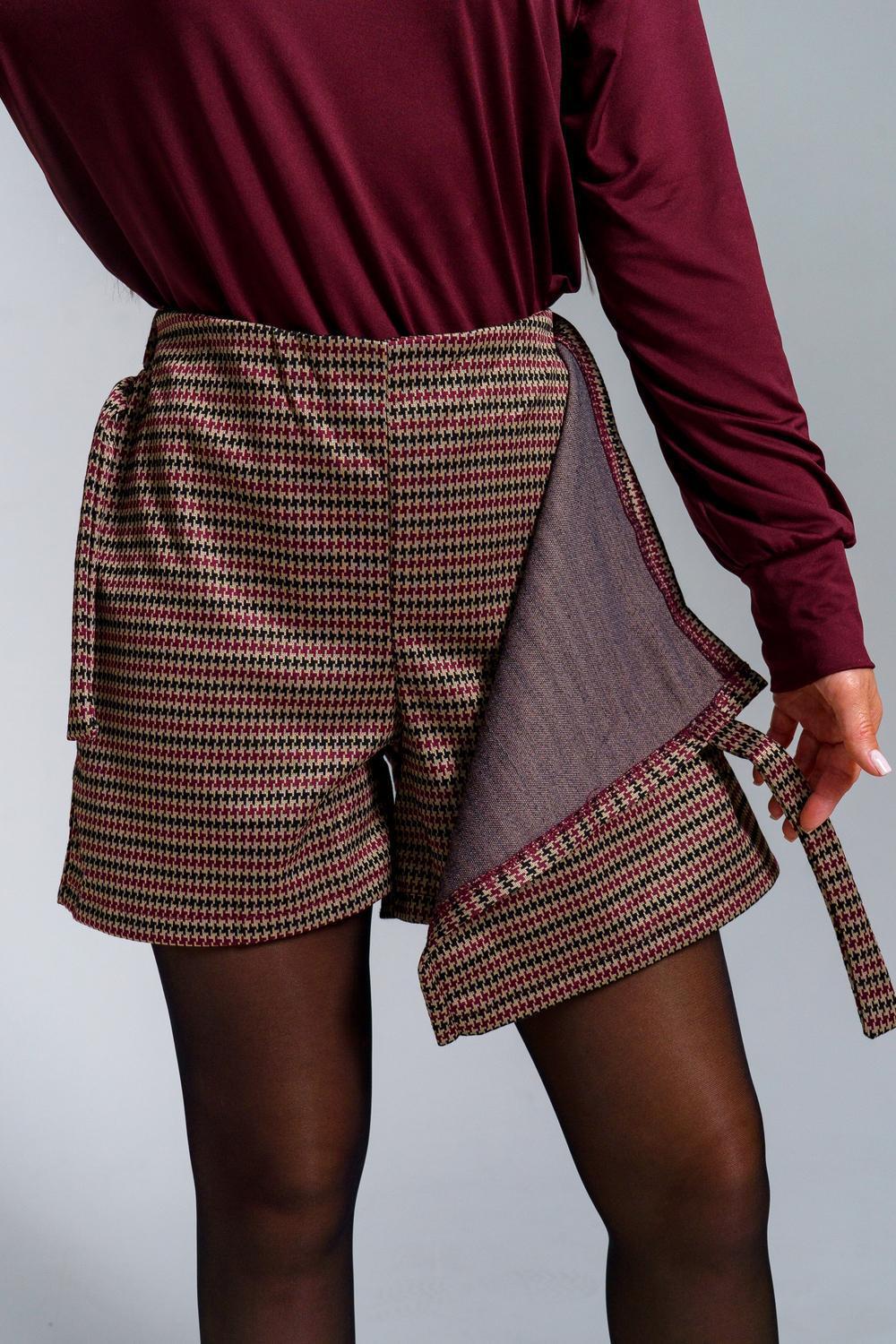 Юбка-шорты женские укороченные из костюмной ткани, спереди декоративный запах, фиксирующийся завязкой. Регулировка талии по спинке резинкой.