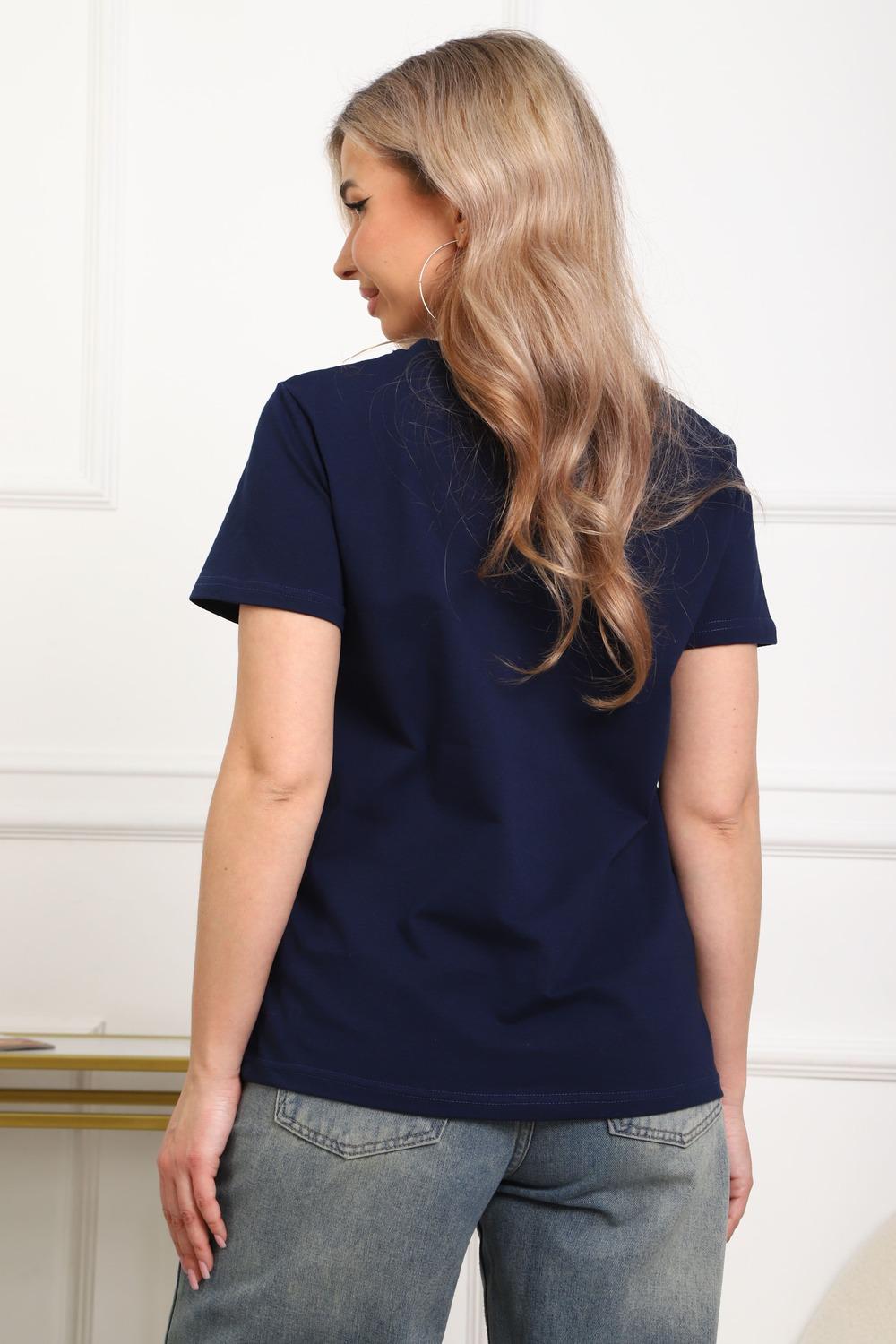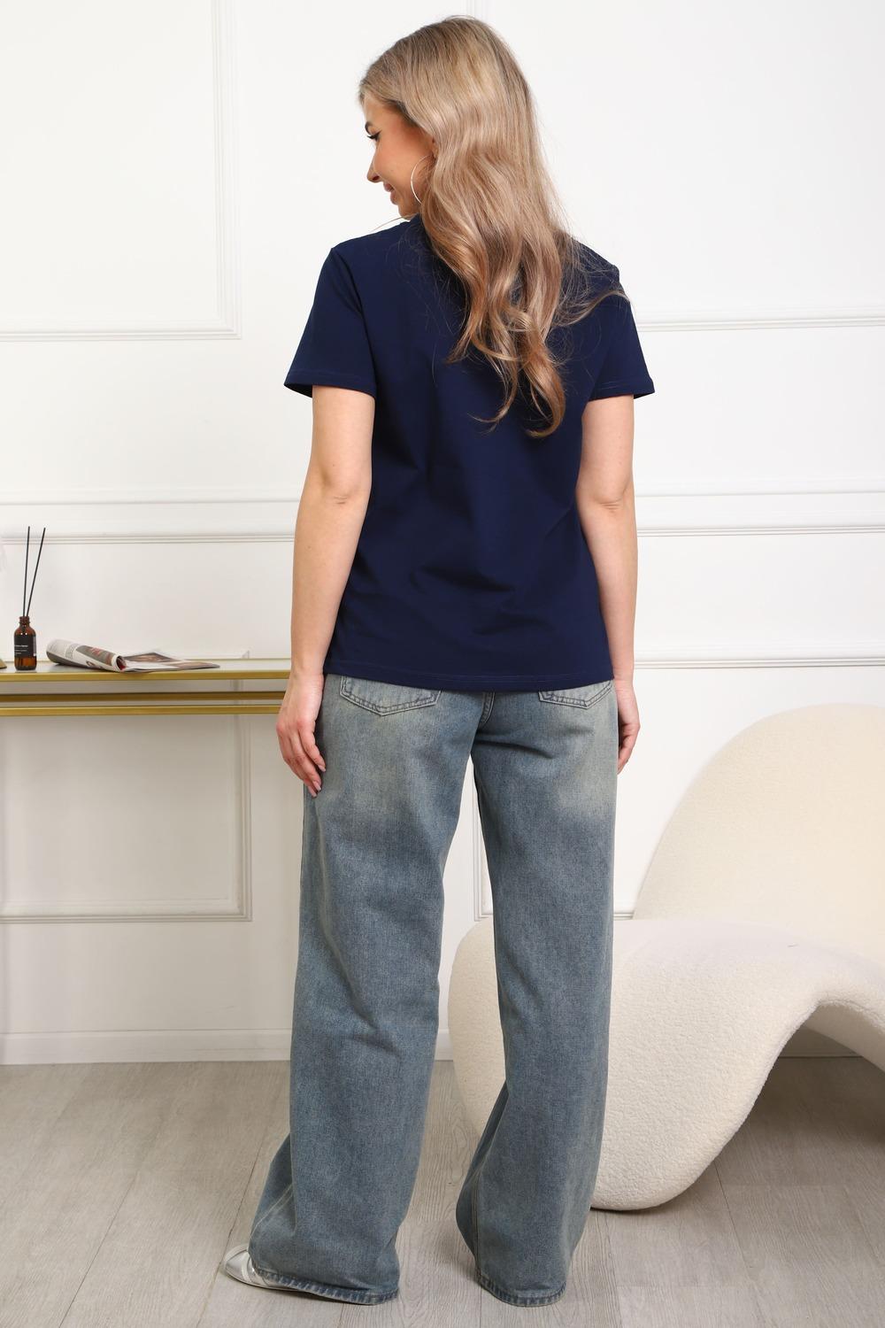 Футболка женская прямого силуэта. Низ изделия прямой. Длинна до середины бедра, плечо на естественном месте, рукав короткий. Горловина круглой формы, обработана планкой . Принт (шелкография пуф) в виде кружевного воротника.
