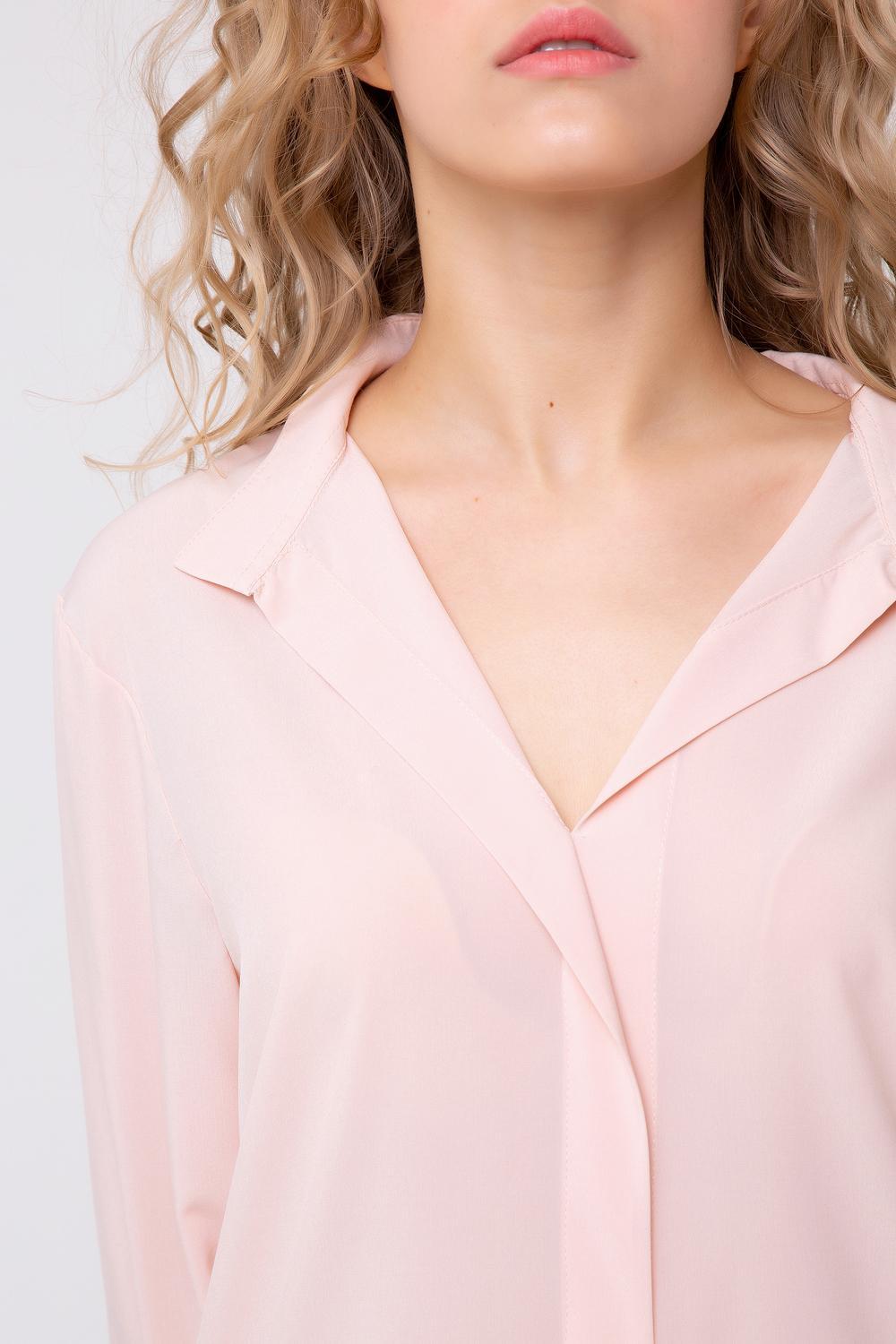Эффектная блуза прямого кроя. Выполнена в пастельном персиковом цвете. Вырез горловины V-образный, рубашечного типа. Имитация суппатной застежки. Изделие дополнено небольшими боковыми разрезами, а также лёгкой асимметрией по спинке. Такая модель составит эффектную комбинацию с кожаными лосинами или узкими брюками. Состав: ниагара/100% полиэстер. Длина изделия 80 см. Рост модели на фото 173 см.