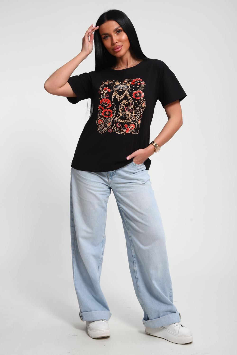 Футболка женская из гладкокрашенного трикотажа, хлопок 100%. Прямого силуэта, свободного облегания. горловина круглой формы. Рукав короткий. Низ изделия прямой. На полочке принт, шелкография.