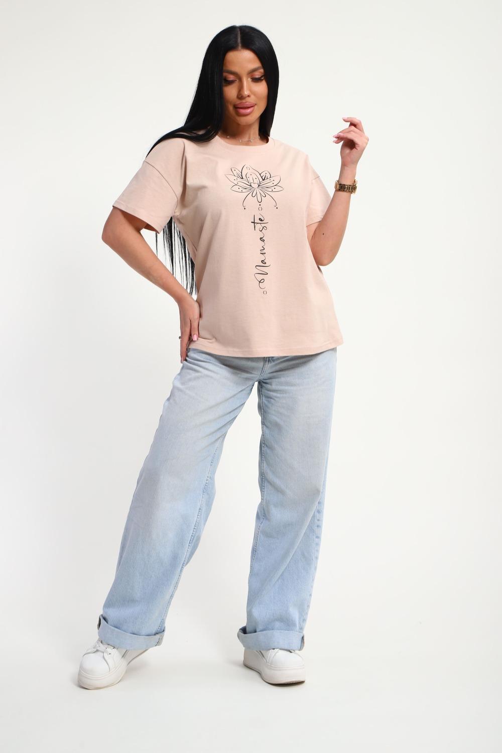 Футболка женская из гладкокрашенного трикотажа, хлопок 100%. Прямого силуэта, свободного облегания. горловина круглой формы. Рукав короткий. Низ изделия прямой. На полочке принт, шелкография.
