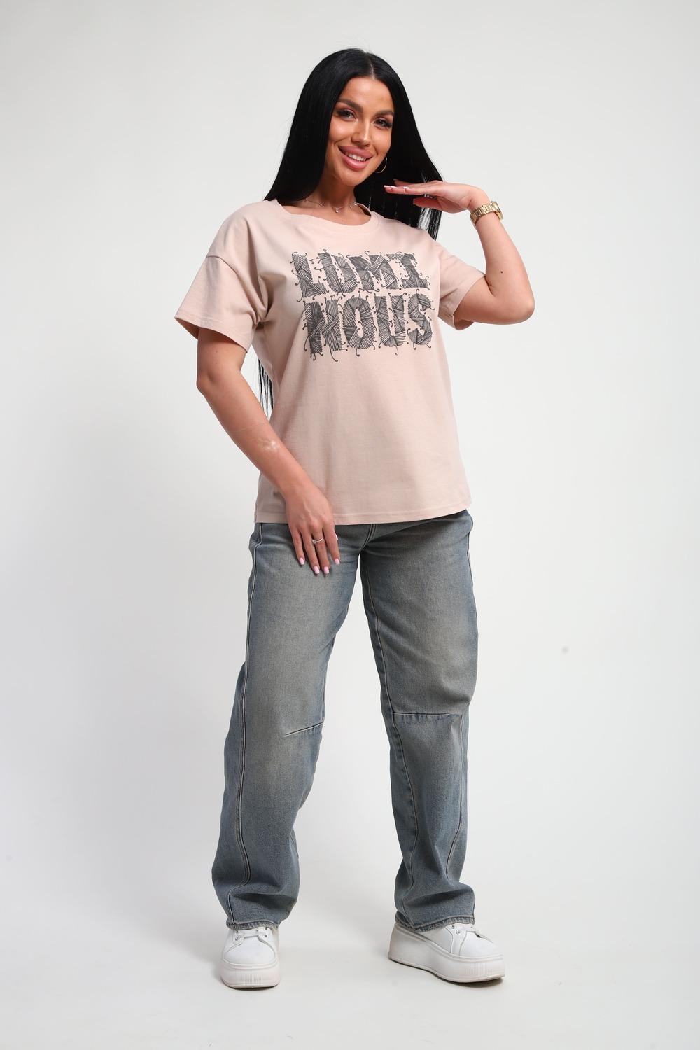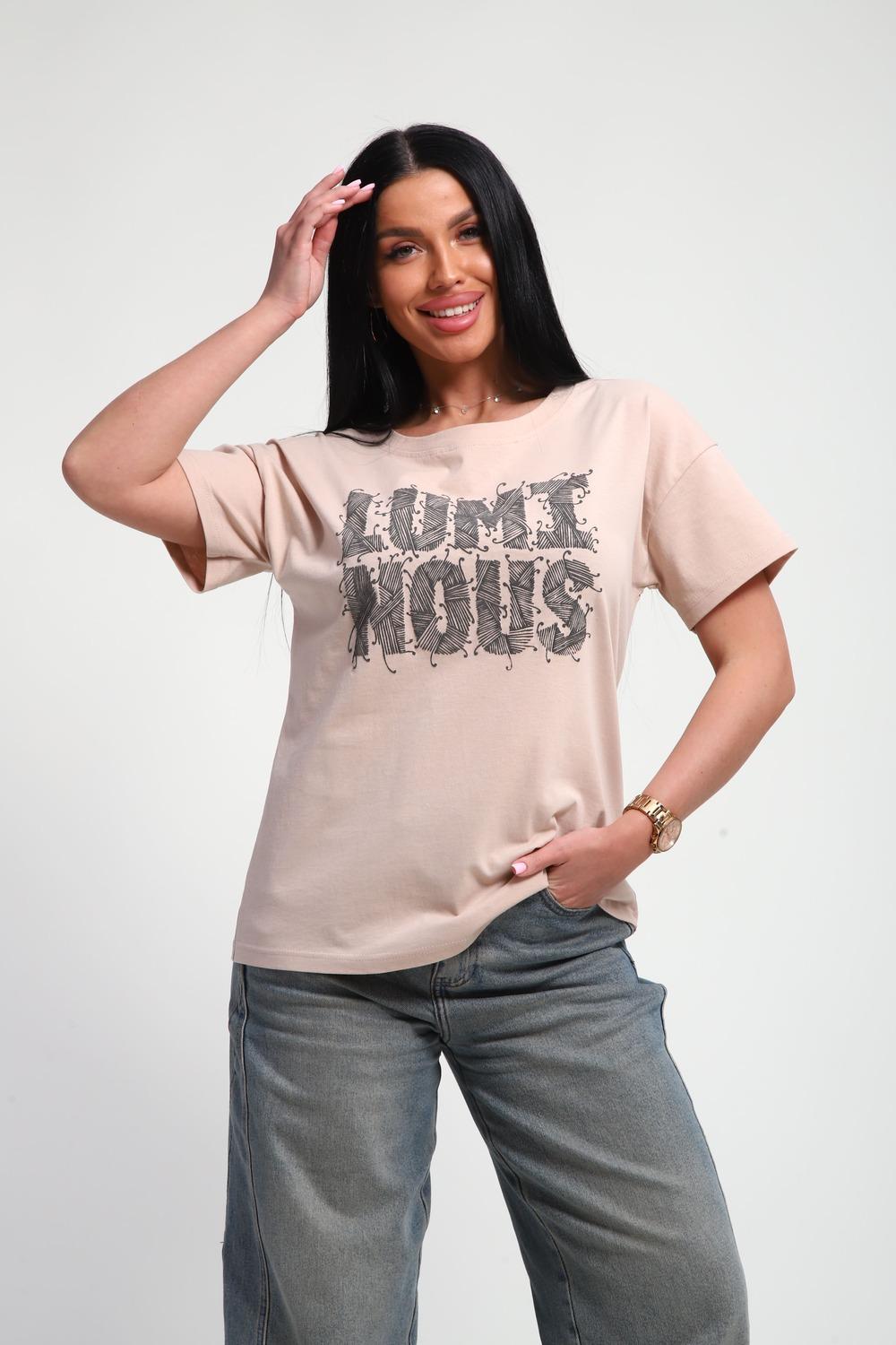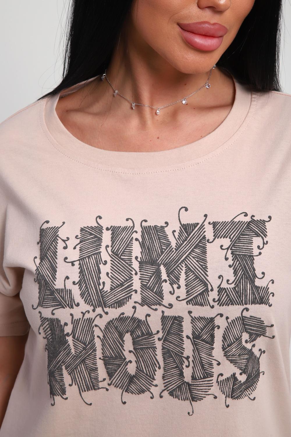 Футболка женская из гладкокрашенного трикотажа, хлопок 100%. Прямого силуэта, свободного облегания. горловина круглой формы. Рукав короткий. Низ изделия прямой. На полочке объемный принт, шелкография.