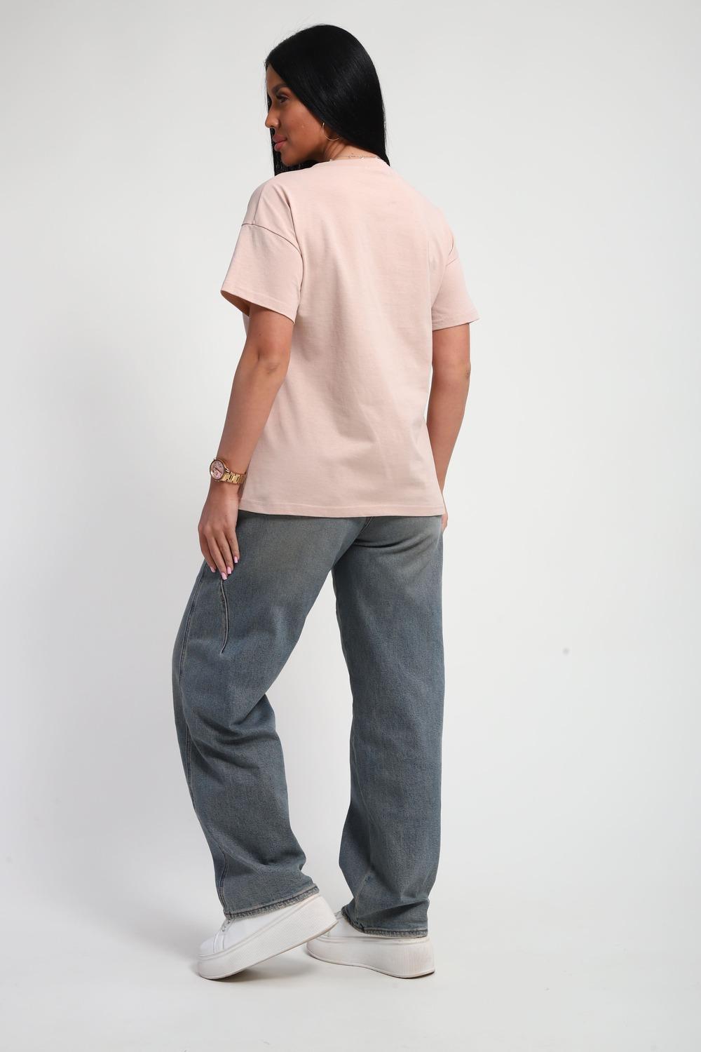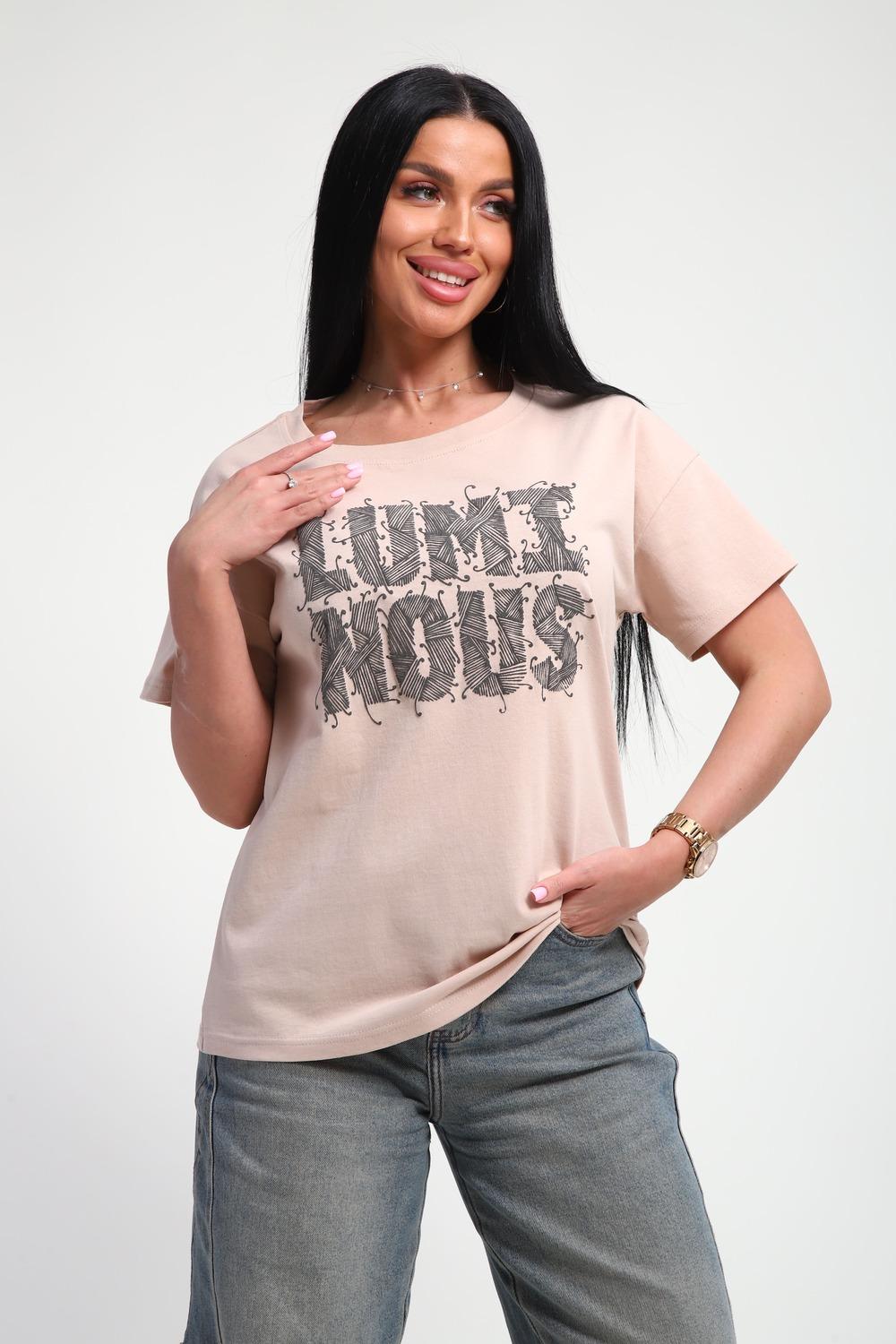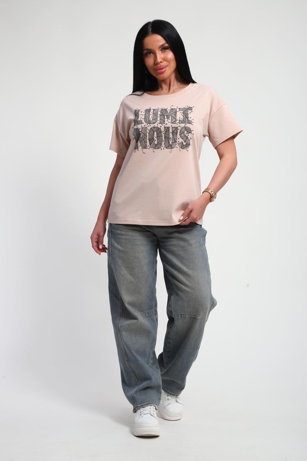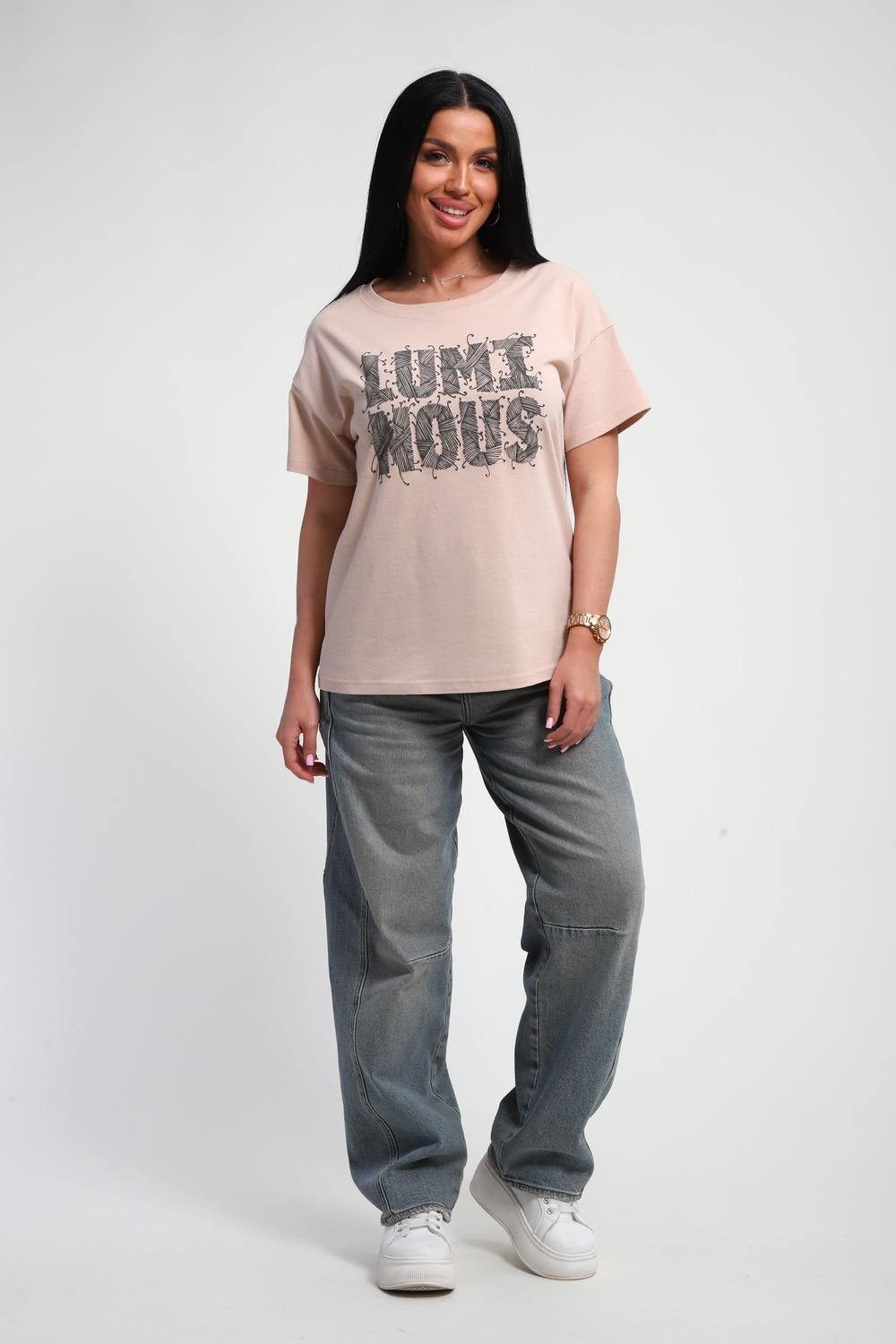 Футболка женская из гладкокрашенного трикотажа, хлопок 100%. Прямого силуэта, свободного облегания. горловина круглой формы. Рукав короткий. Низ изделия прямой. На полочке объемный принт, шелкография.