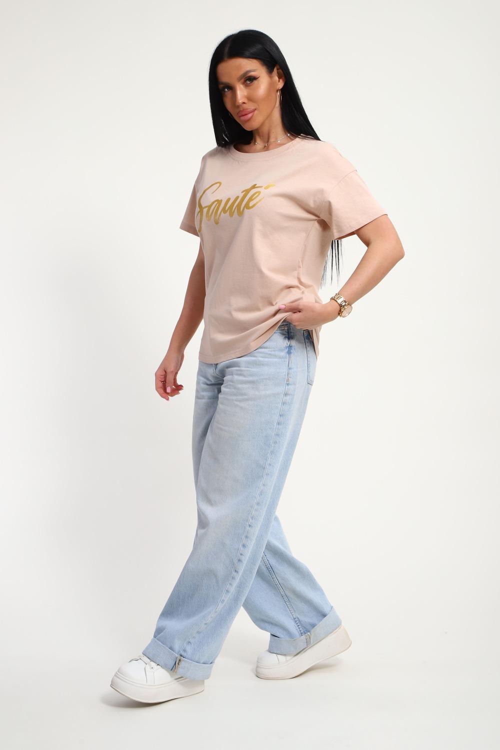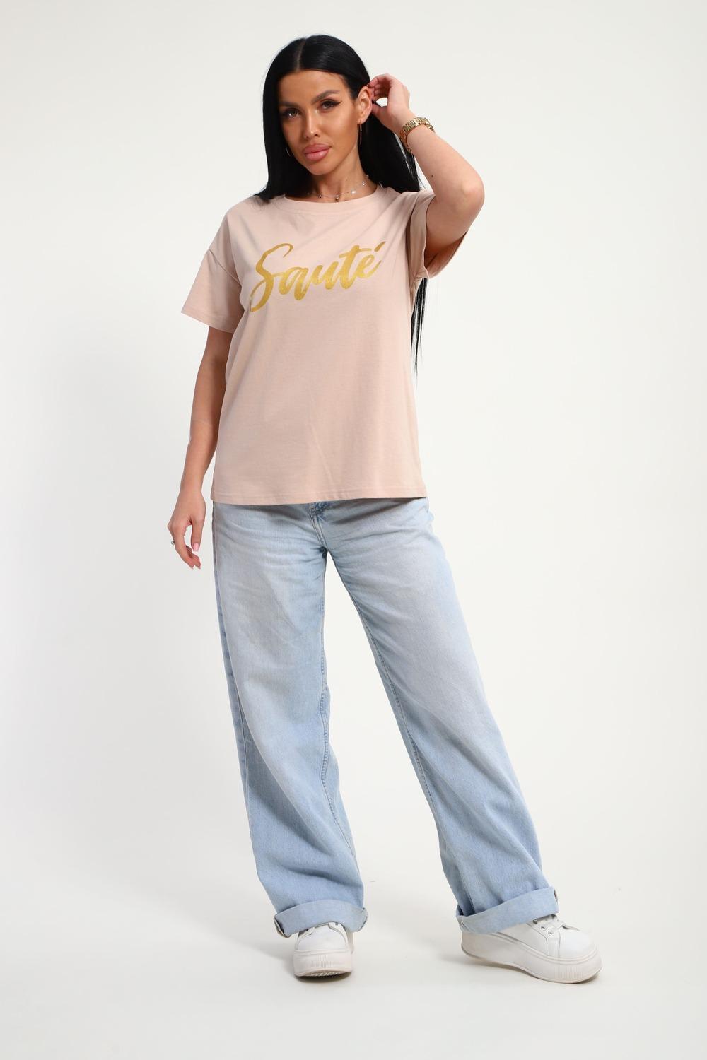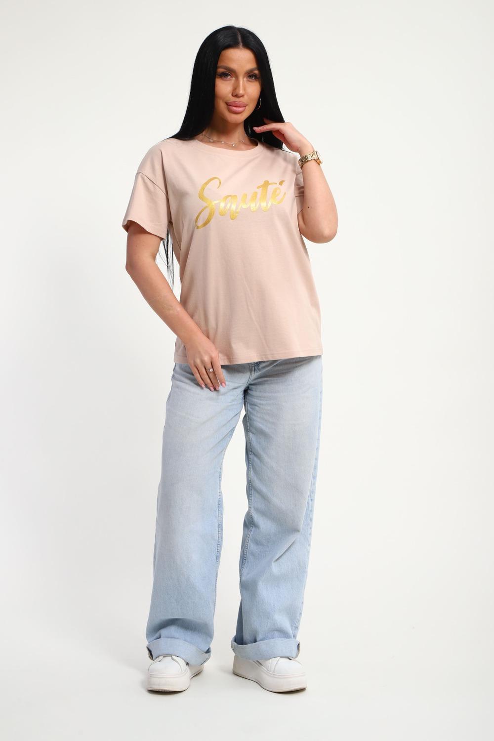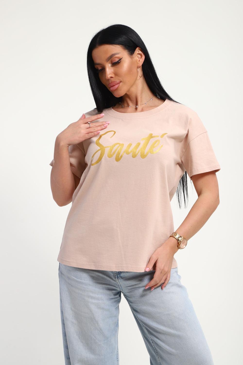 Футболка женская из гладкокрашенного трикотажа, хлопок 100%. Прямого силуэта, свободного облегания. горловина круглой формы. Рукав короткий. Низ изделия прямой. На полочке принт, шелкография.