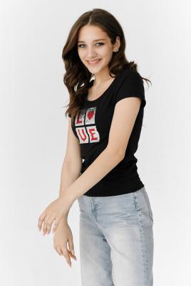 Футболка женская из гладкокрашенного трикотажа, хлопок 100%. Прямого силуэта, свободного облегания. горловина круглой формы. Рукав короткий. Низ изделия прямой. На полочке объемный принт, шелкография.