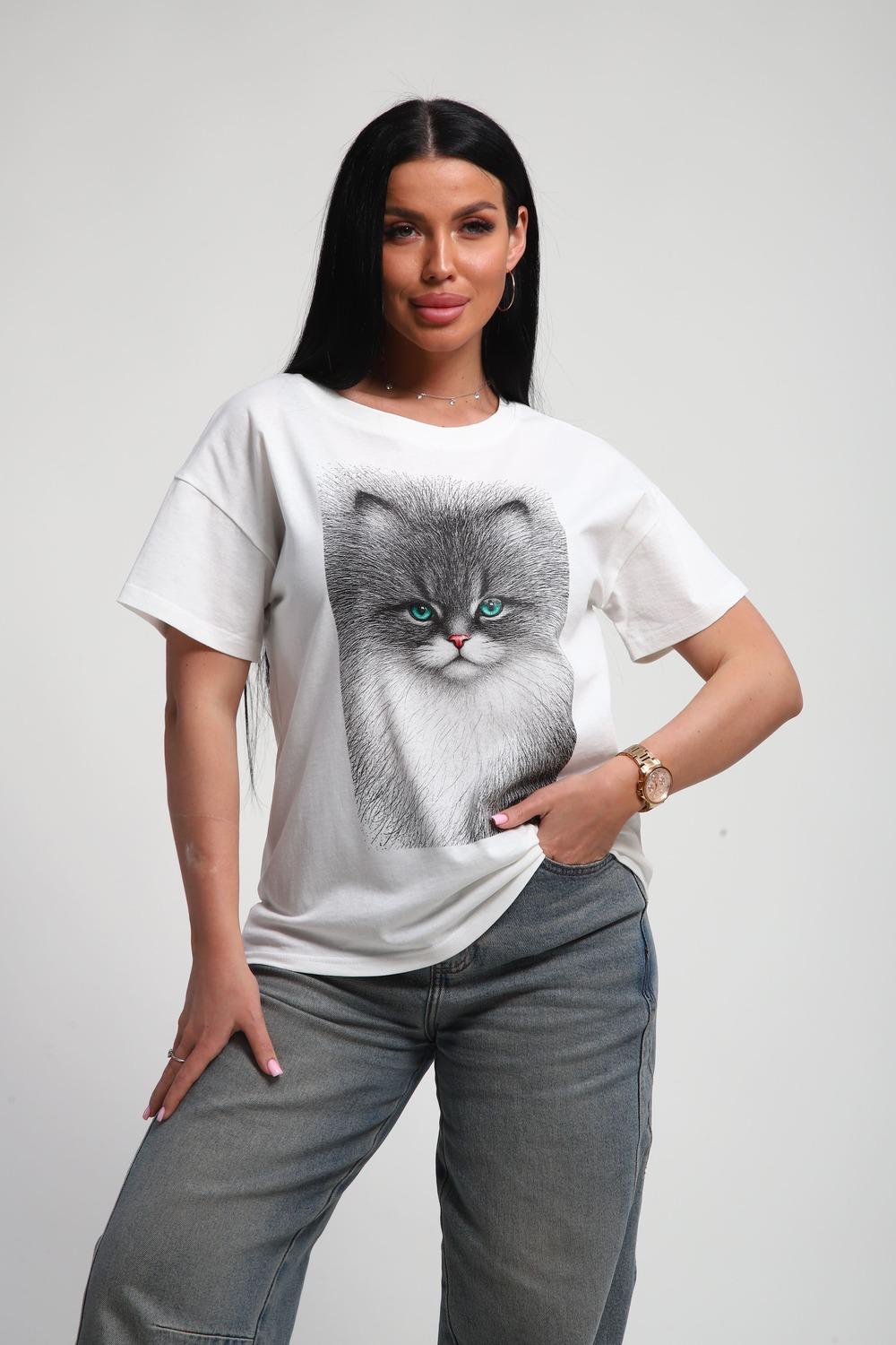 Футболка женская из гладкокрашенного трикотажа, хлопок 100%. Прямого силуэта, свободного облегания. горловина круглой формы. Рукав короткий. Низ изделия прямой. На полочке принт, шелкография.