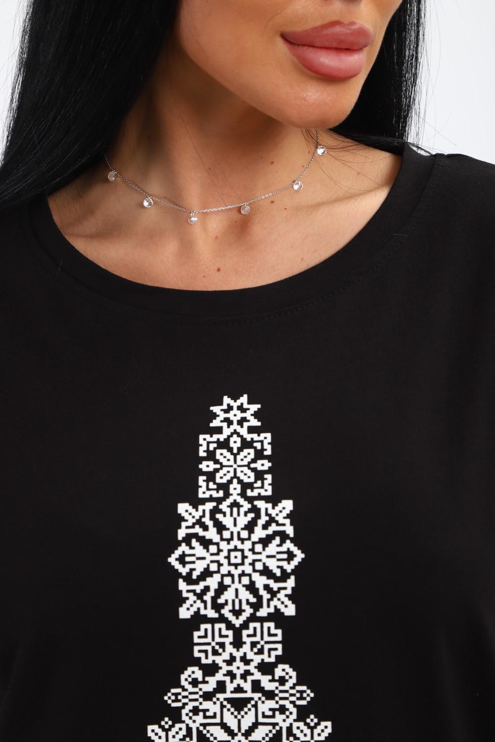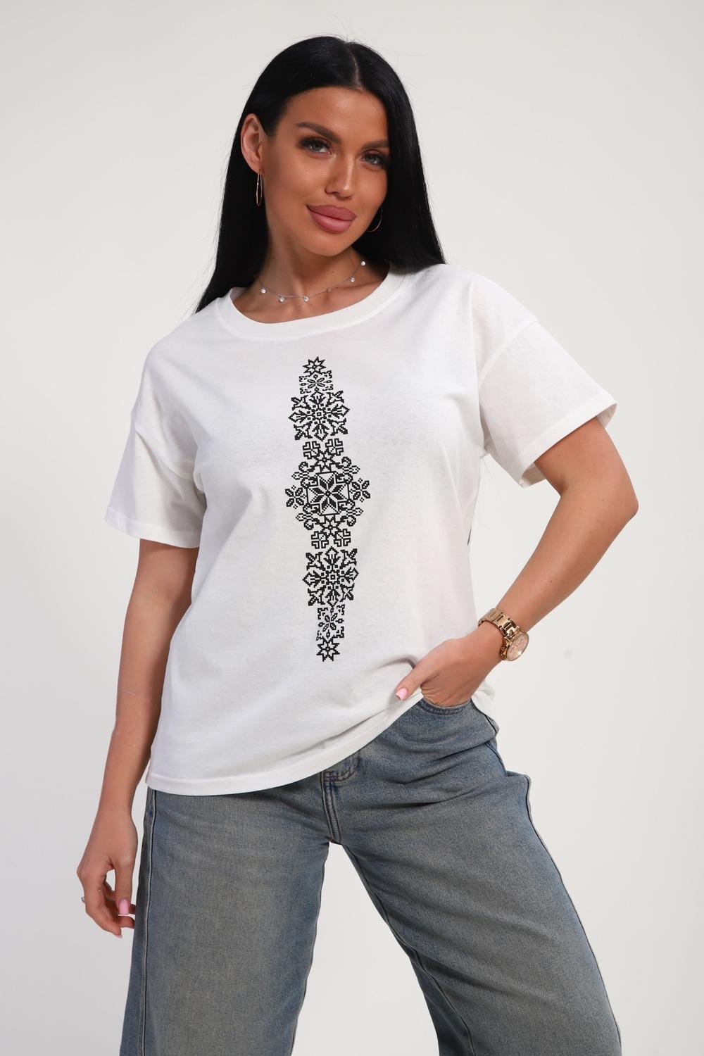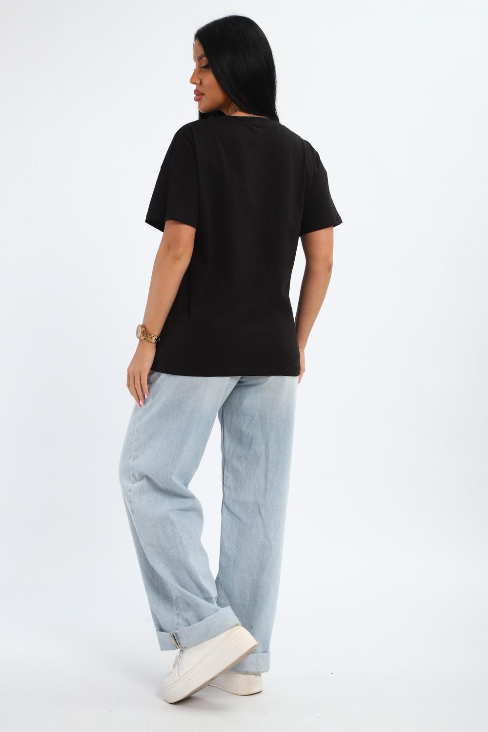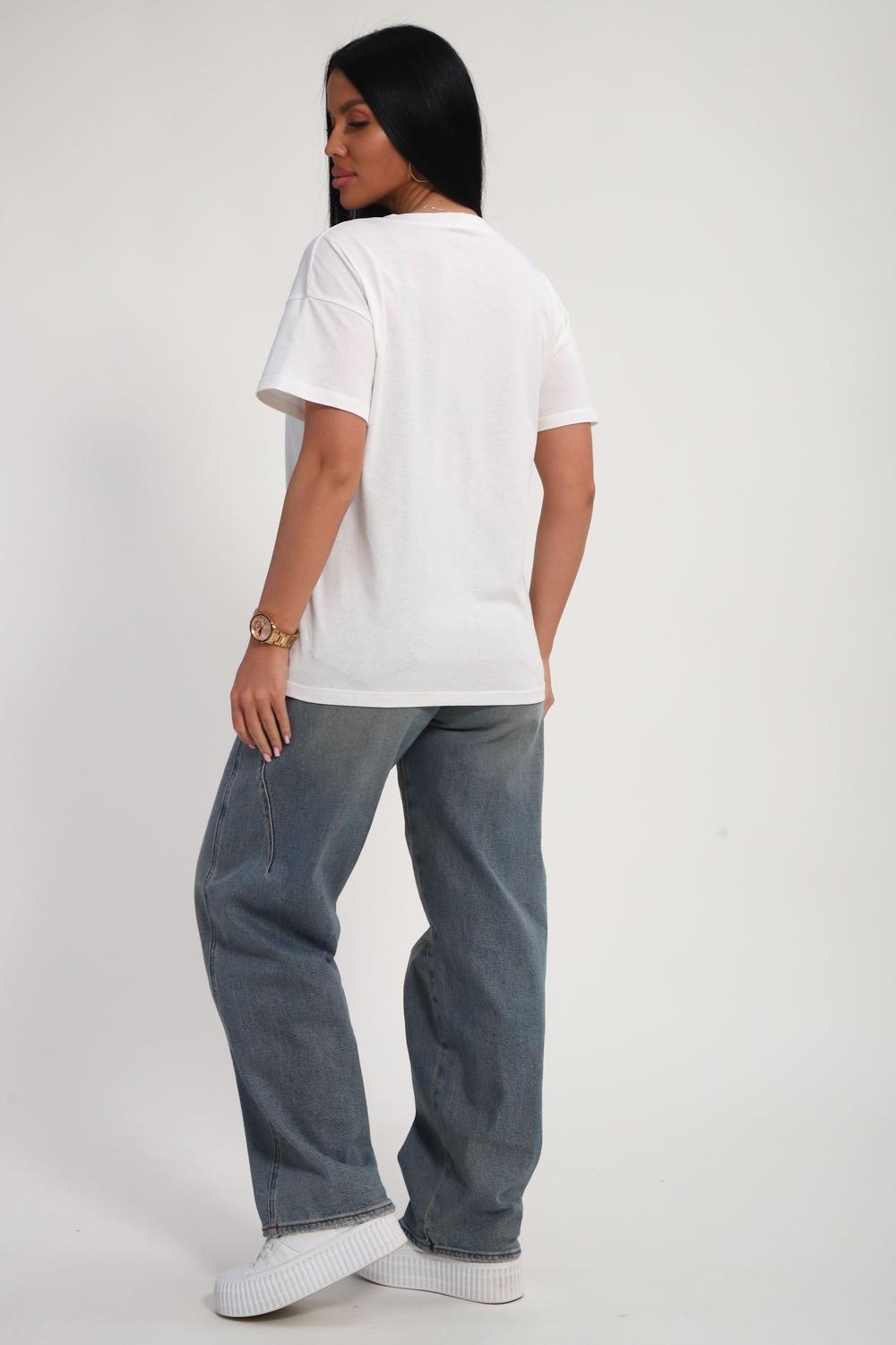 Футболка женская из гладкокрашенного трикотажа, хлопок 100%. Прямого силуэта, свободного облегания, горловина круглой формы. Рукав короткий. Низ изделия прямой. На полочке принт, шелкография.