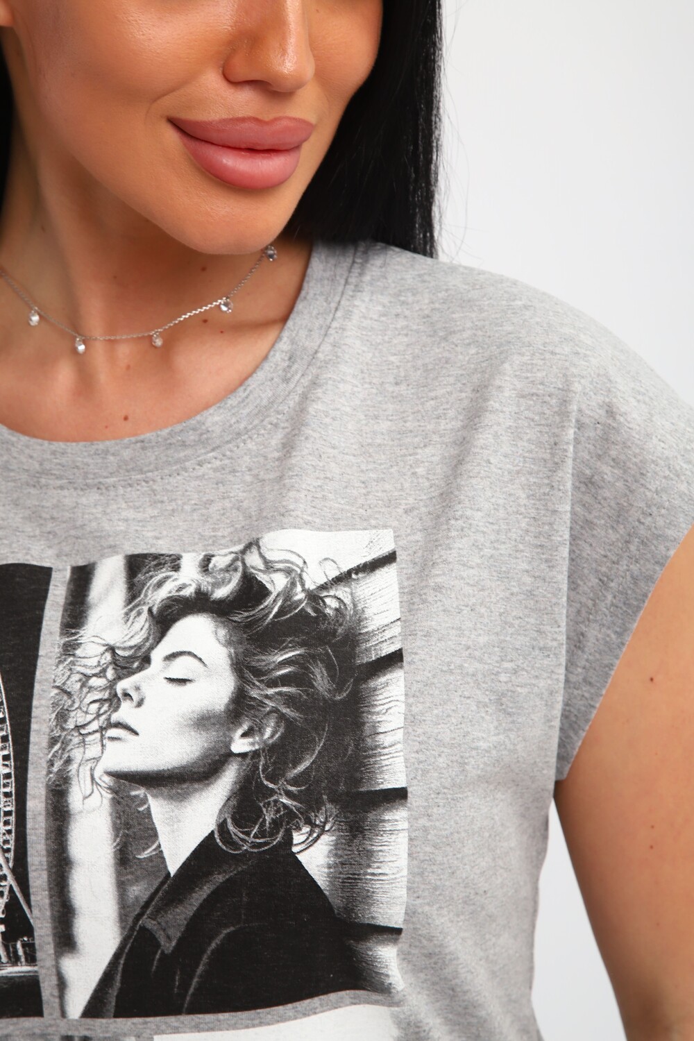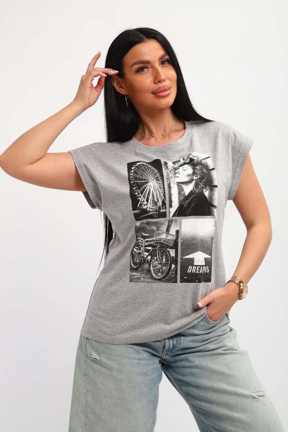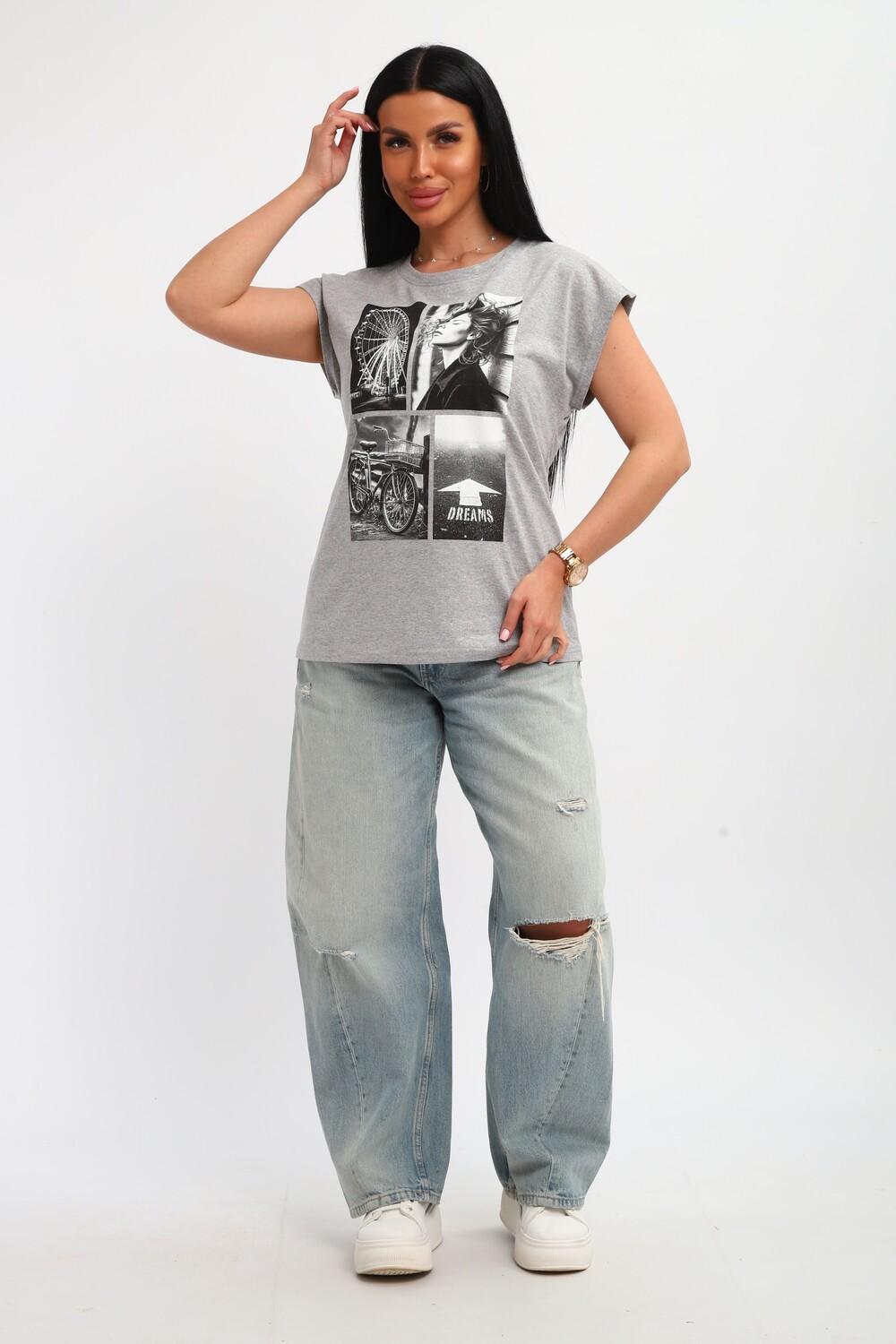 Футболка женская, изготовлена из меланжированного трикотажа. Горловина круглой формы, плечо спущено, без рукава. Низ изделия прямой. На полочке эффектный принт, выполненный методом шелкографии.