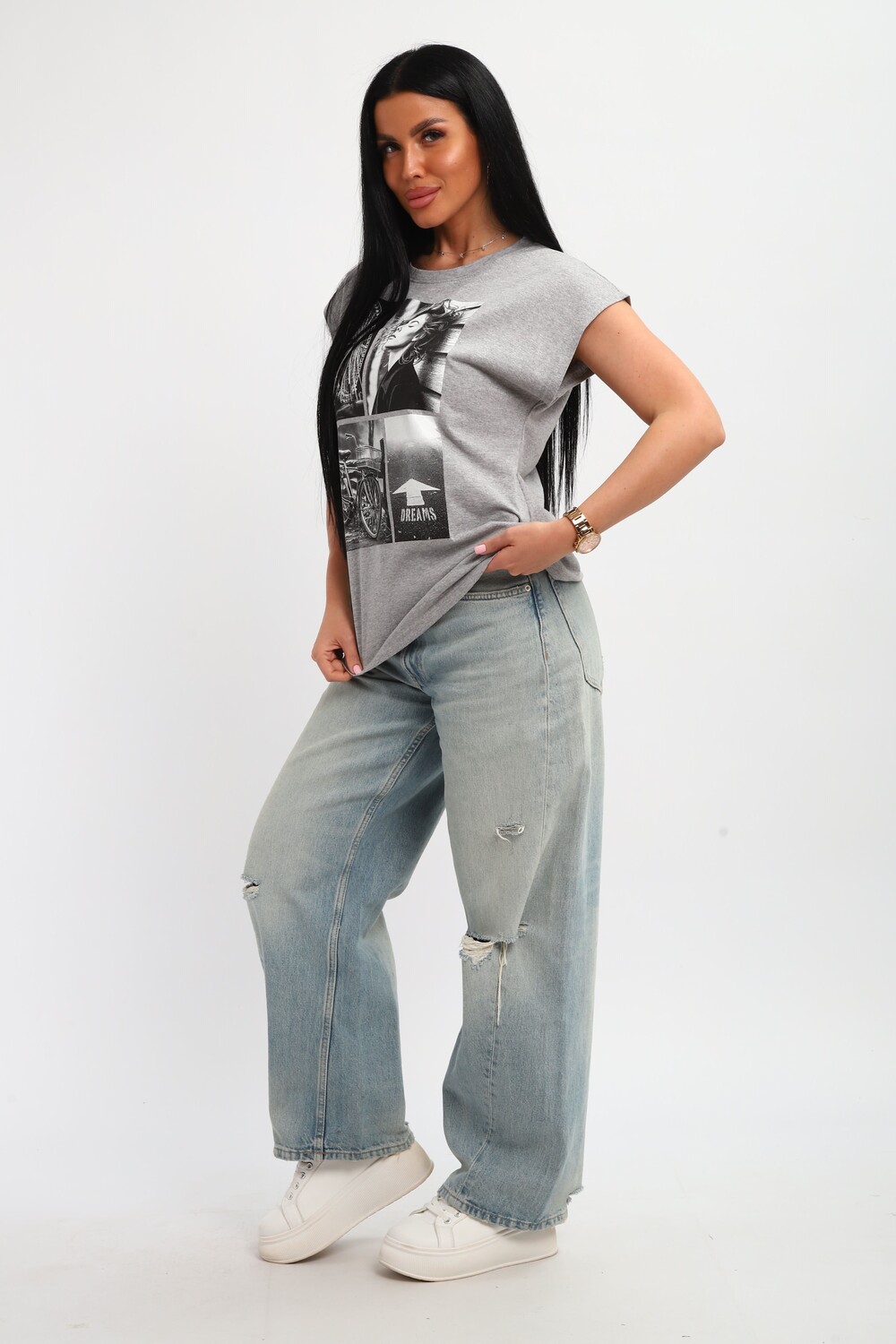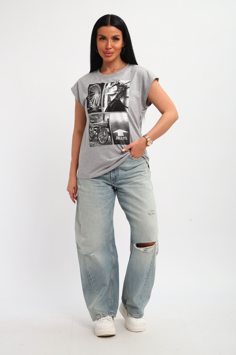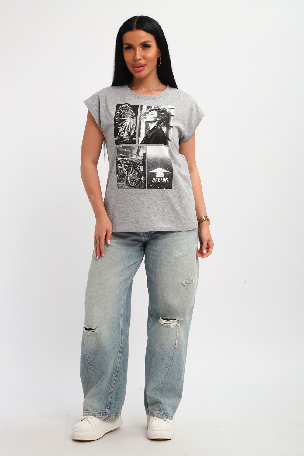 Футболка женская, изготовлена из меланжированного трикотажа. Горловина круглой формы, плечо спущено, без рукава. Низ изделия прямой. На полочке эффектный принт, выполненный методом шелкографии.