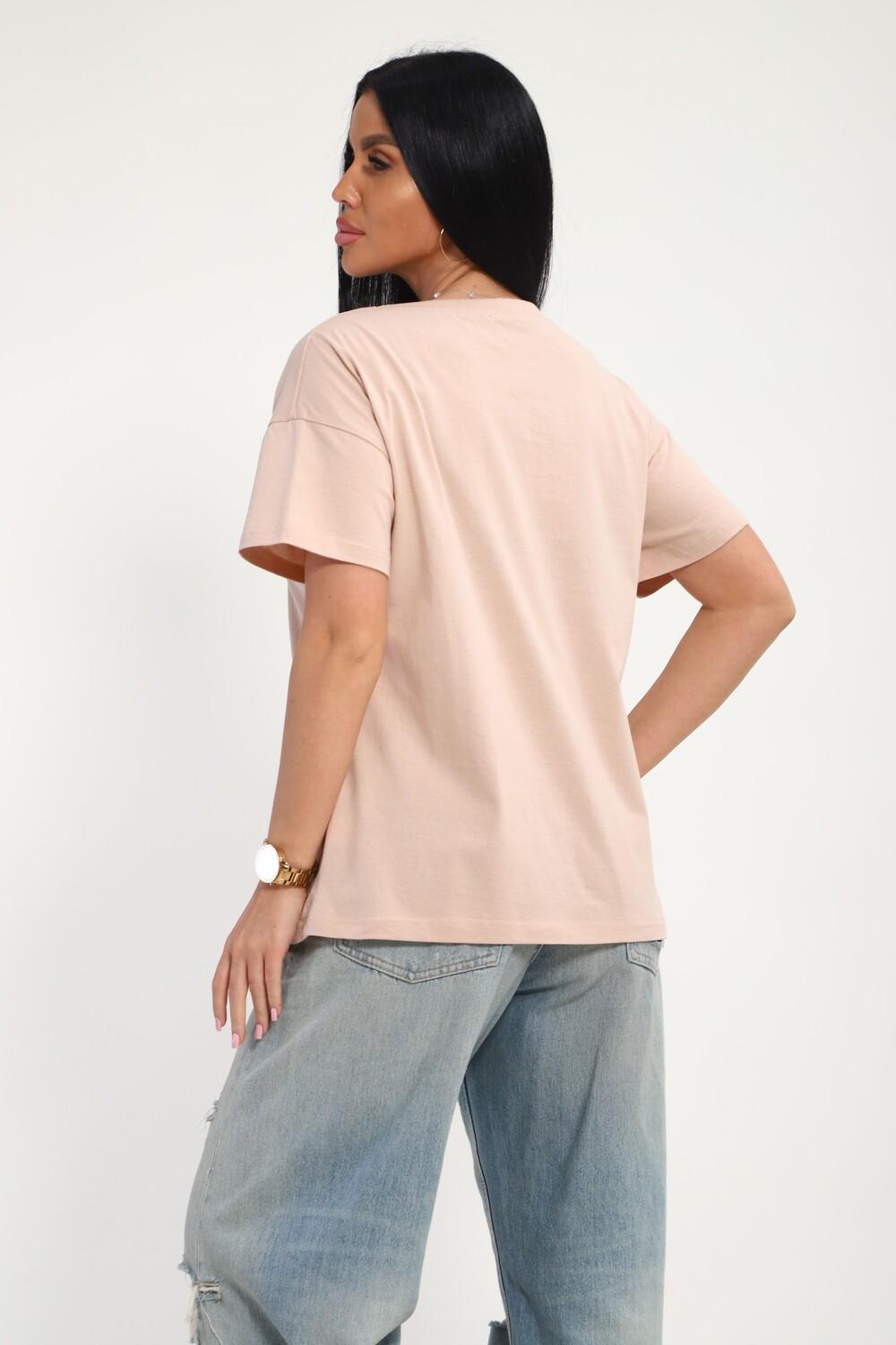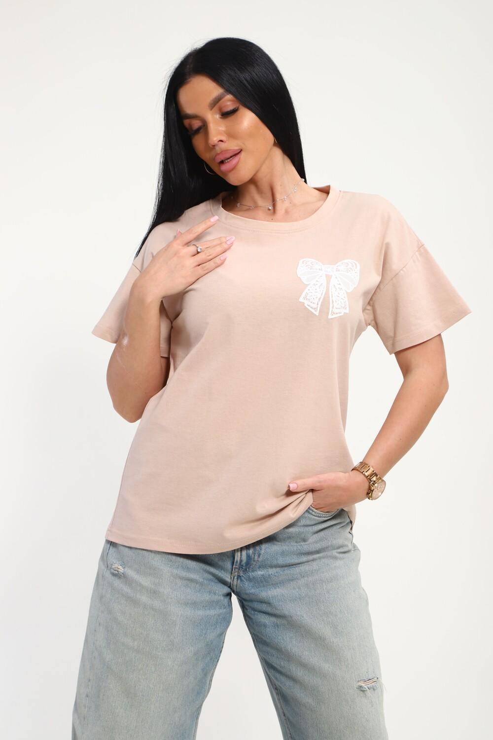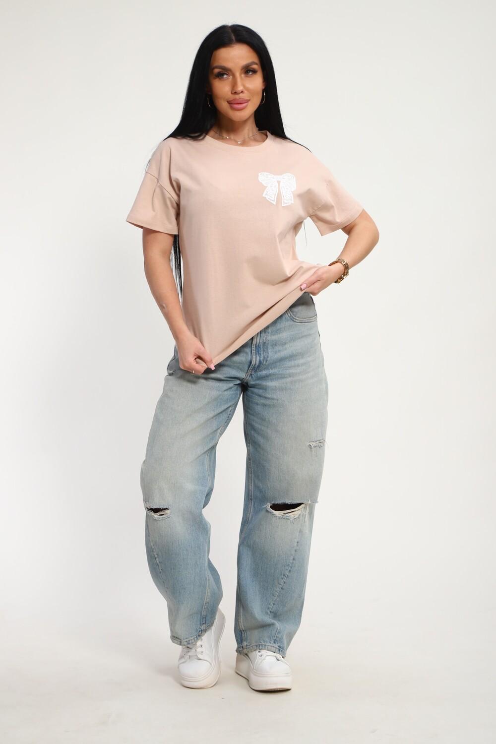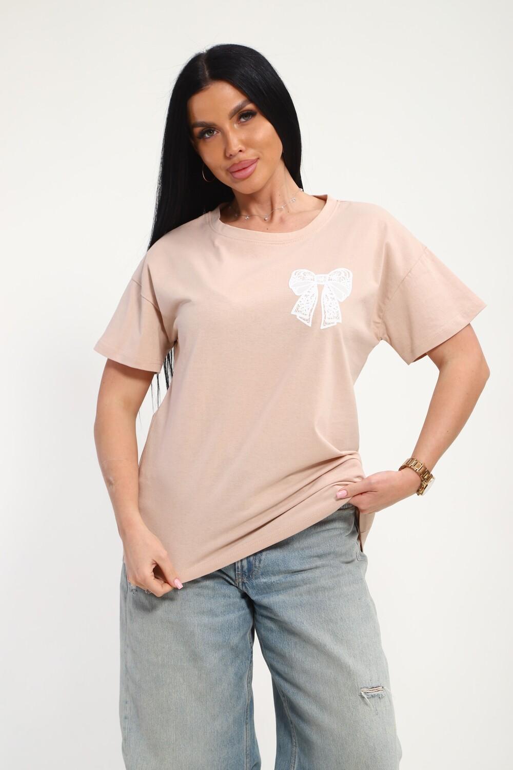 Футболка женская из гладкокрашеного трикотажа, хлопок 100%. Прямого силуэта, свободного облегания, горловина круглой формы. Рукав короткий. Низ изделия прямой. На полочке принт, шелкография.