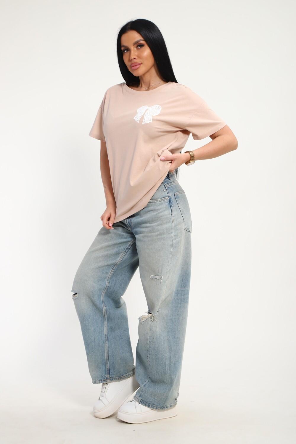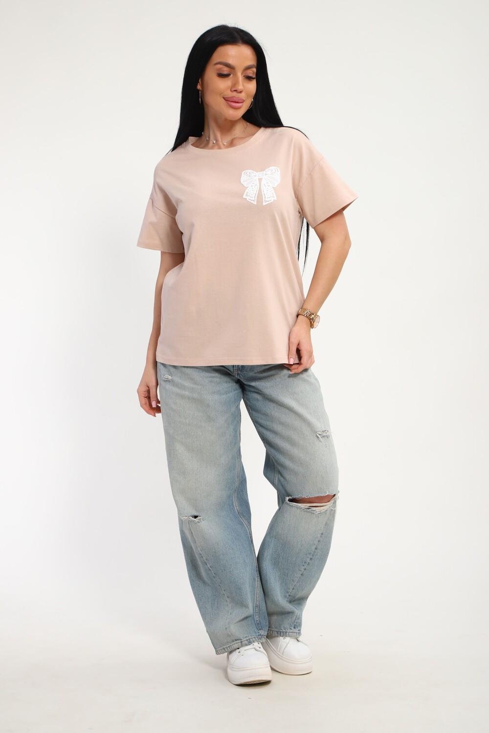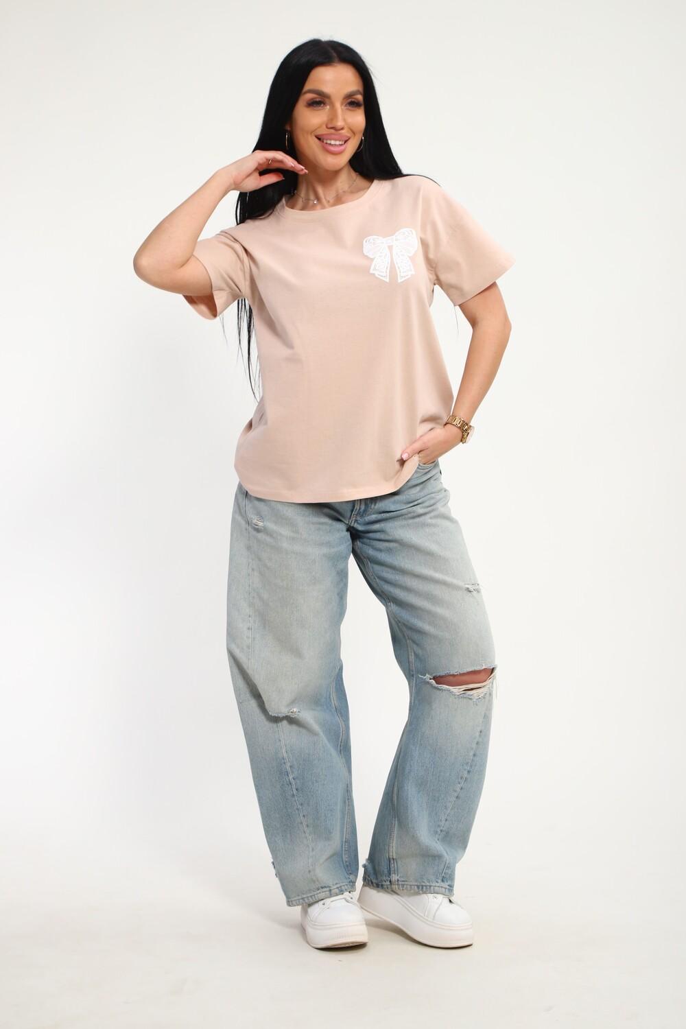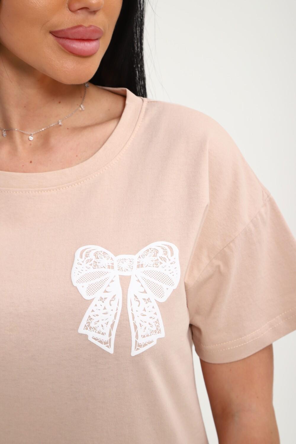 Футболка женская из гладкокрашеного трикотажа, хлопок 100%. Прямого силуэта, свободного облегания, горловина круглой формы. Рукав короткий. Низ изделия прямой. На полочке принт, шелкография.