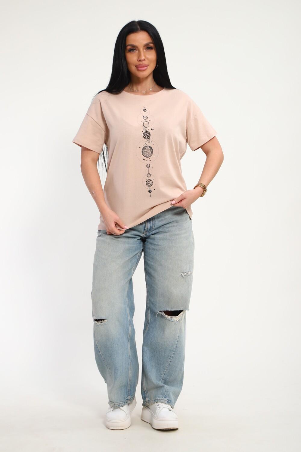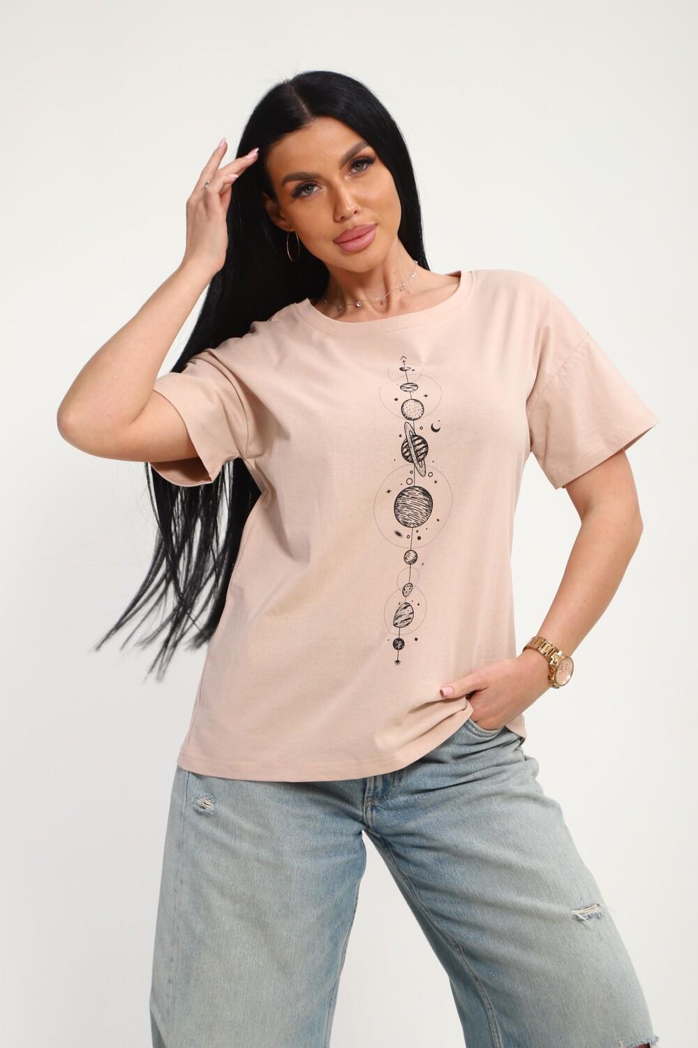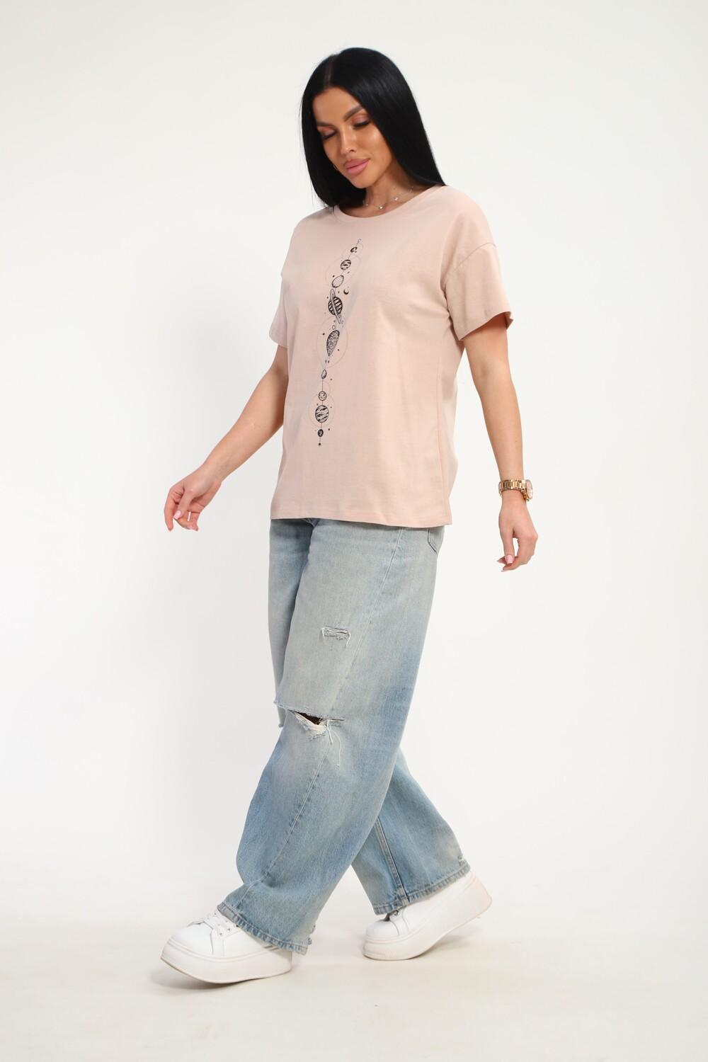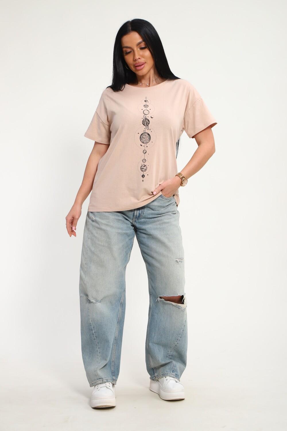 Футболка женская из гладкокрашеного трикотажа, хлопок 100%. Прямого силуэта, свободного облегания, горловина круглой формы. Рукав короткий. Низ изделия прямой. На полочке принт, шелкография.