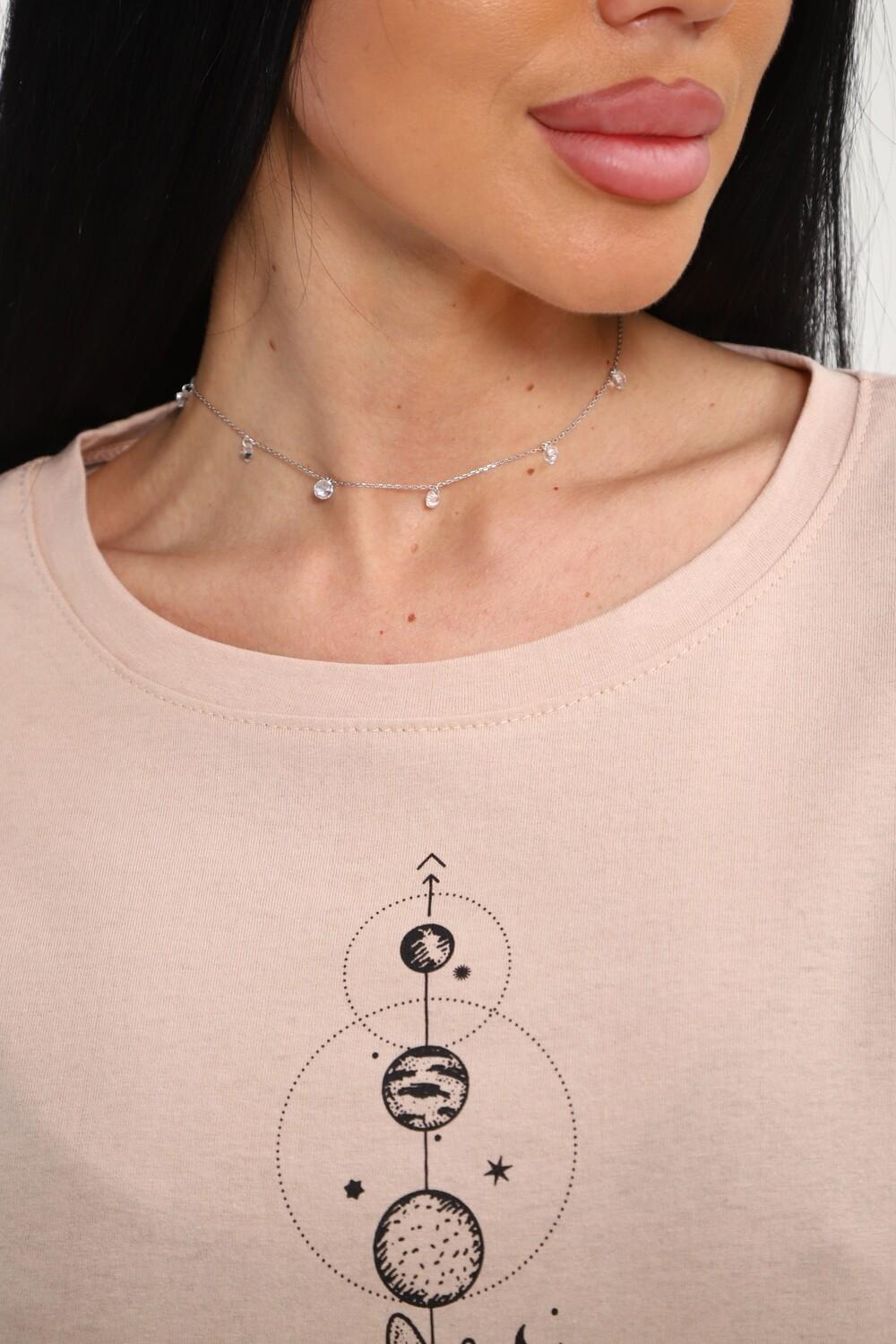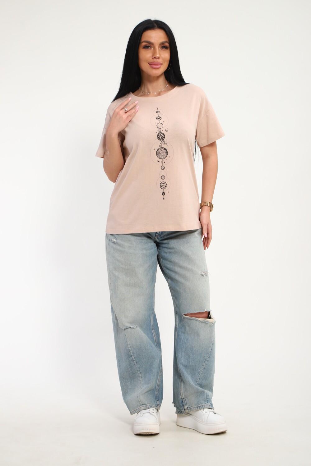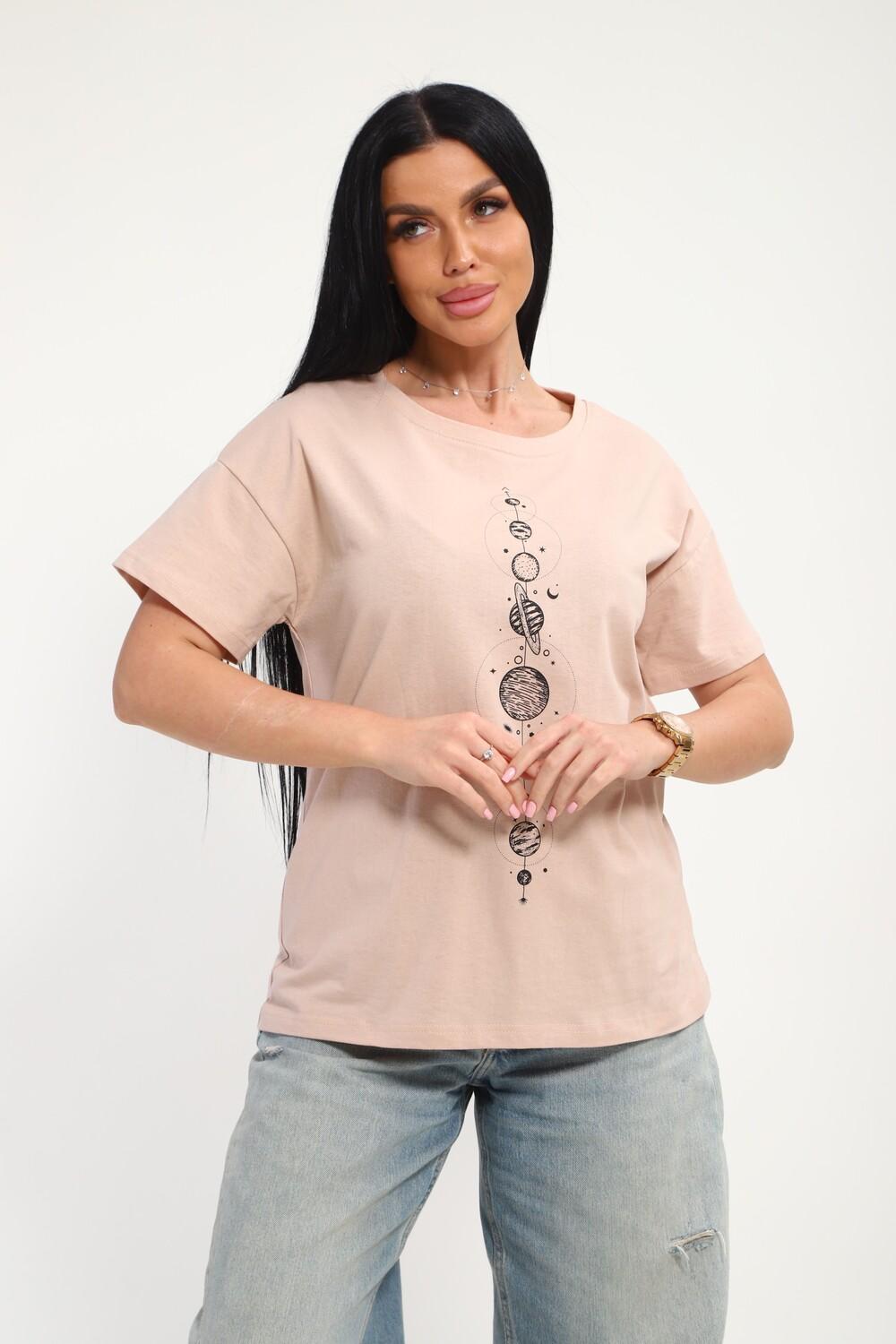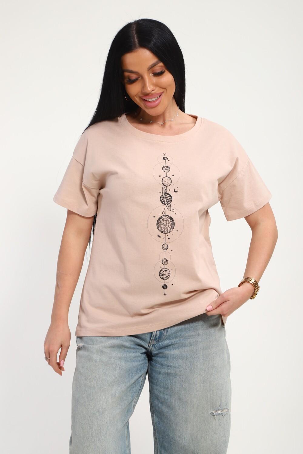 Футболка женская из гладкокрашеного трикотажа, хлопок 100%. Прямого силуэта, свободного облегания, горловина круглой формы. Рукав короткий. Низ изделия прямой. На полочке принт, шелкография.