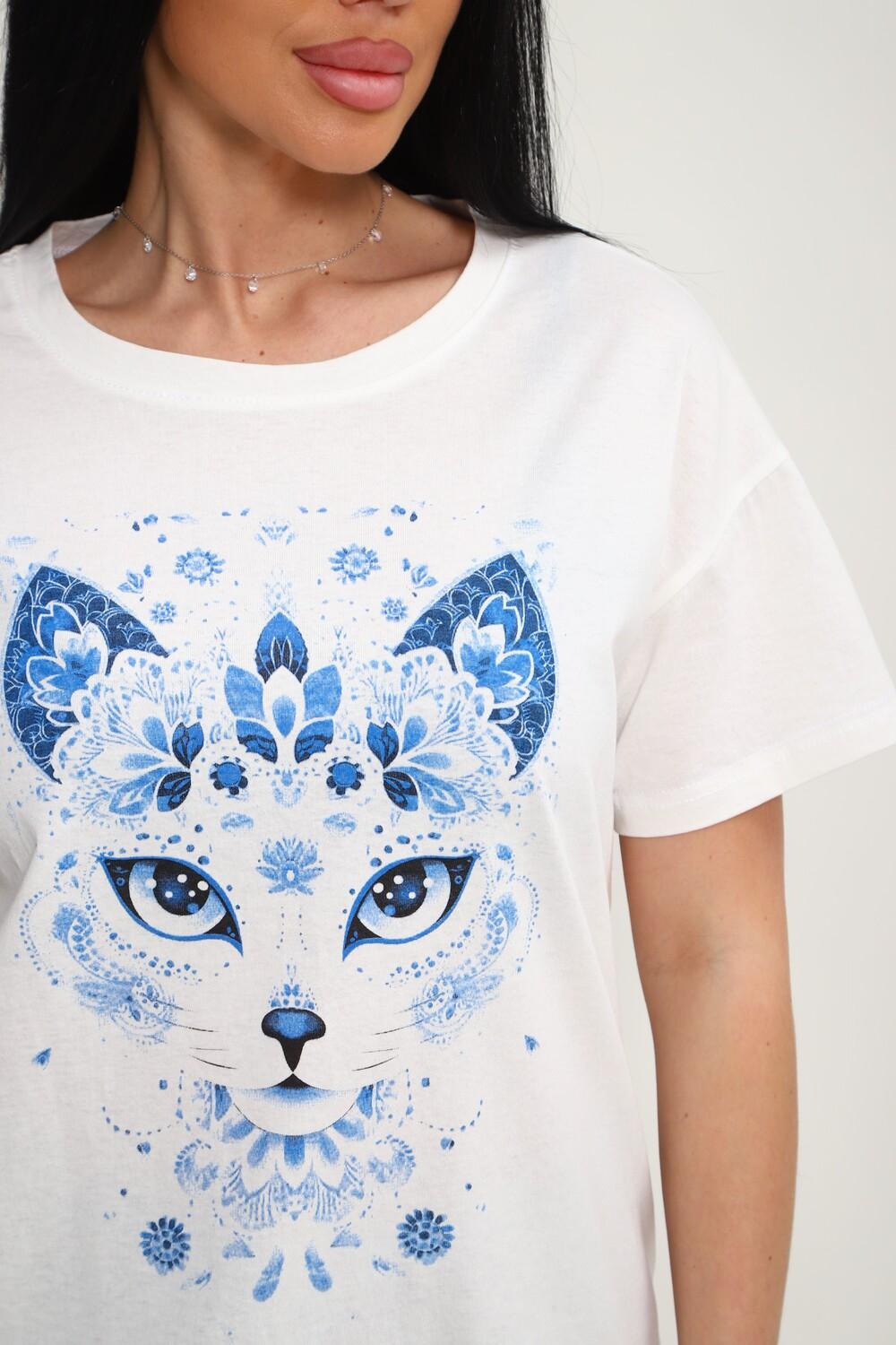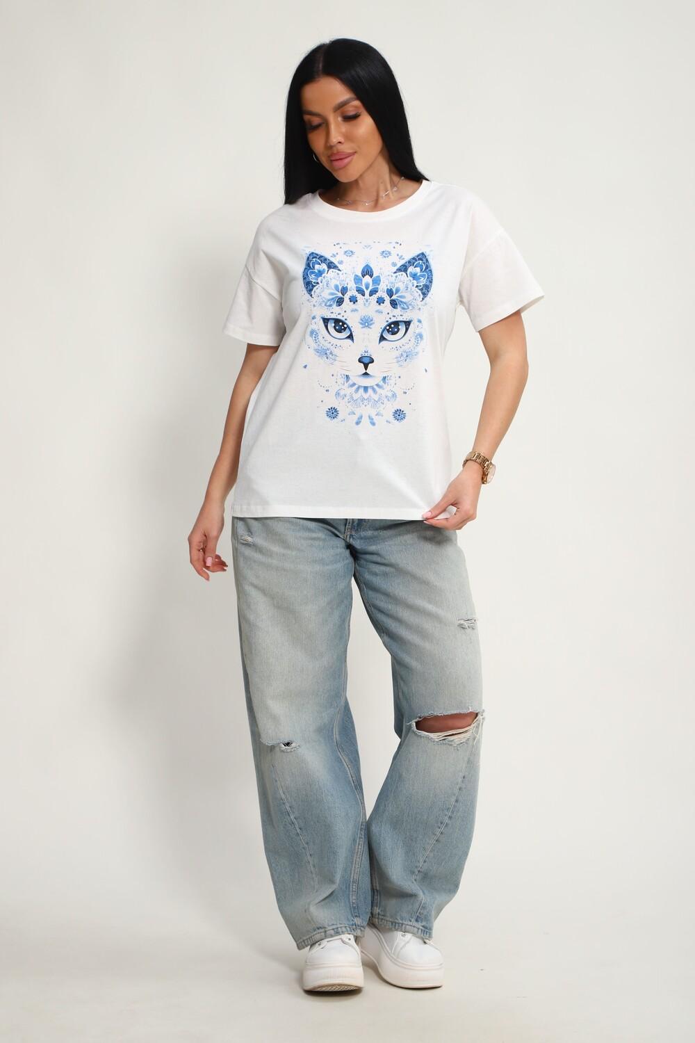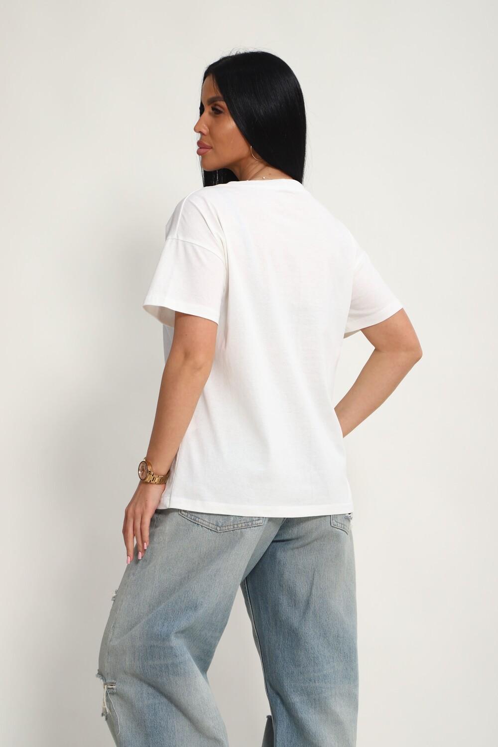 Футболка женская из гладкокрашеного трикотажа, хлопок 100%. Прямого силуэта, свободного облегания, горловина круглой формы. Рукав короткий. Низ изделия прямой. На полочке принт, шелкография.