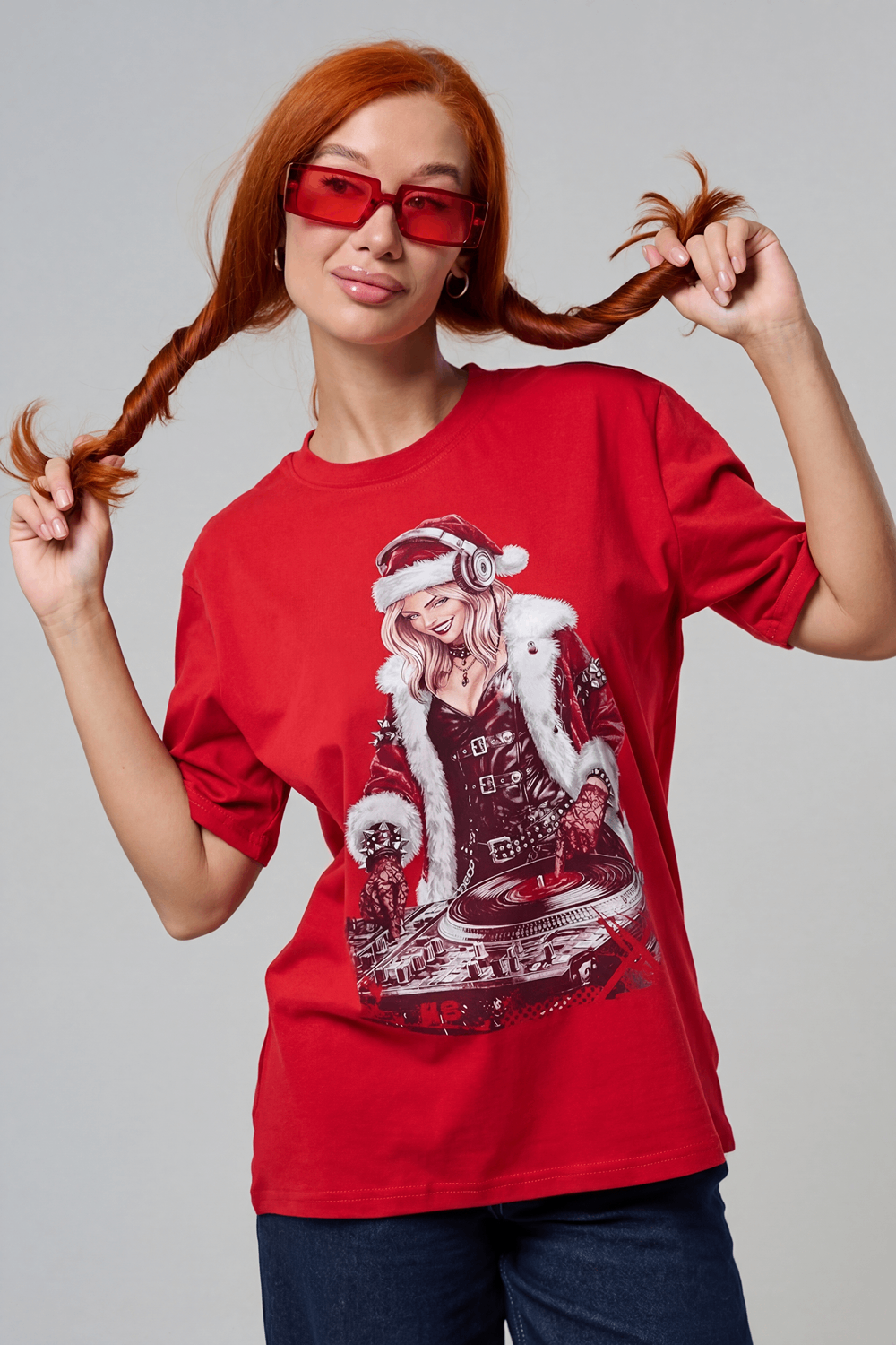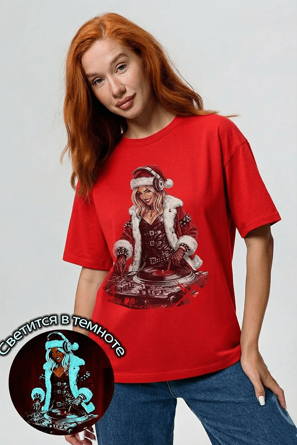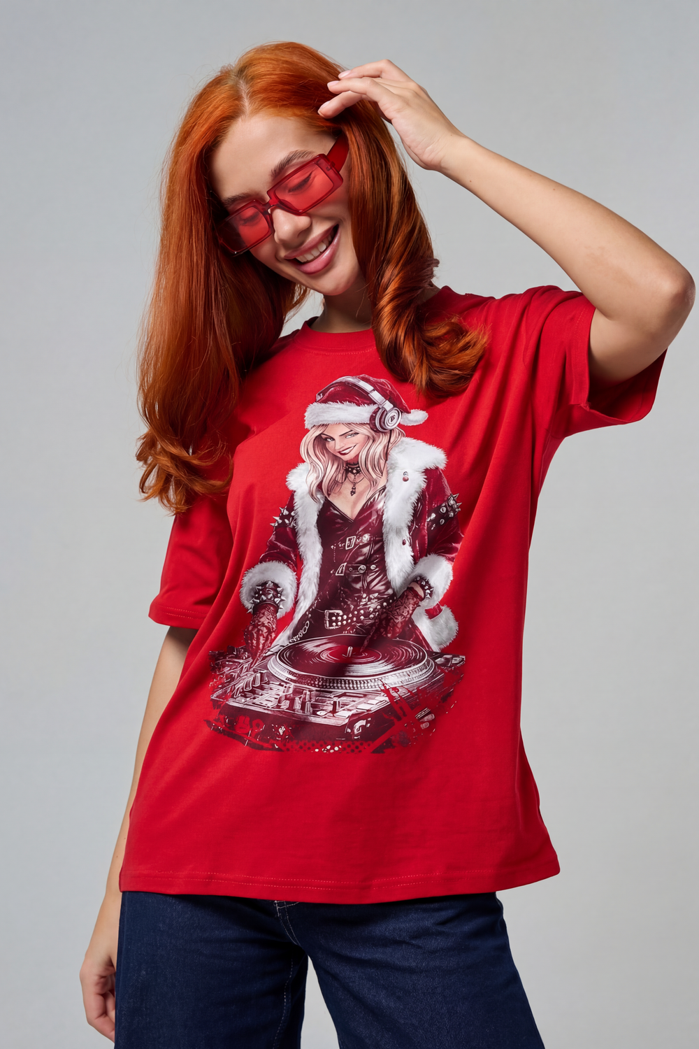 Погрузитесь в магию праздника с нашей стильной oversize-футболкой "Санта-Диджей"! Эта яркая красная футболка создана для тех, кто любит миксовать новогоднюю атмосферу с ритмом музыки. Главная героиня принта — соблазнительная Санта в меховой накидке, с красной шапкой и наушниками, уверенно стоящая за диджейским пультом. Её образ сочетает классический рождественский стиль с современным уличным вайбом: белый мех, чёрная кожаная одежда и динамичная поза, полная энергии.