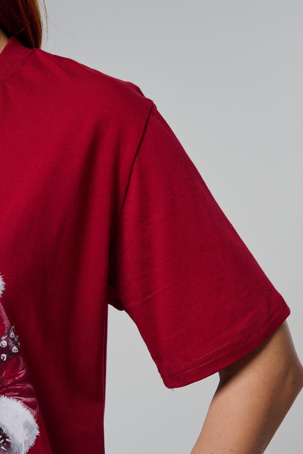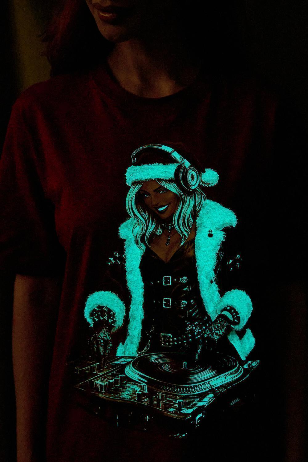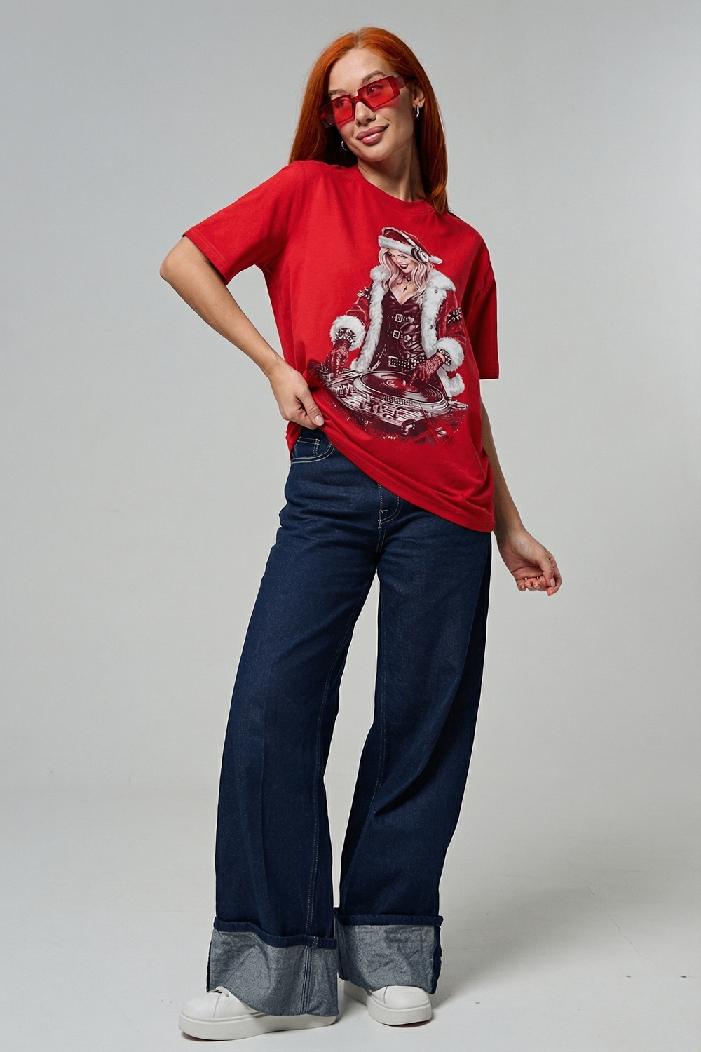 Погрузитесь в магию праздника с нашей стильной oversize-футболкой "Санта-Диджей"! Эта яркая красная футболка создана для тех, кто любит миксовать новогоднюю атмосферу с ритмом музыки. Главная героиня принта — соблазнительная Санта в меховой накидке, с красной шапкой и наушниками, уверенно стоящая за диджейским пультом. Её образ сочетает классический рождественский стиль с современным уличным вайбом: белый мех, чёрная кожаная одежда и динамичная поза, полная энергии.