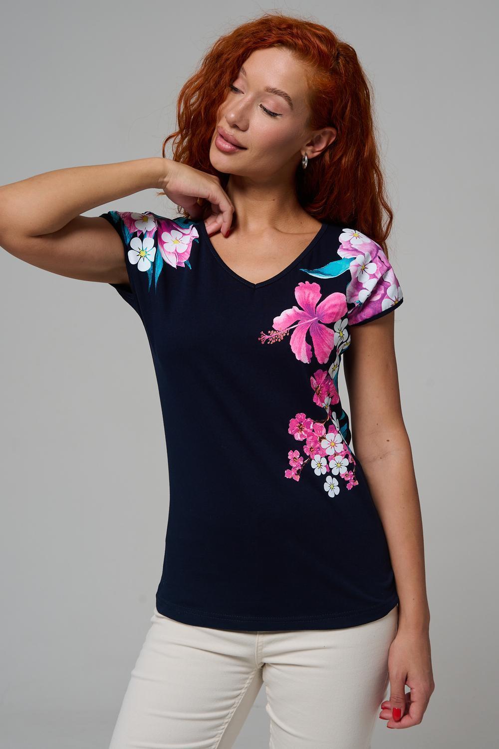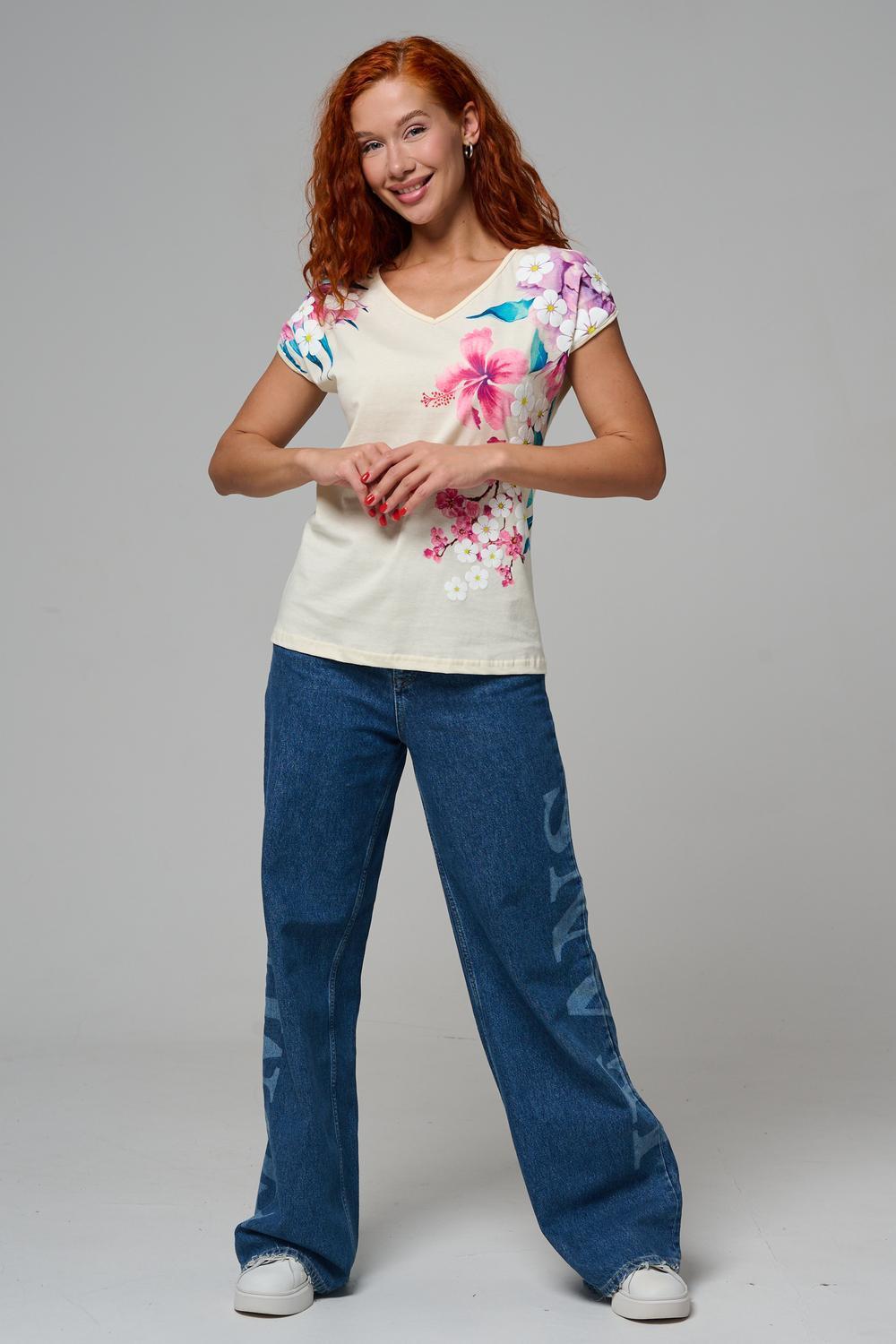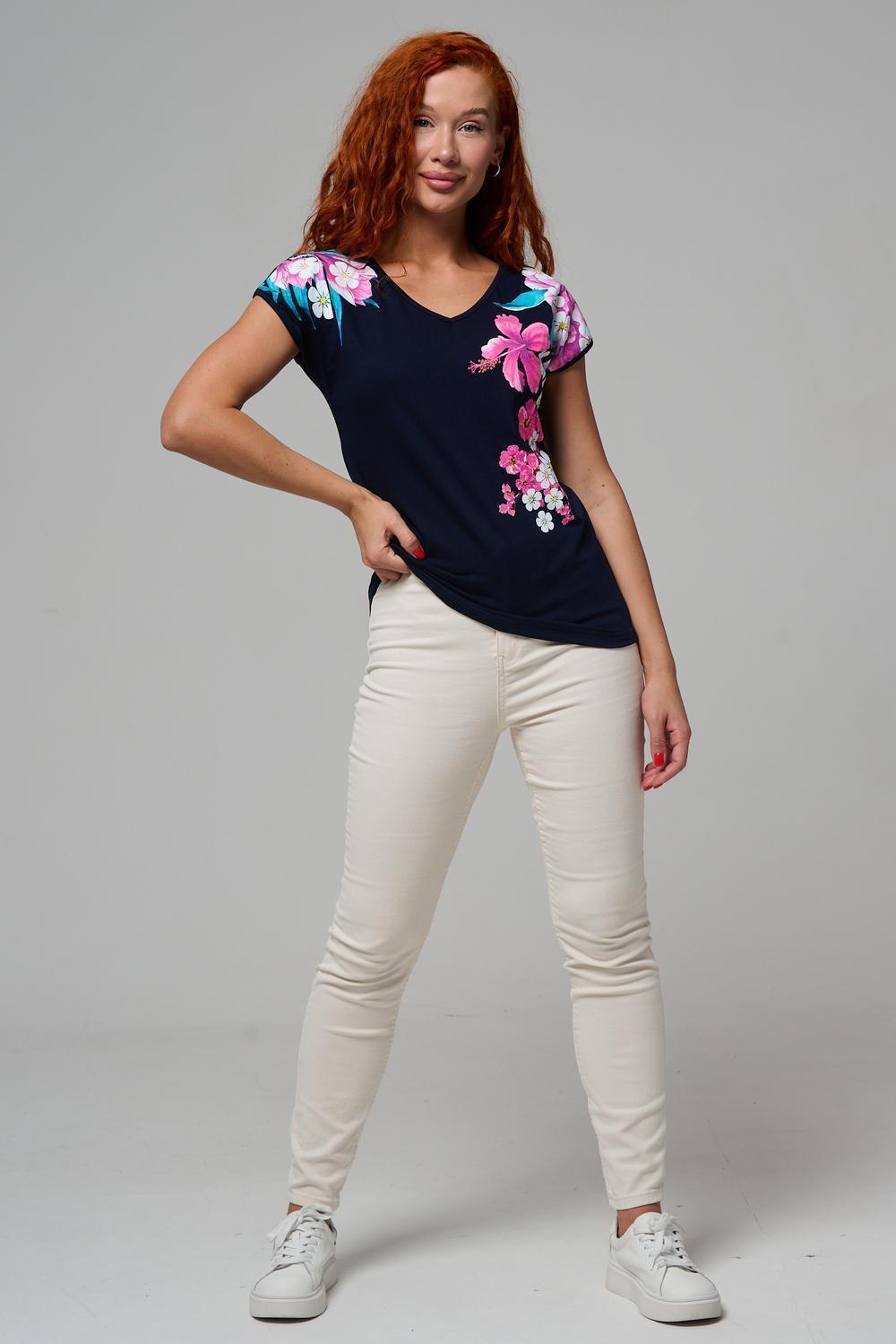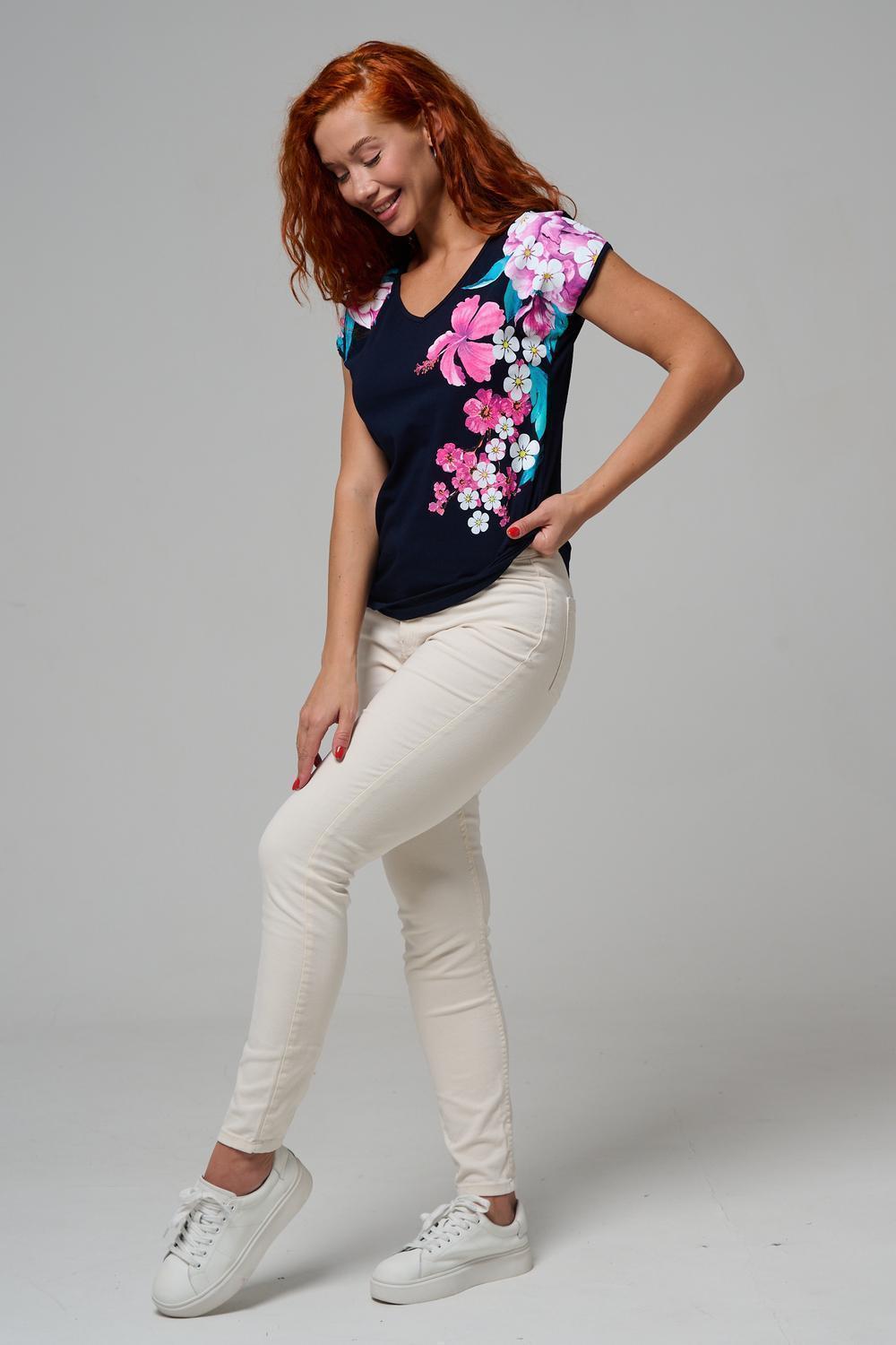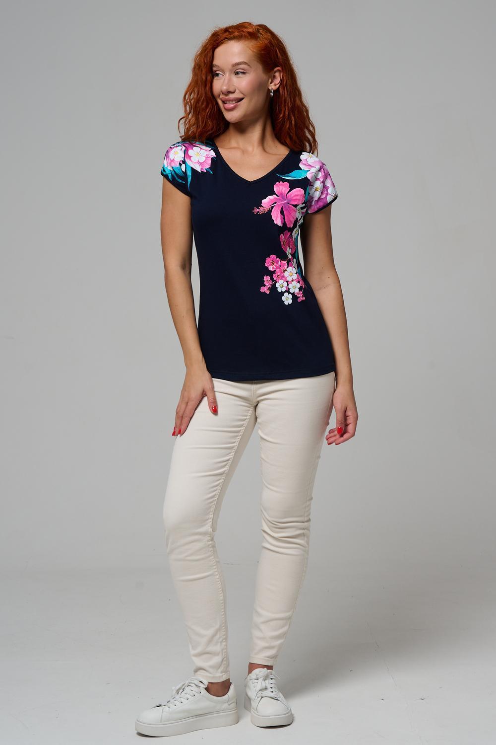 Футболка полуприлегающего силуэта, средней длины, с V-образной горловиной. Рукав цельнокроеный, короткий. Горловина и пройма обработаны бейкой из основного полотна.