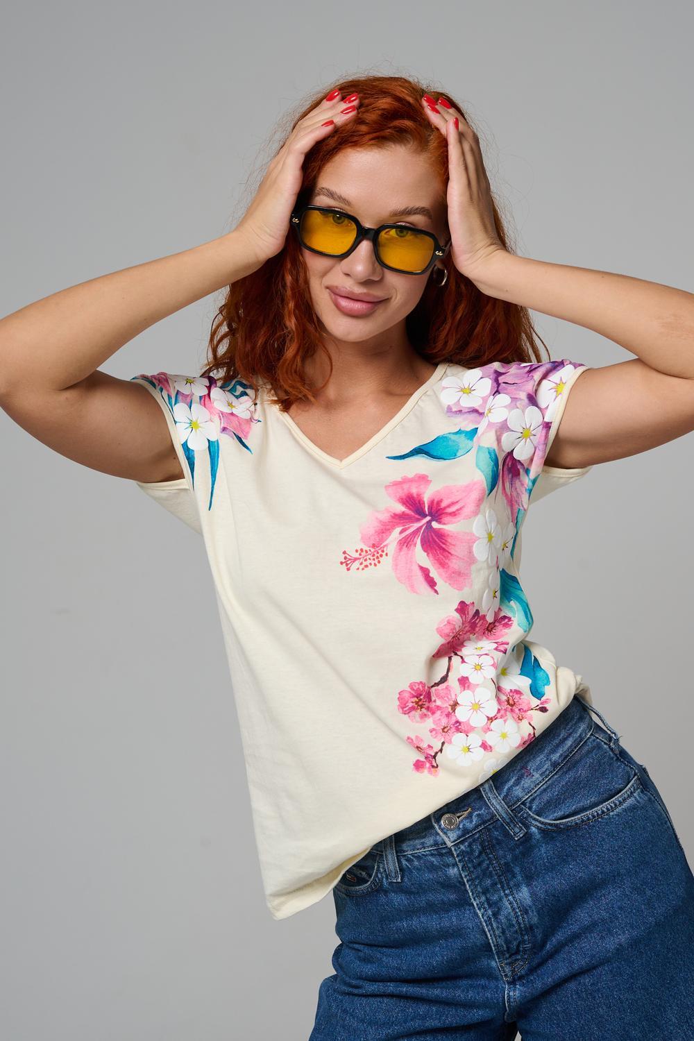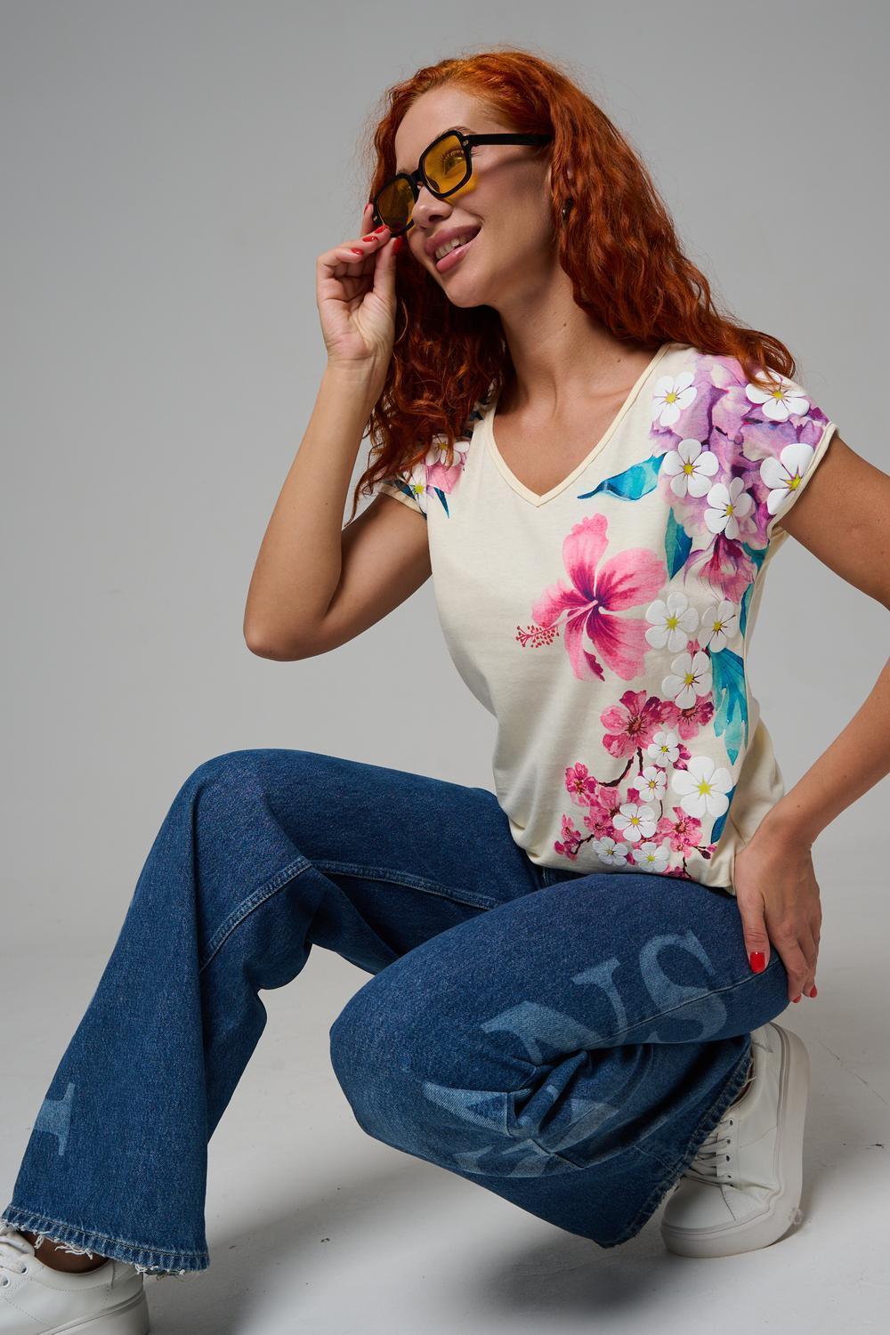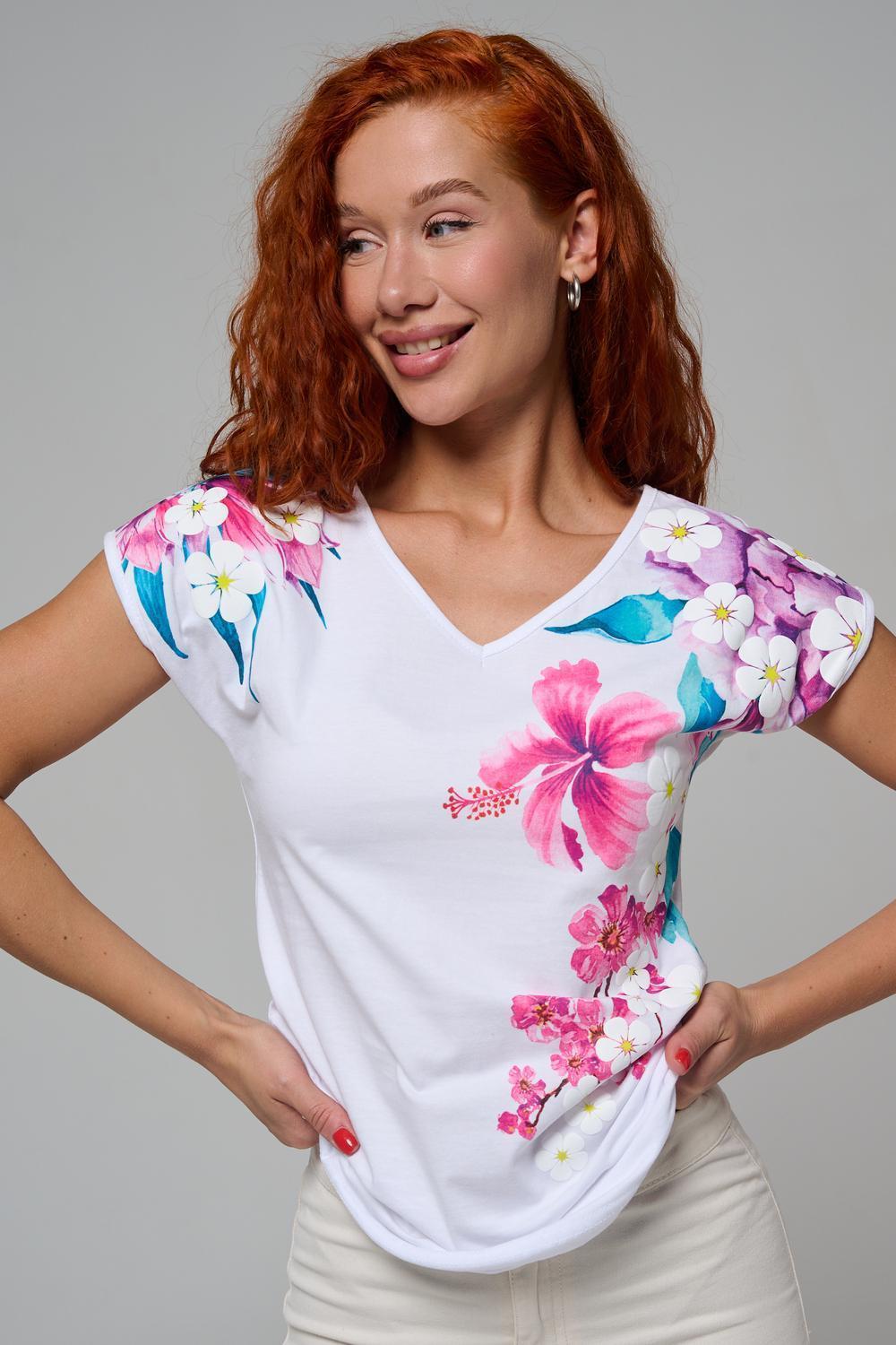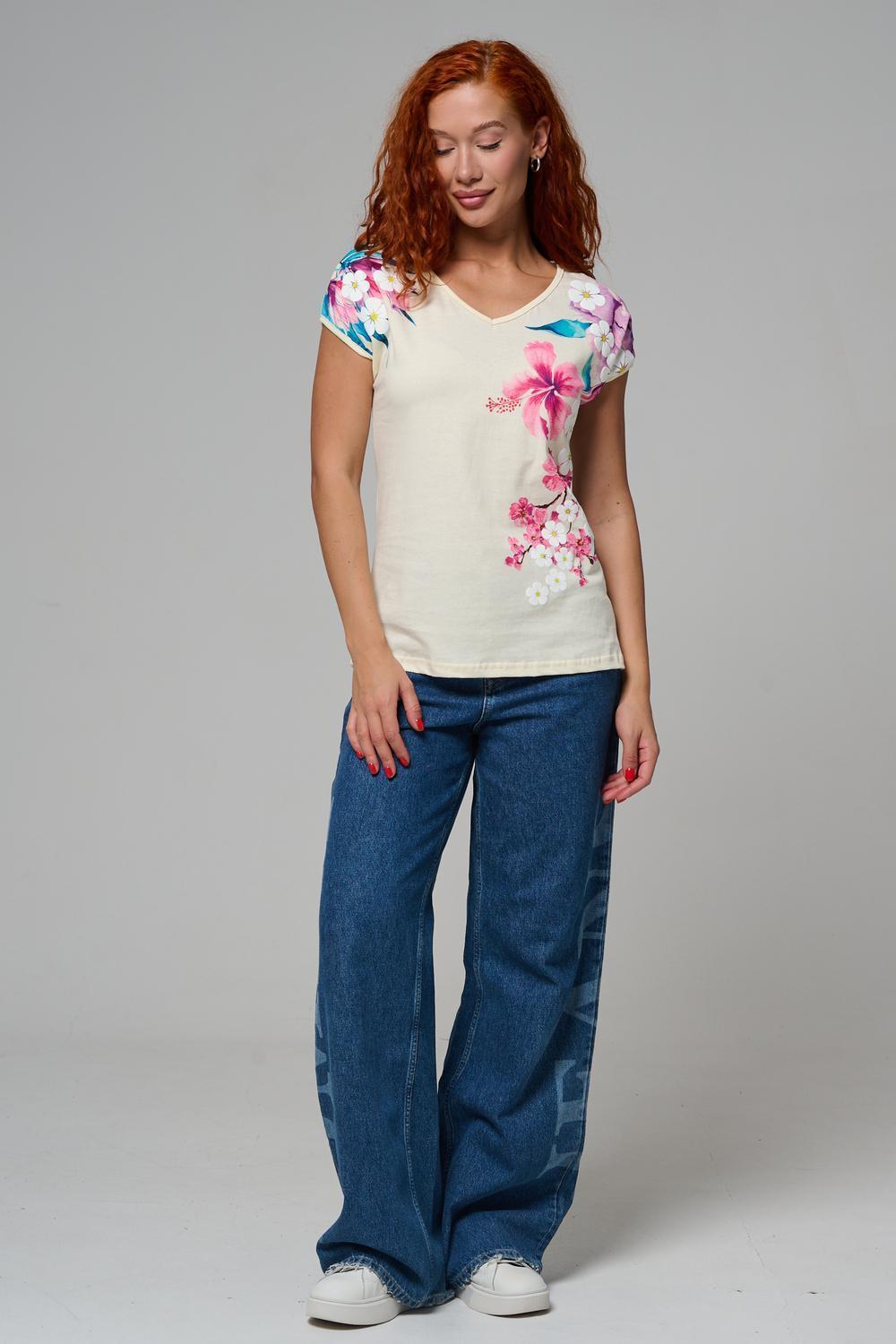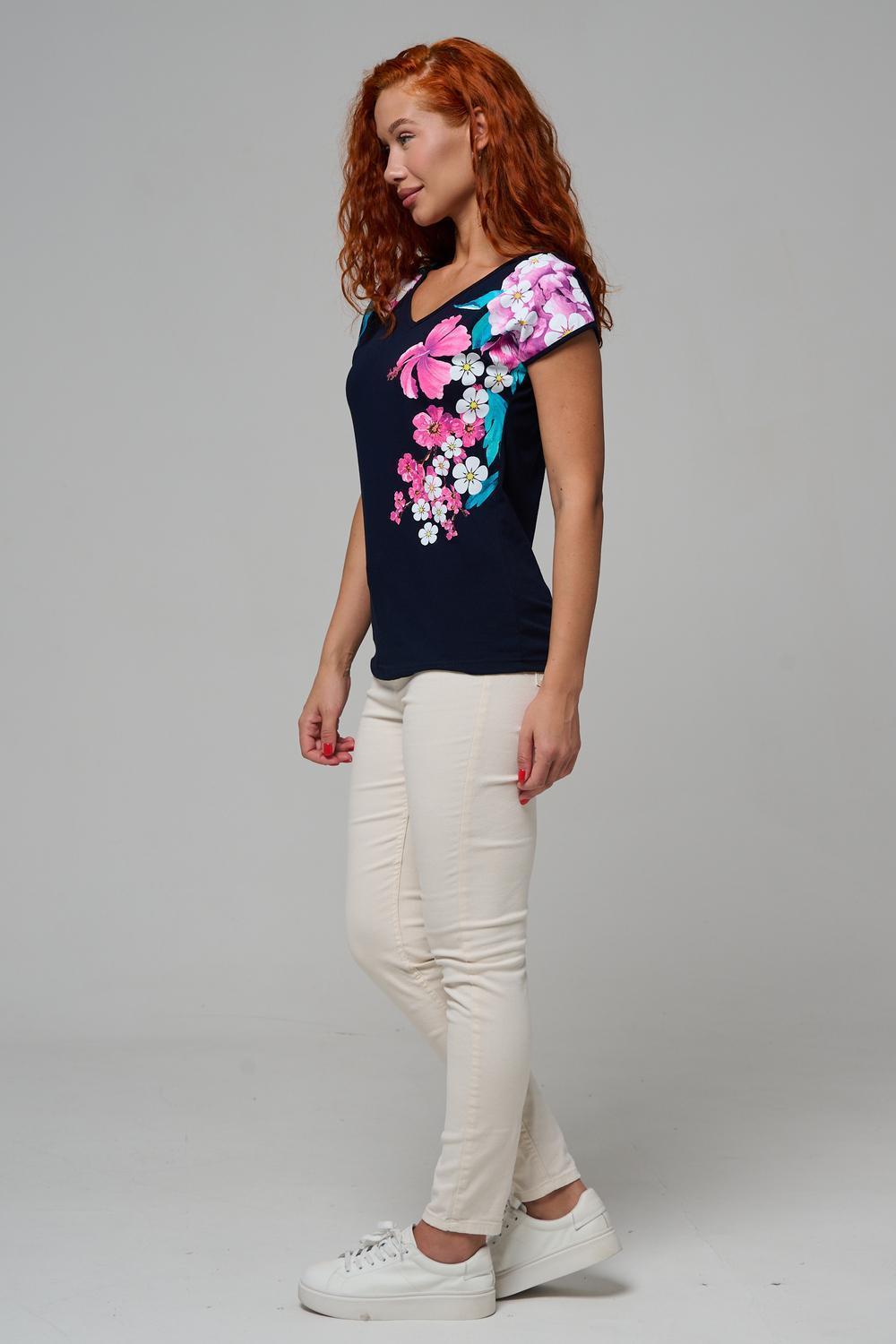 Футболка полуприлегающего силуэта, средней длины, с V-образной горловиной. Рукав цельнокроеный, короткий. Горловина и пройма обработаны бейкой из основного полотна.