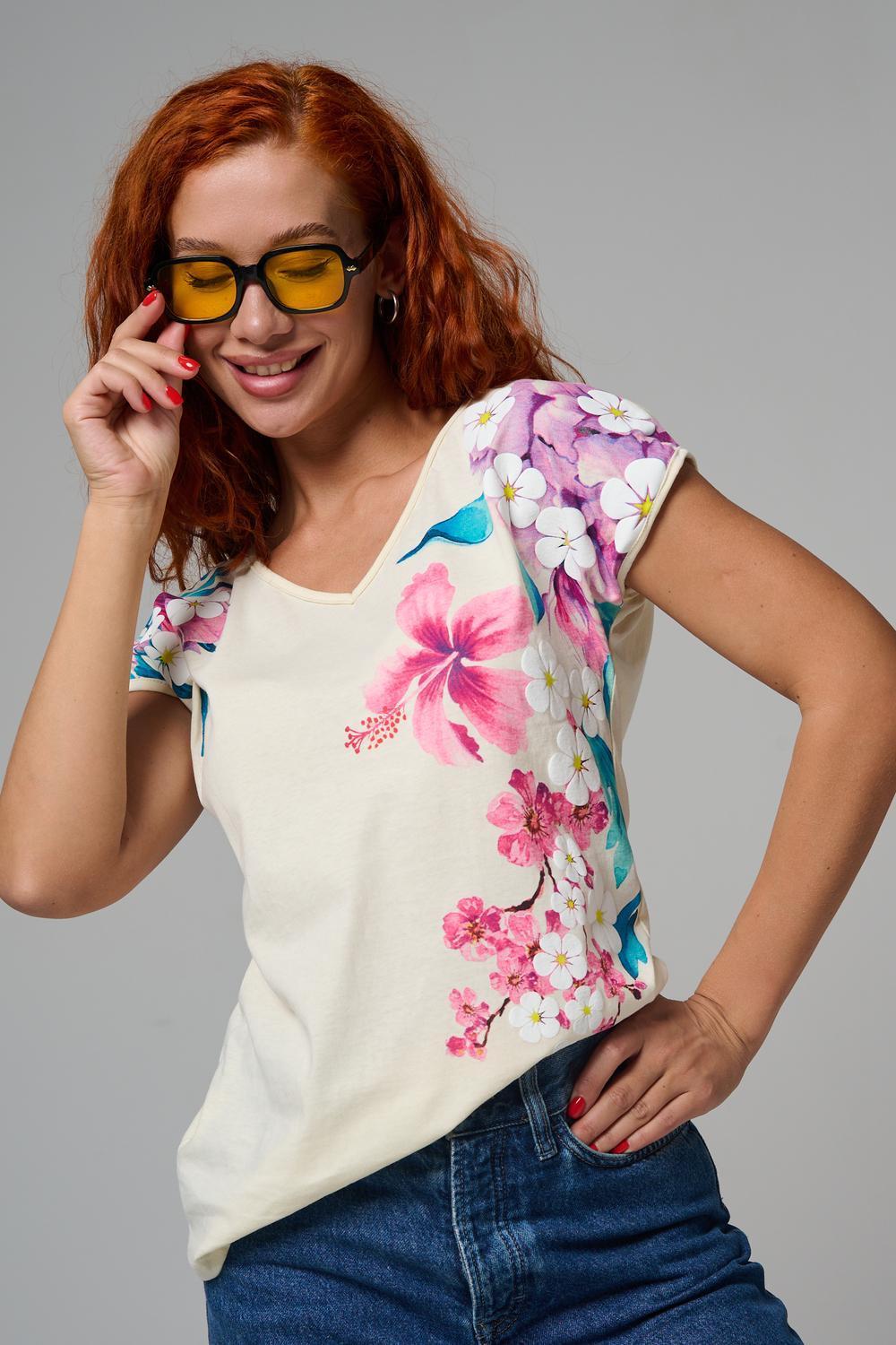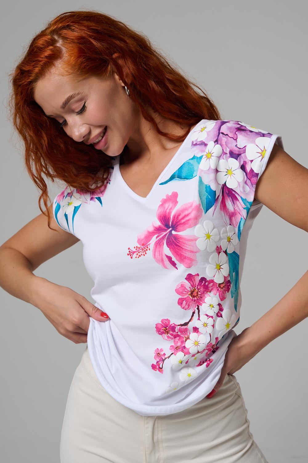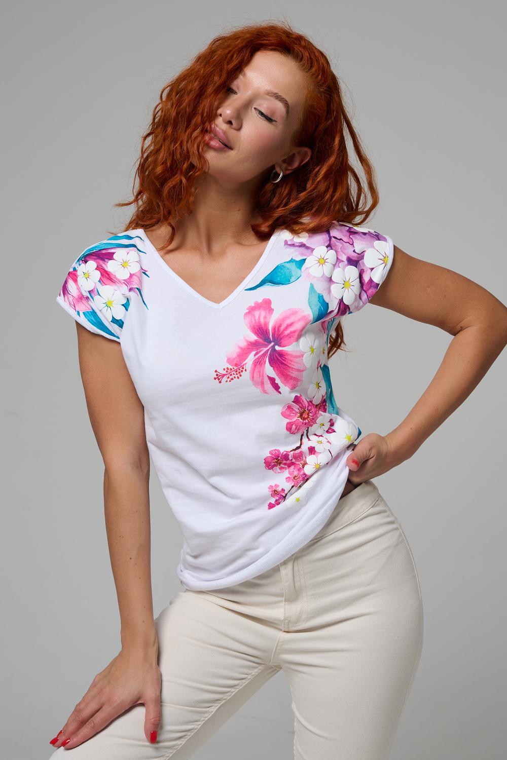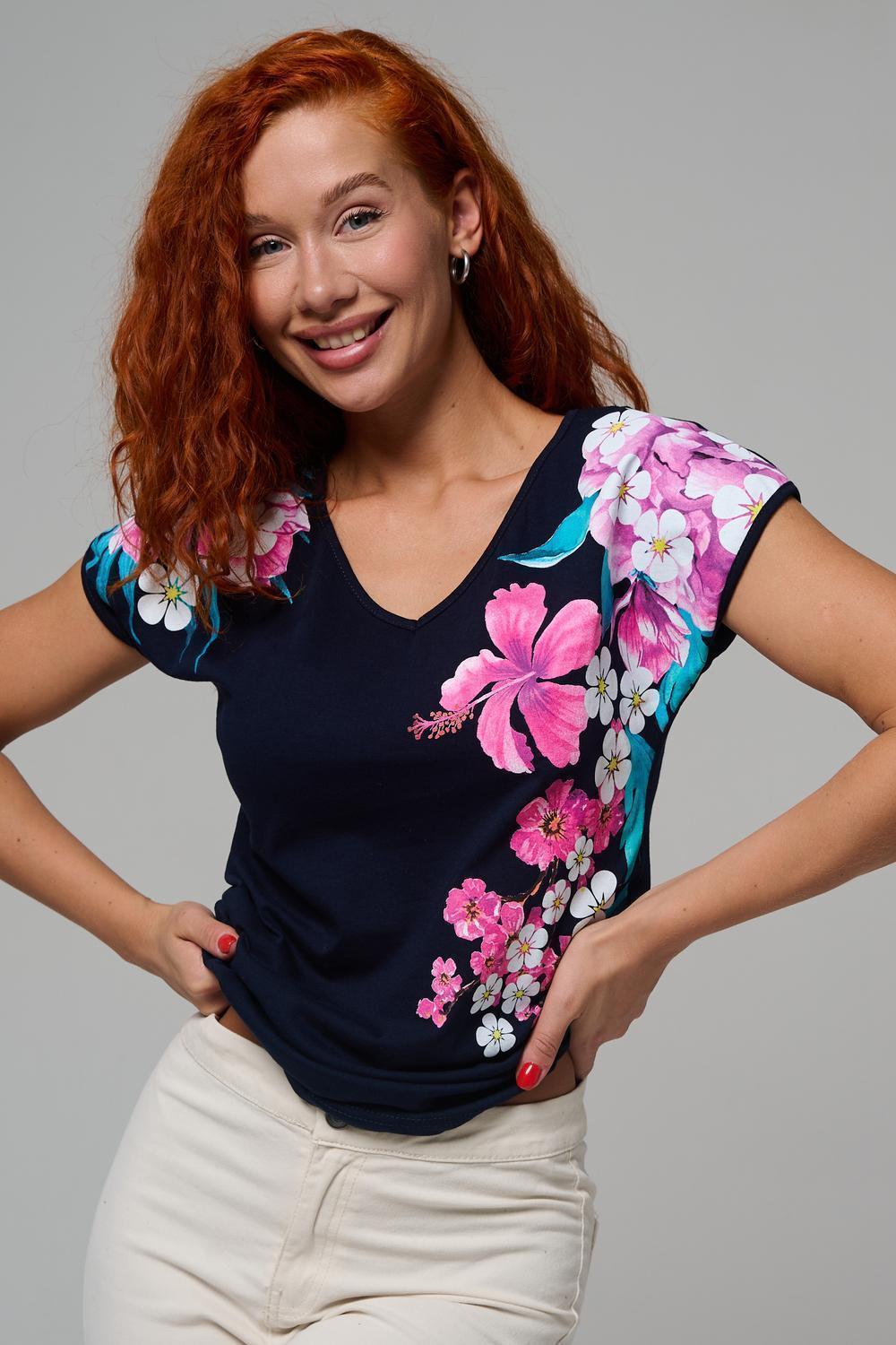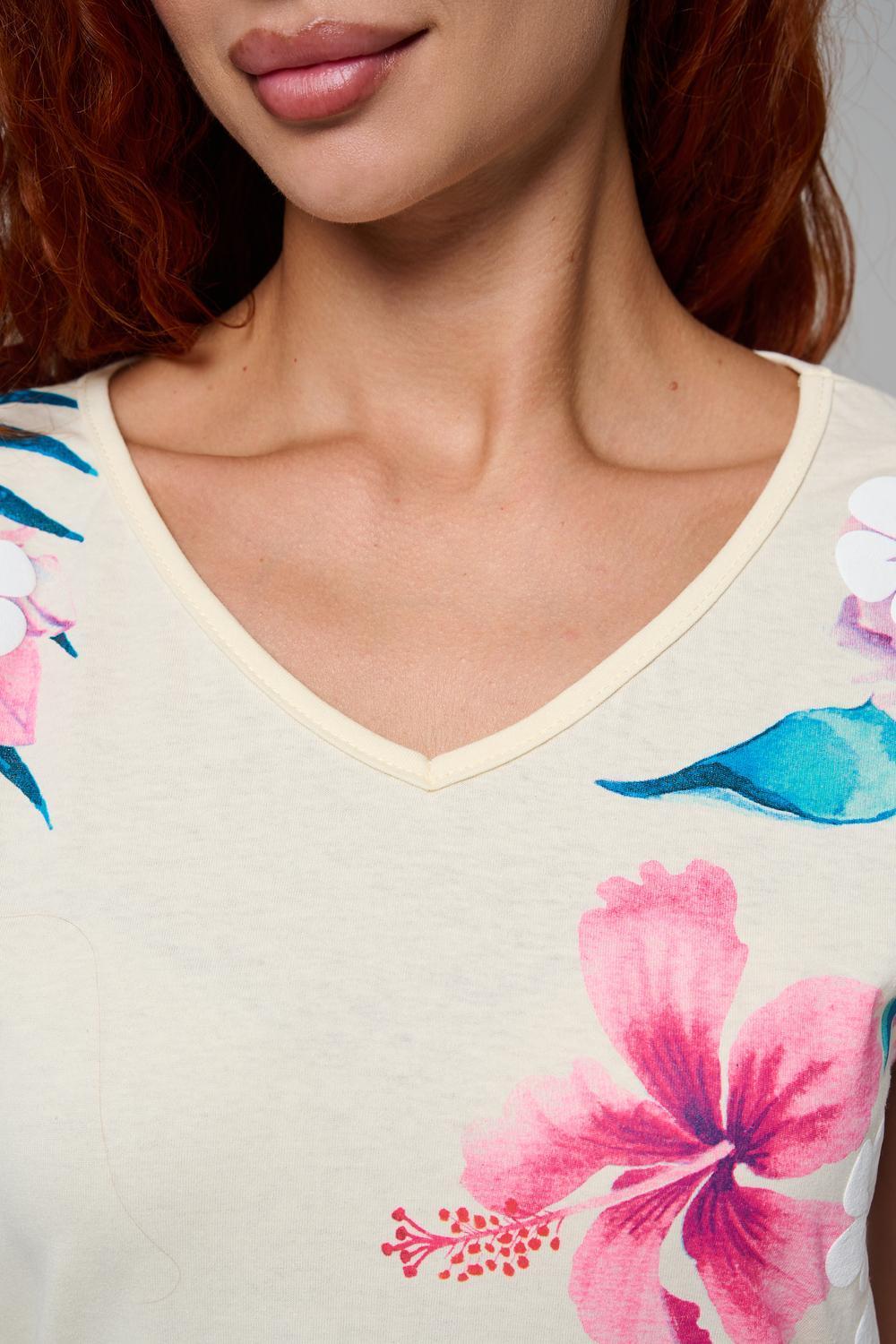 Футболка полуприлегающего силуэта, средней длины, с V-образной горловиной. Рукав цельнокроеный, короткий. Горловина и пройма обработаны бейкой из основного полотна.