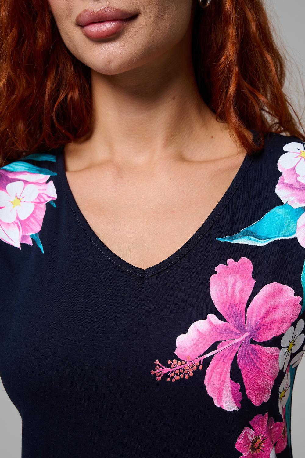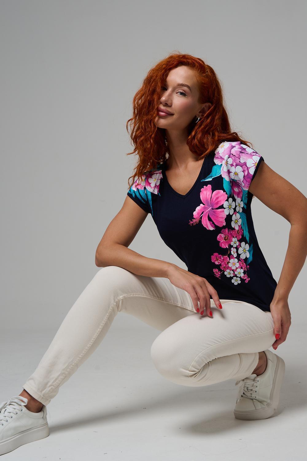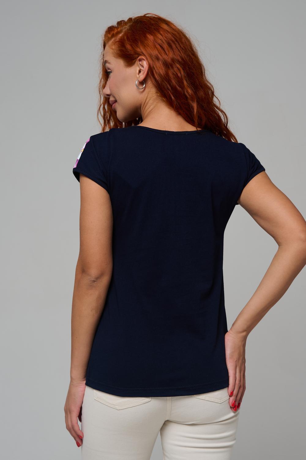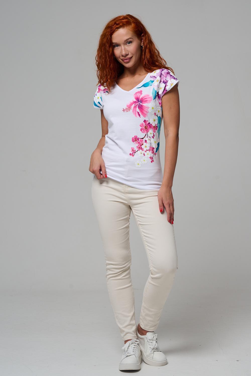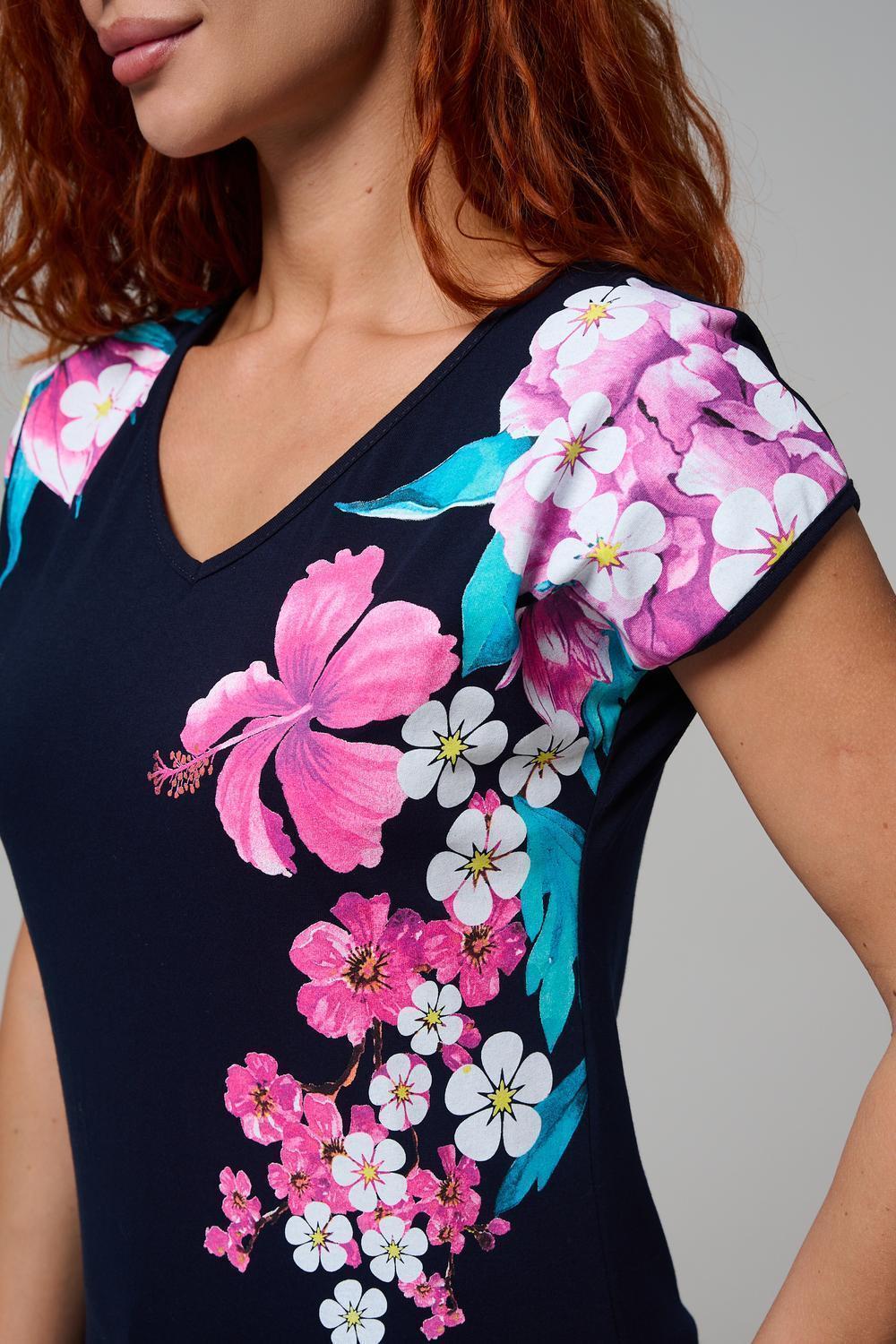 Футболка полуприлегающего силуэта, средней длины, с V-образной горловиной. Рукав цельнокроеный, короткий. Горловина и пройма обработаны бейкой из основного полотна.