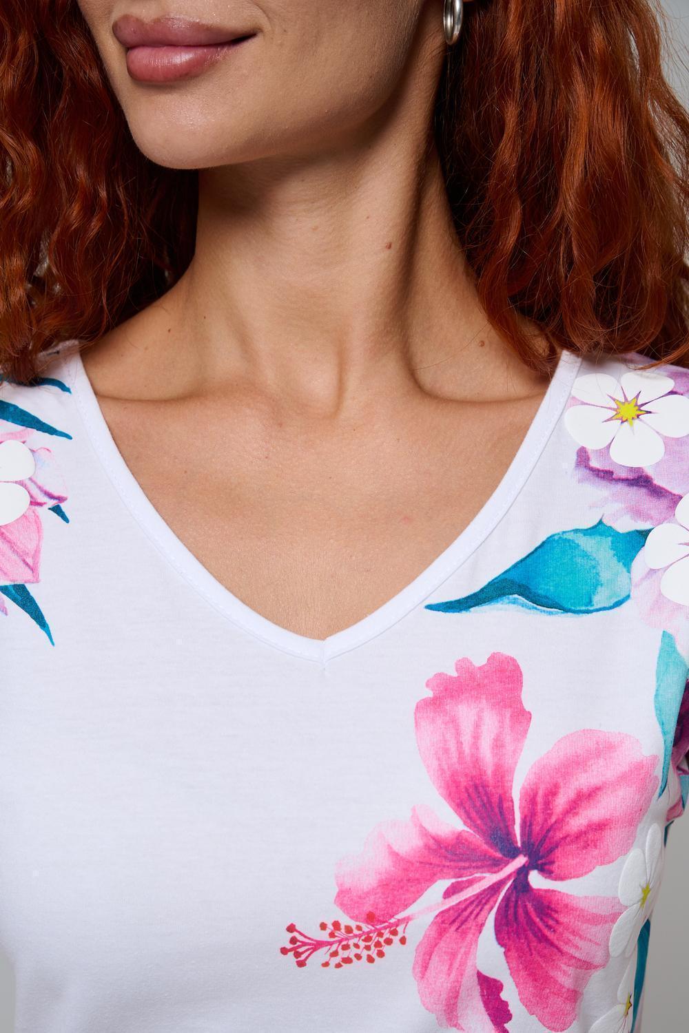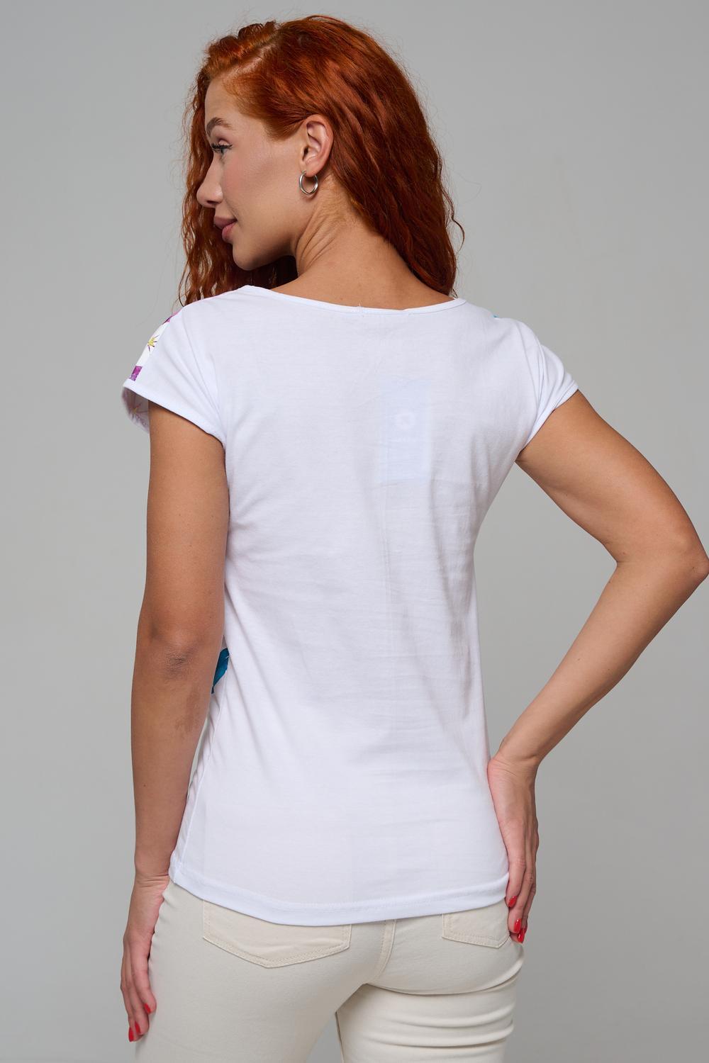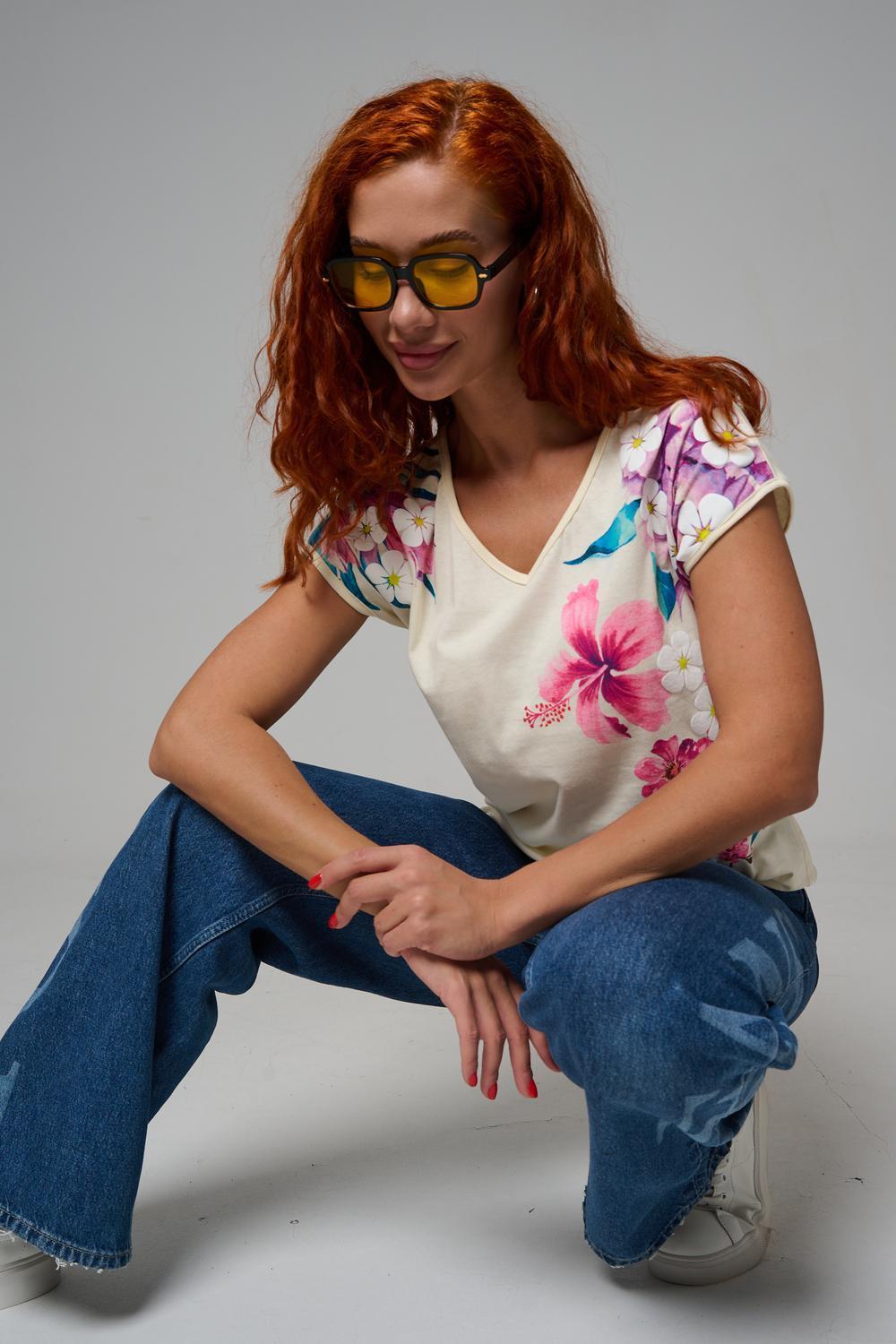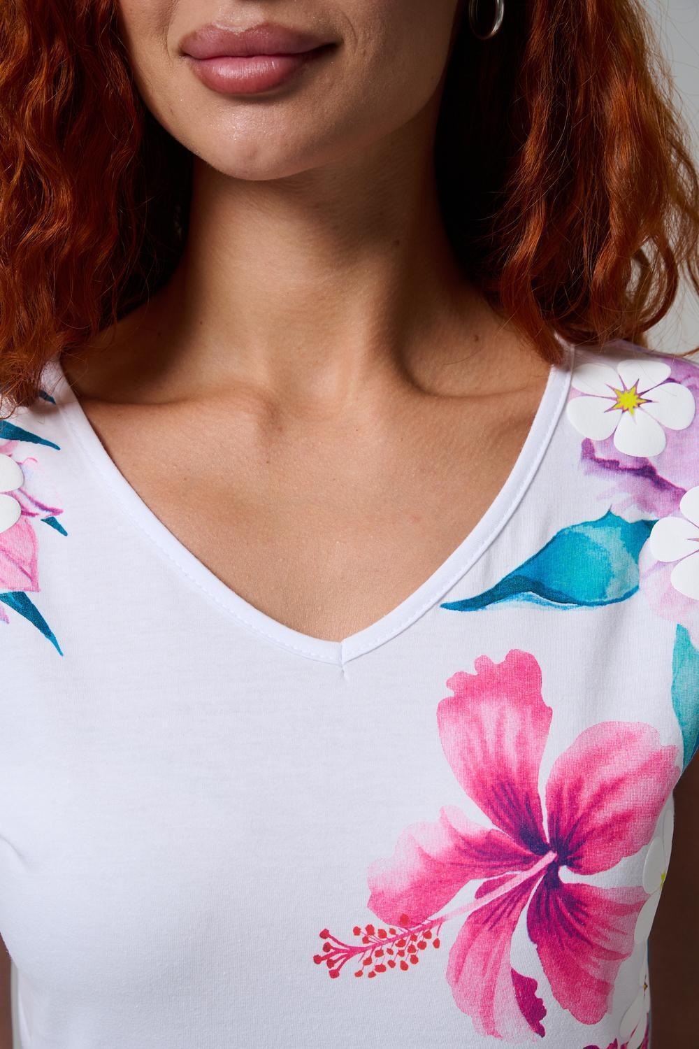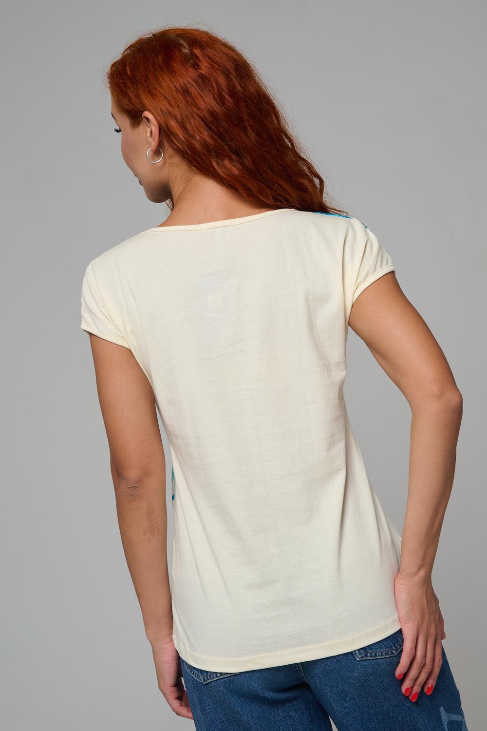 Футболка полуприлегающего силуэта, средней длины, с V-образной горловиной. Рукав цельнокроеный, короткий. Горловина и пройма обработаны бейкой из основного полотна.