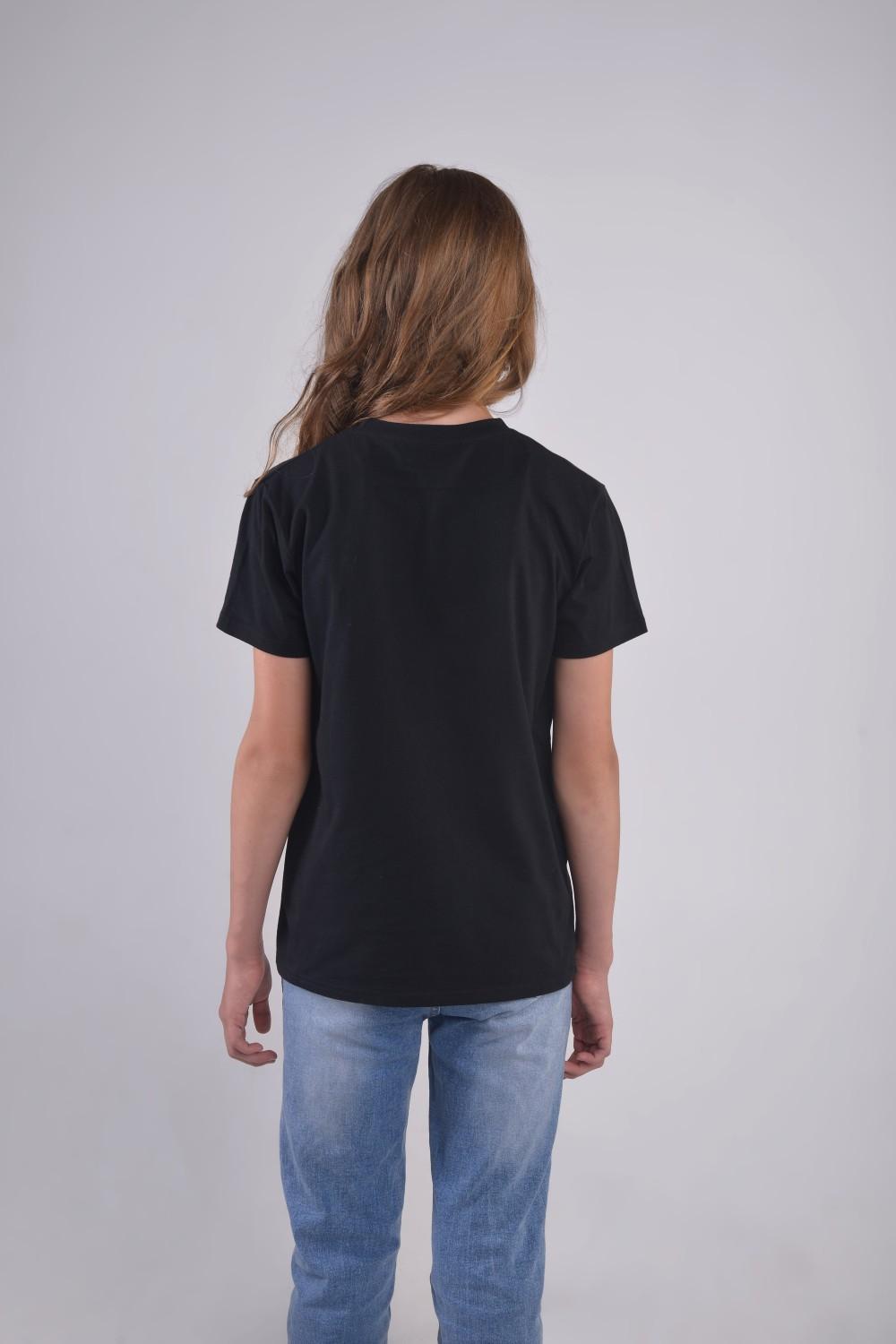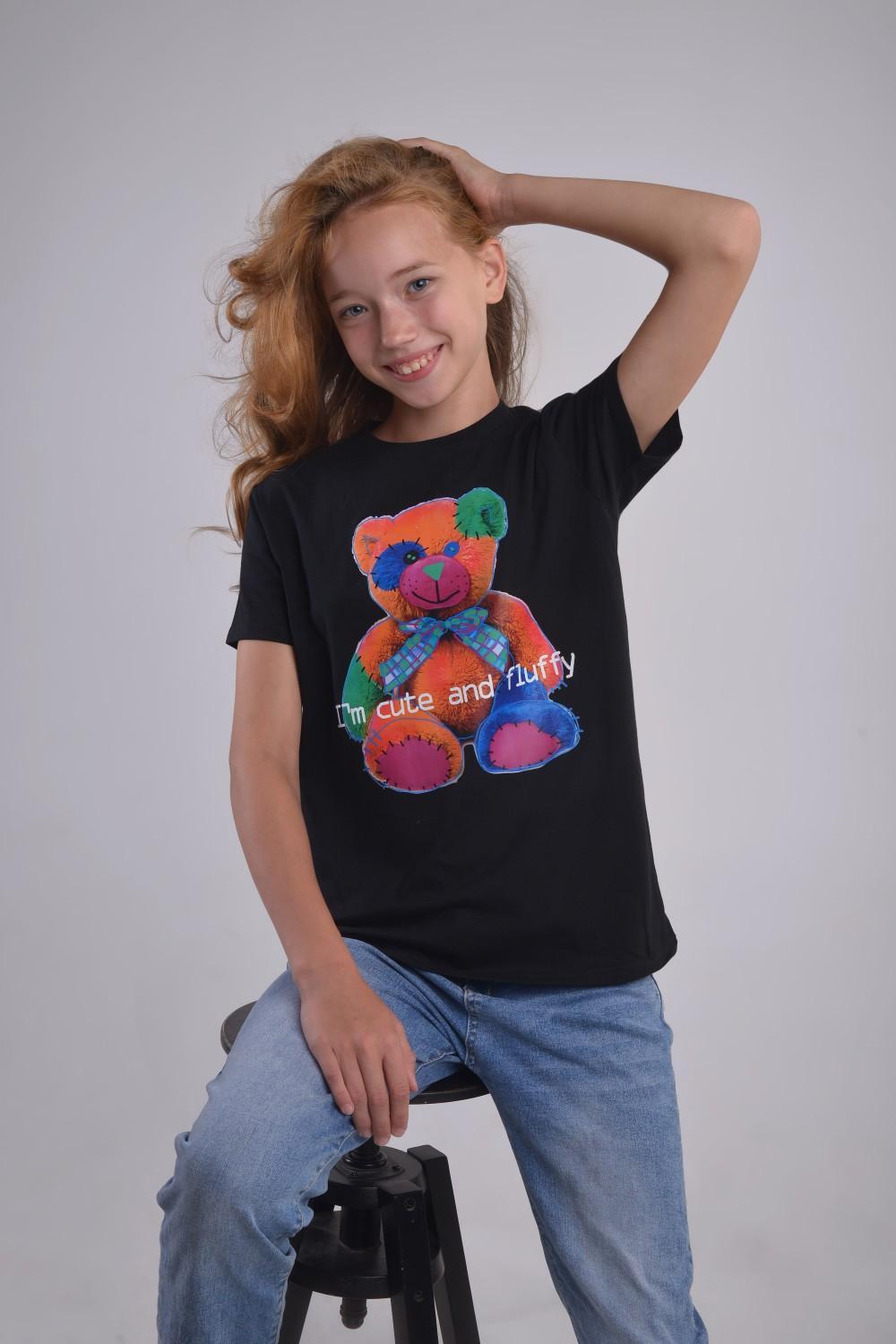Футболка для девочки подростка черного цвета, свободного классического кроя, классической длины, модная, стильная, нарядная, озорная из мягкого хлопкового полотна 170 г/м2 с трендовым стильным принтом трансфер принт - технологией нанесения картинки на изделие с использованием высоких температур. Яркий трендовый принт поможет создать стильный модный образ, на который обязательно обратят внимание сверстники, что поможет быть в центре внимания и подчеркнет уникальный вкус и выбор модной девчонки. Модель - 11 лет, рост 158 см, размер футболки на девочке - 158-164 см