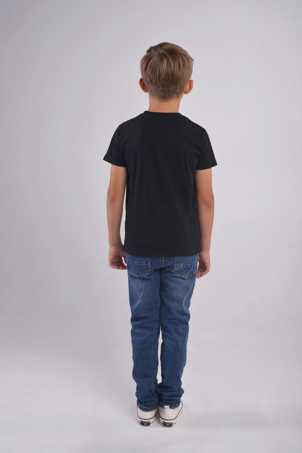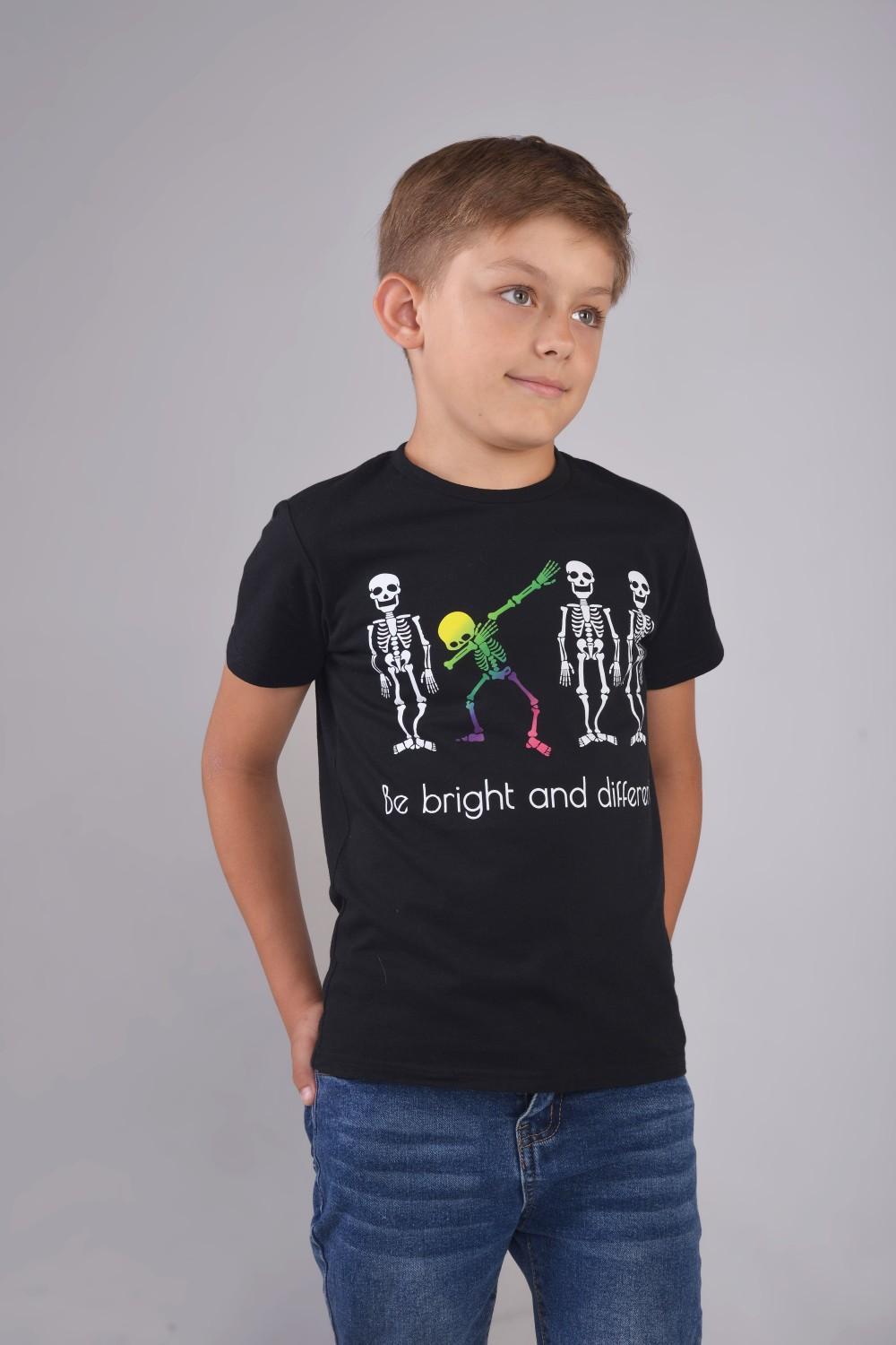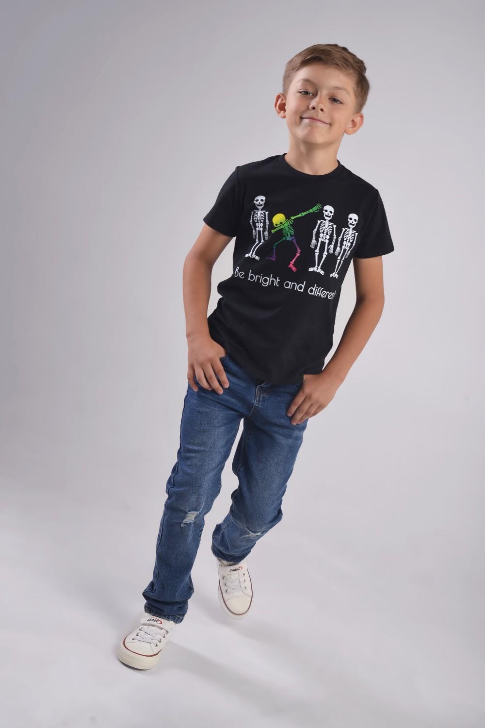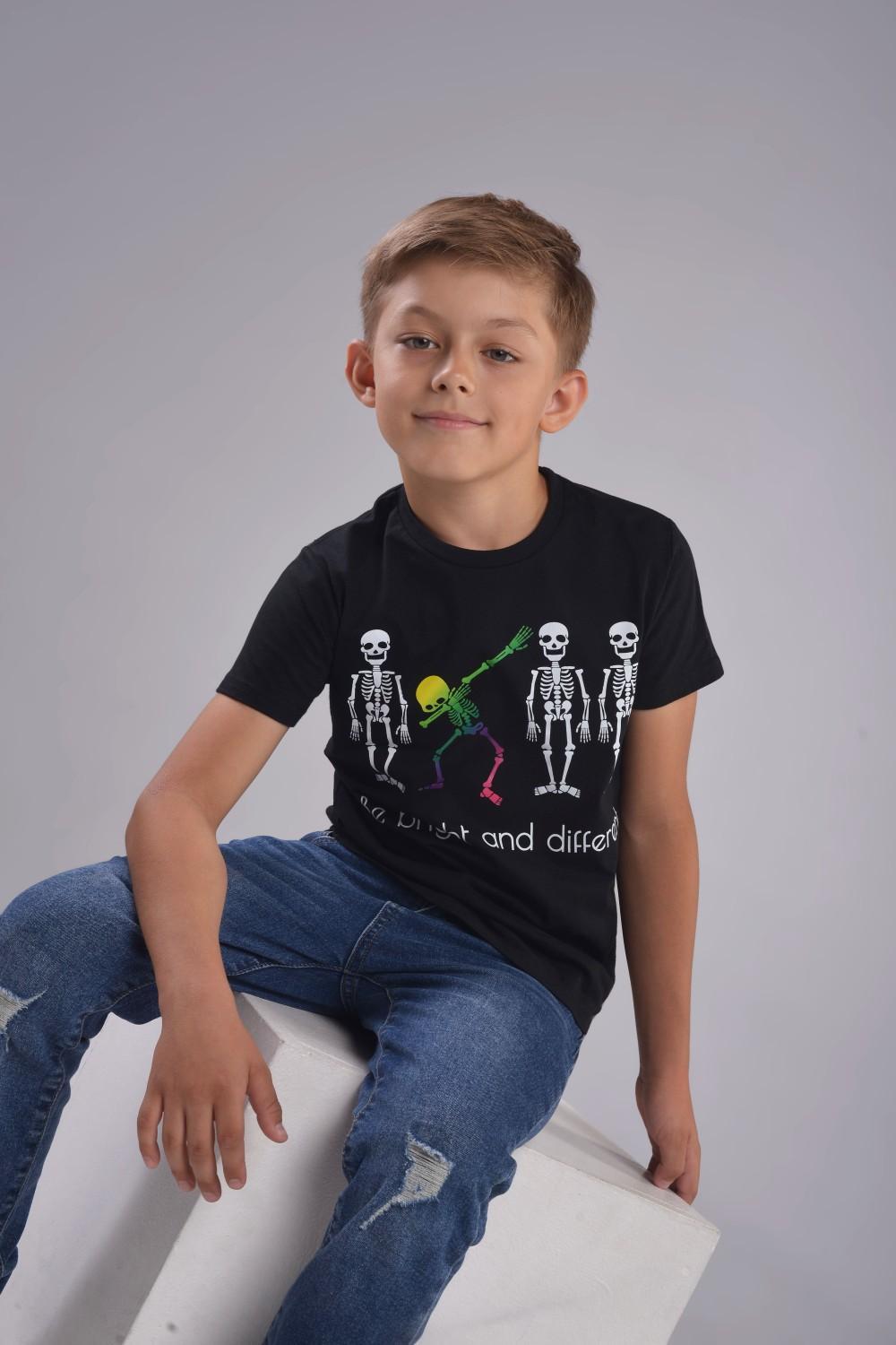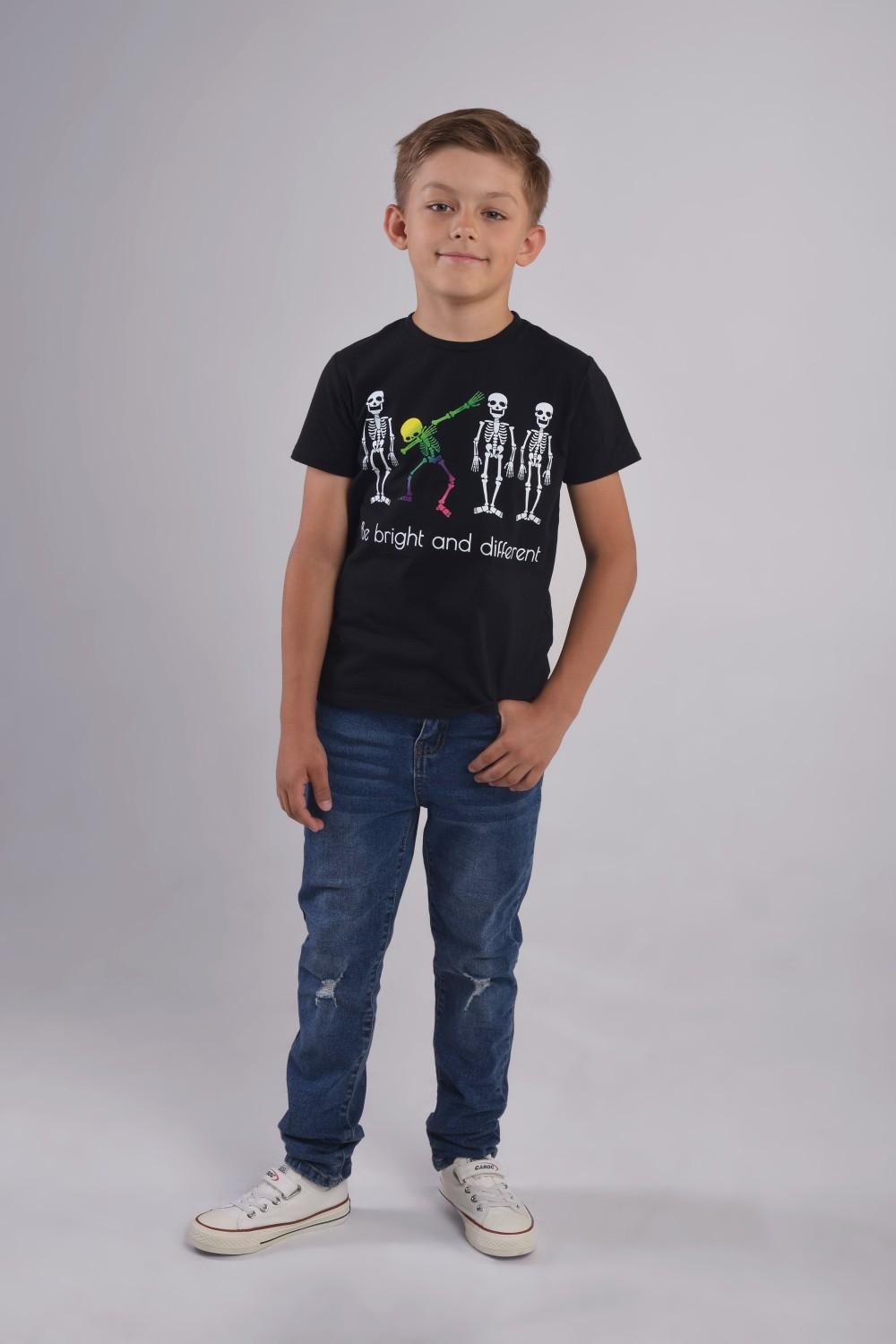 Футболка для мальчика подростка черная, свободного классического кроя, классической длины, модная, стильная, нарядная, из качественного мягкого хлопкового полотна 170 г/м2 с принтом, с transfer print (трансфер принт) - технологией нанесения картинки на изделие с использованием высоких температур. Хулиганский принт с танцующими скелетами и динамичный слоган - привлекательный элемент и яркий нестандартный ход в детской одежде.