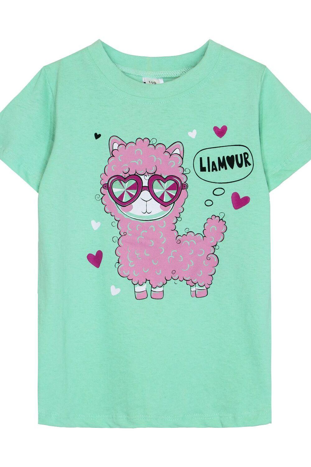 Футболка для девочки прямого силуэта с втачным коротким рукавом. Горловина круглая, обработана воротником из кулирки. Низ изделия и рукавов обработан швом в подгибку. На полочке принт шелкография.