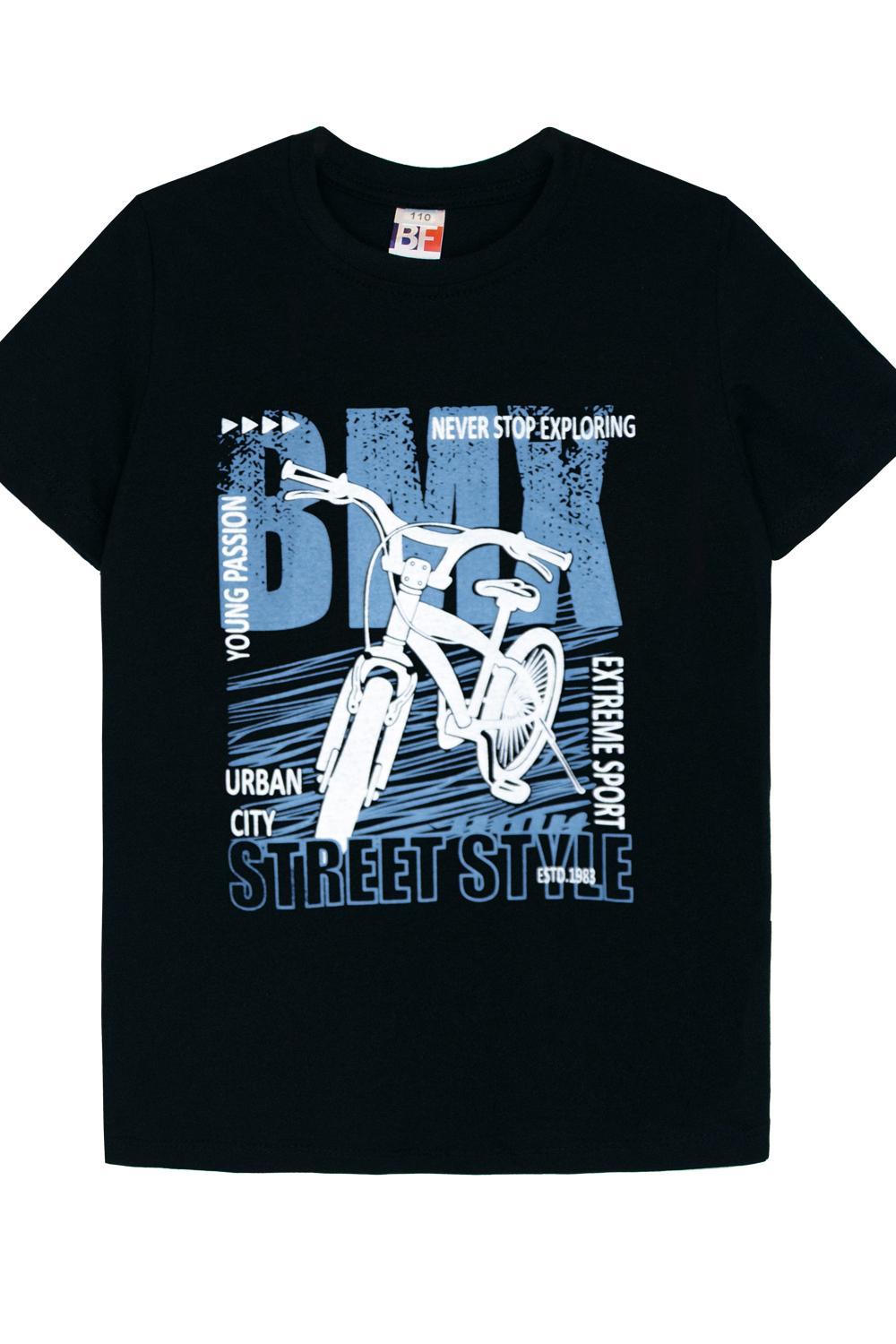 Футболка для мальчика прямого силуэта с втачным коротким рукавом. Горловина круглая обработана воротником из рибаны. Горловина по полочке и спинке отстрочена нитками в цвет изделия. Низ изделия и рукавов обработан швом в подгибку. На полочке принт шелкография. Надпись преводится как "Нмкогда не прекращай исследовать; Юная стасть; Городской; Город; Экстремальный спорт; Уличный стиль".