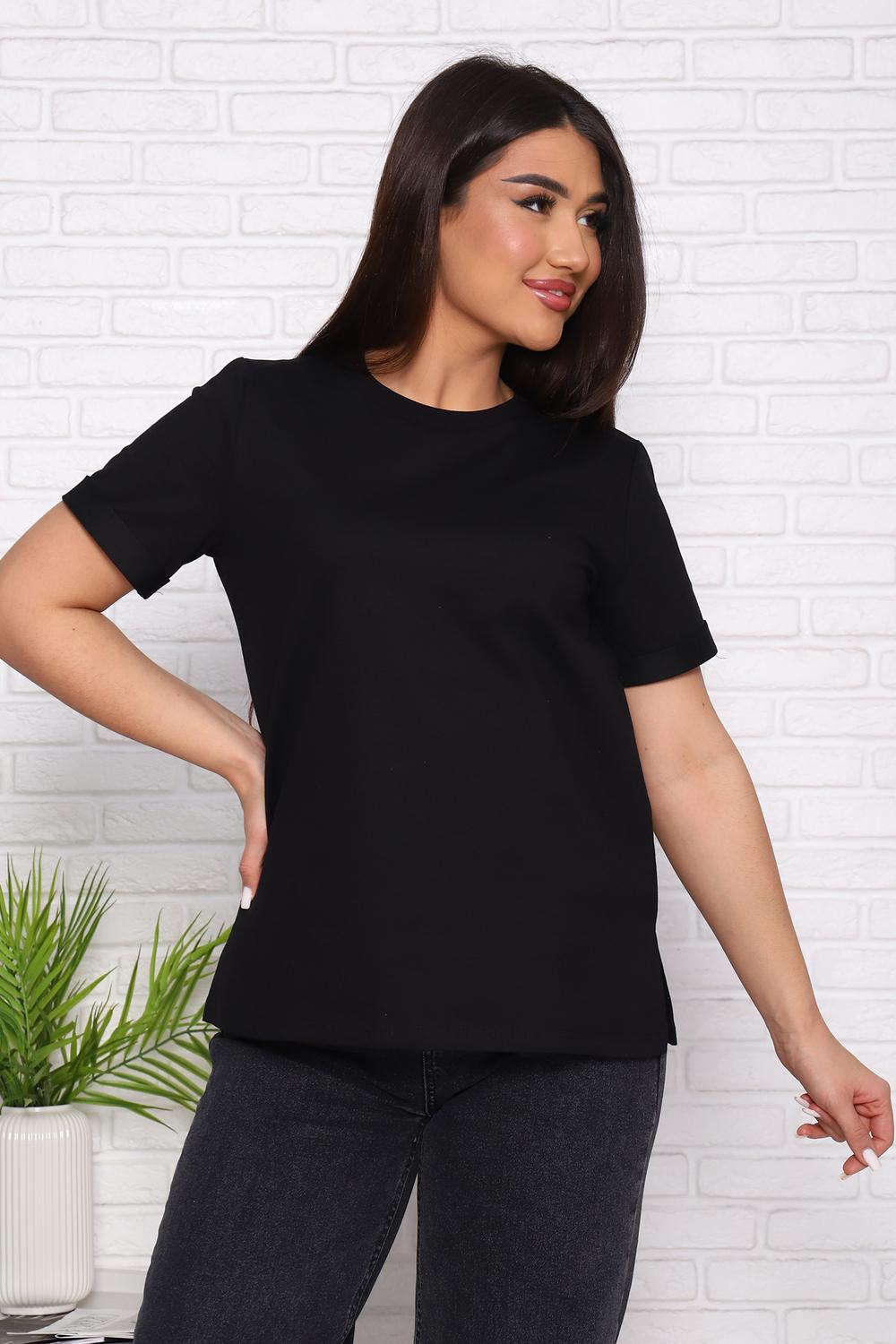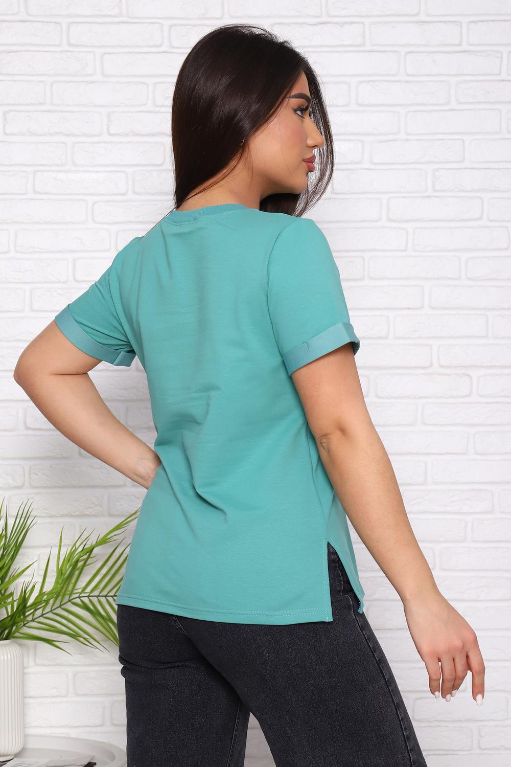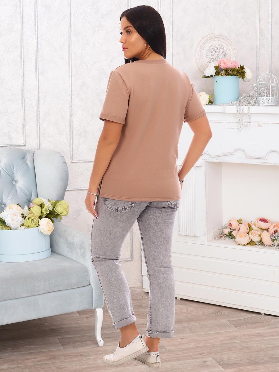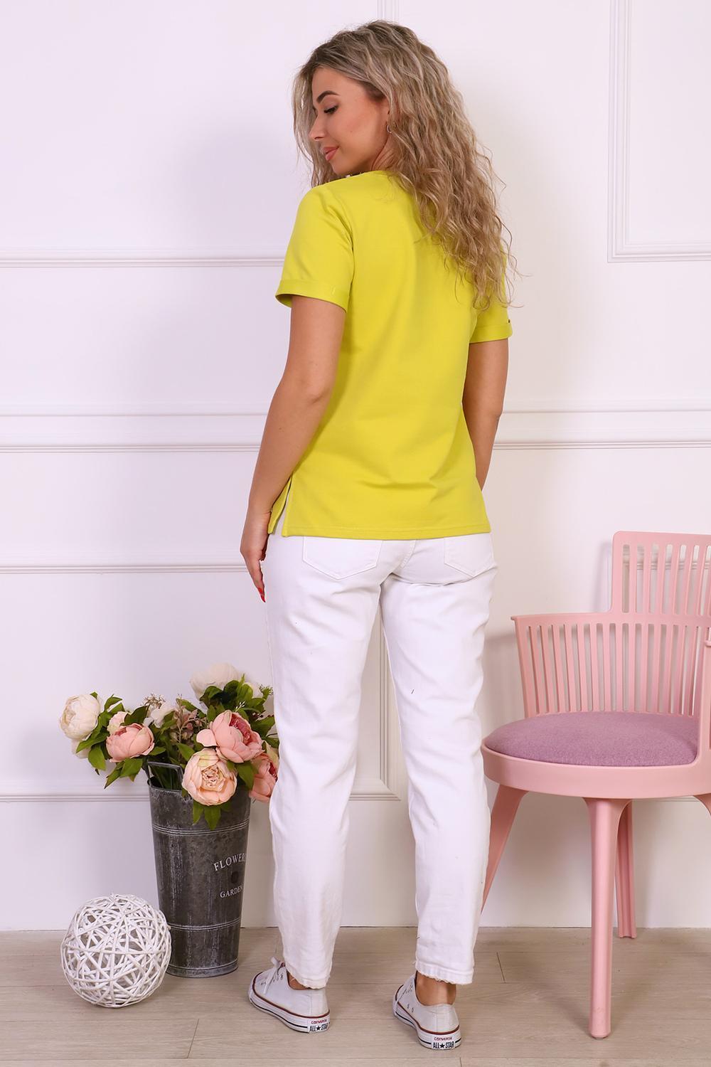 Футболка женская с втачным коротким рукавом. На детали переда фигурная кокетка и застежка на 2 кнопки. На детали спинки — прямая кокетка.