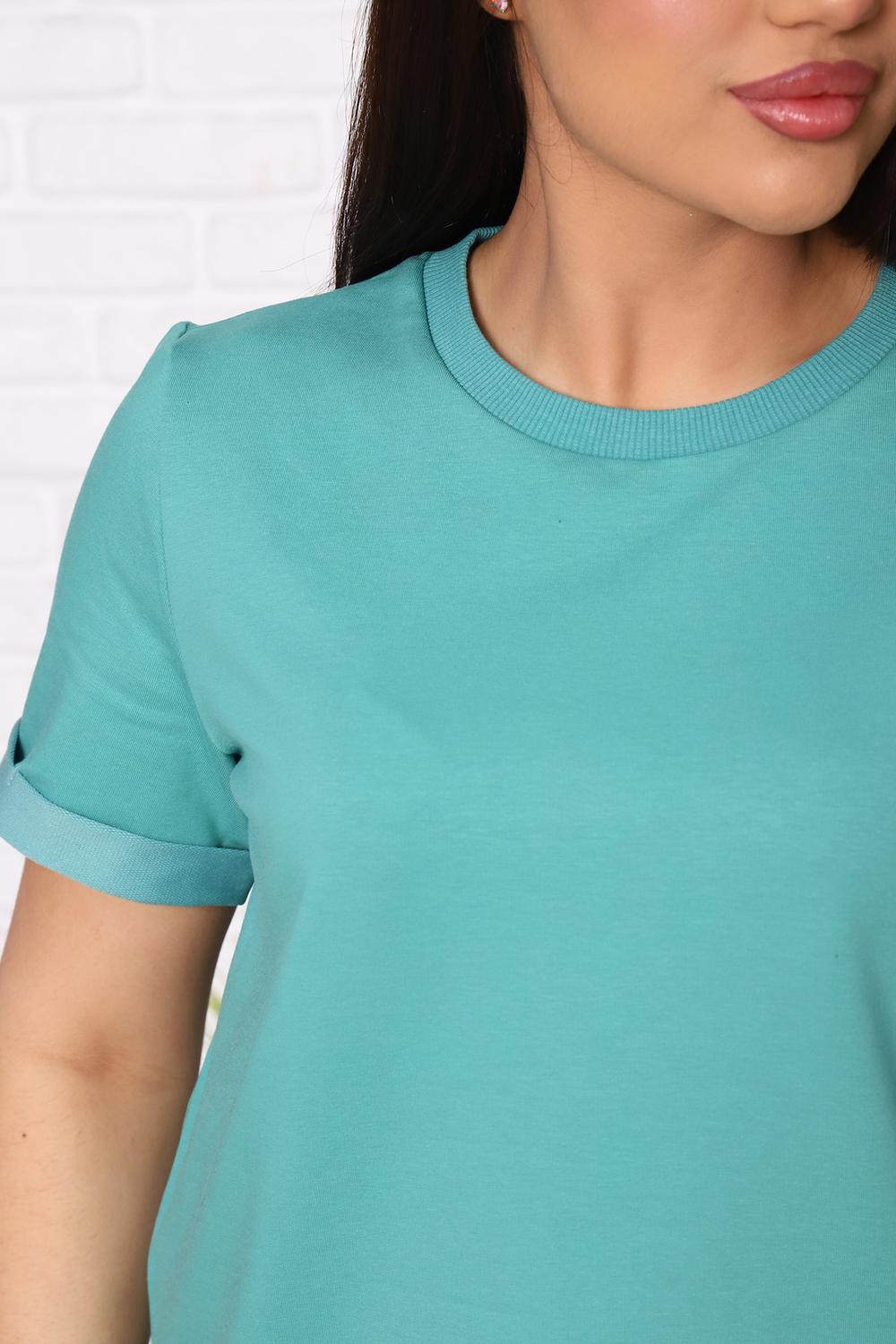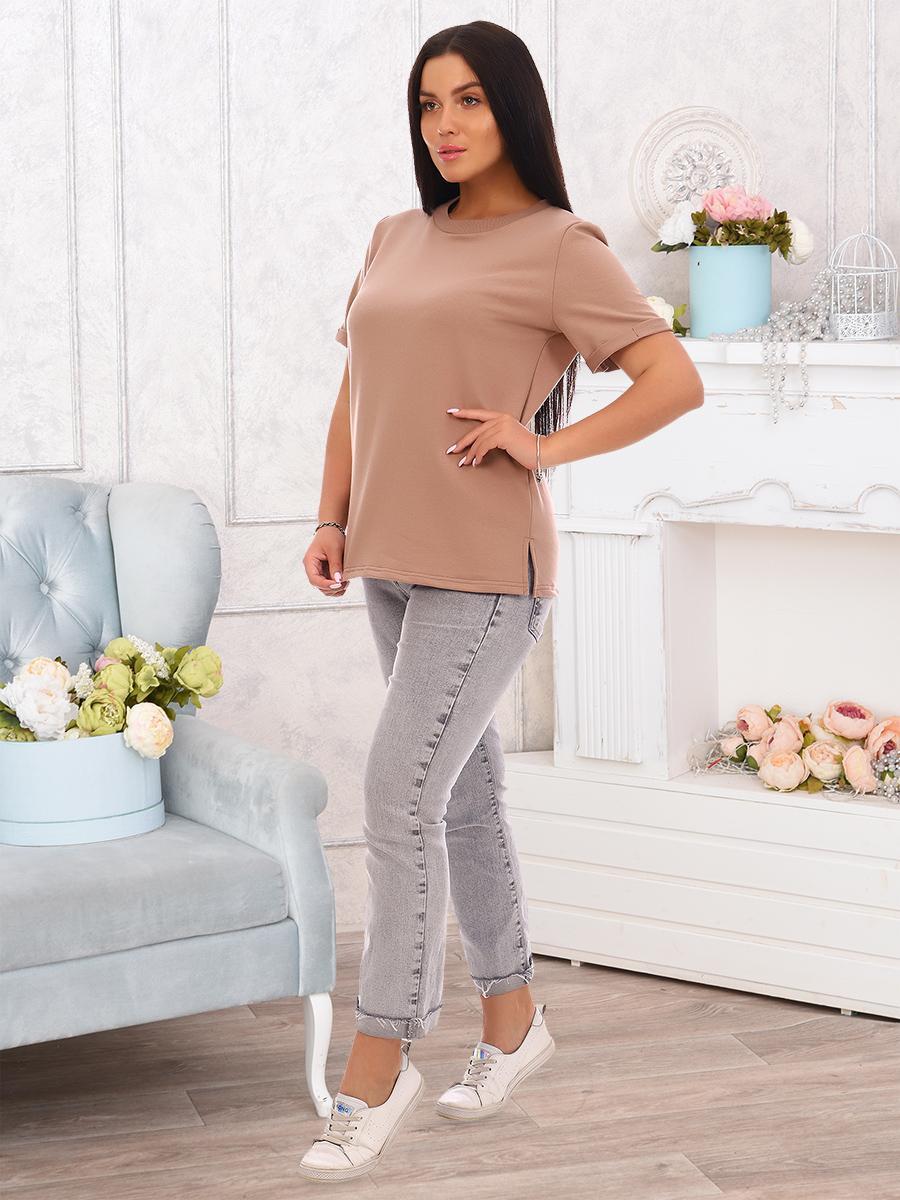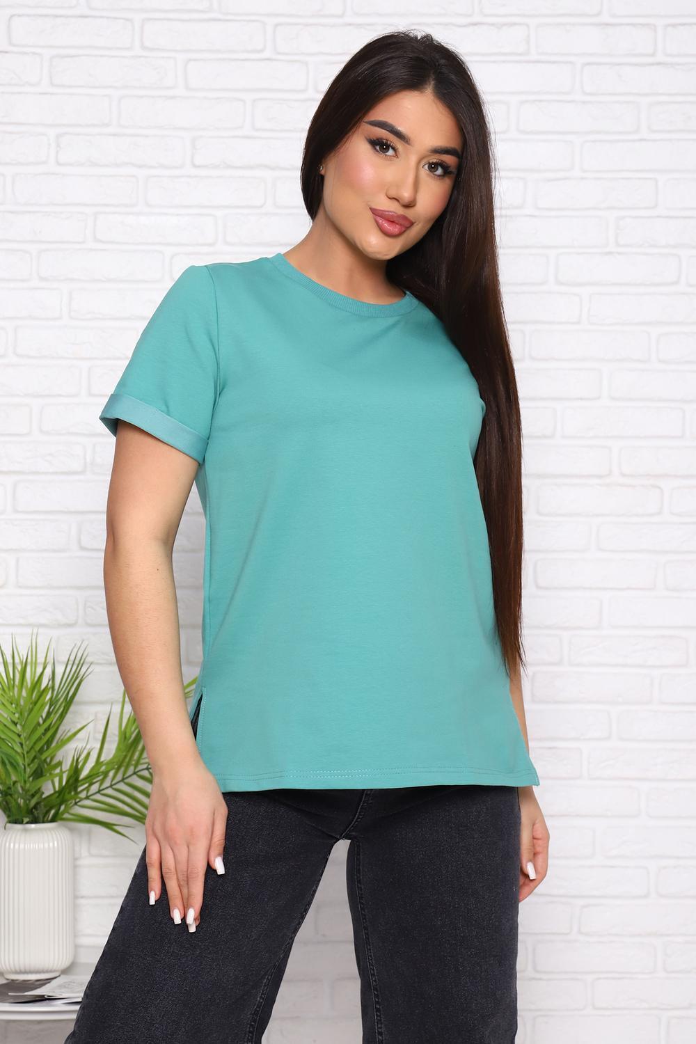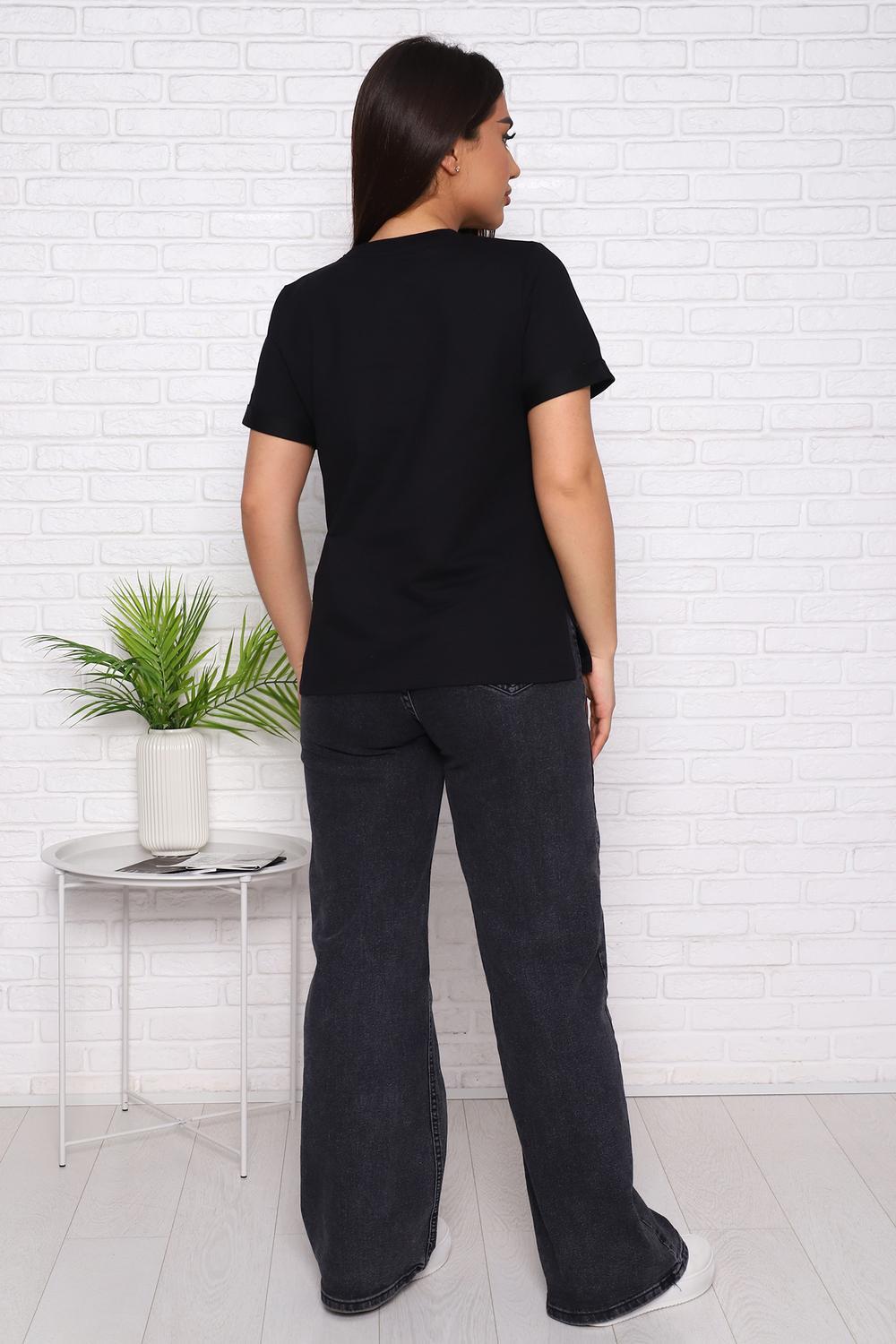 Футболка женская с втачным коротким рукавом. На детали переда фигурная кокетка и застежка на 2 кнопки. На детали спинки — прямая кокетка.
