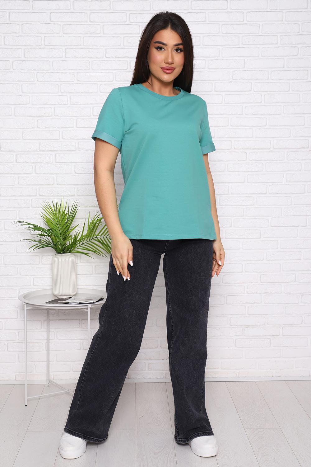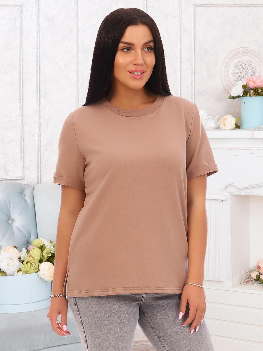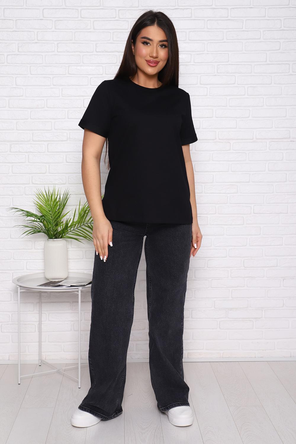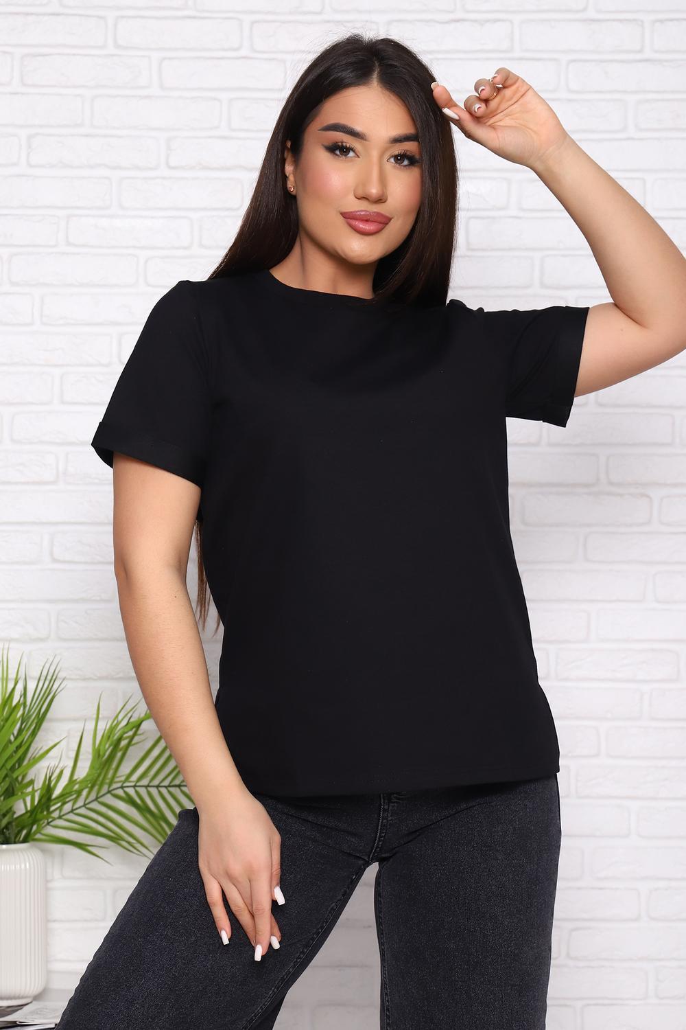 Футболка женская с втачным коротким рукавом. На детали переда фигурная кокетка и застежка на 2 кнопки. На детали спинки — прямая кокетка.
