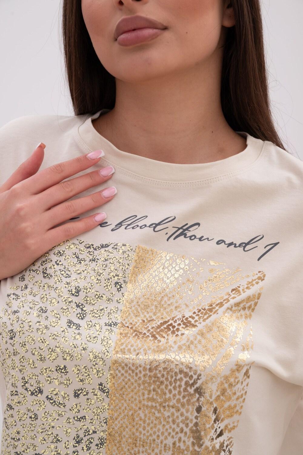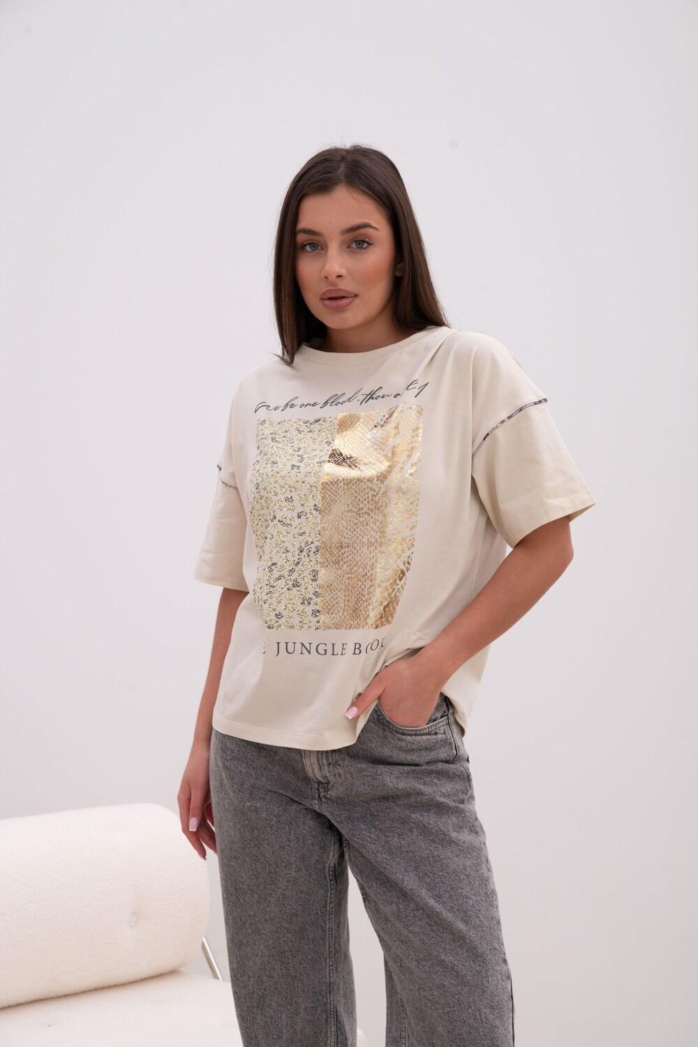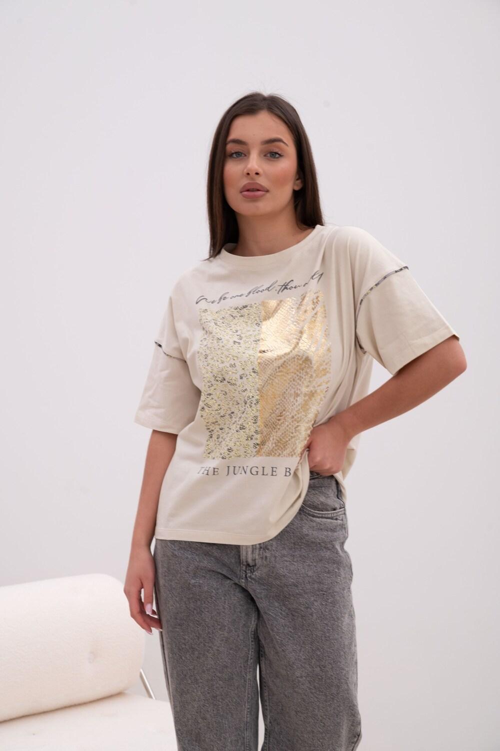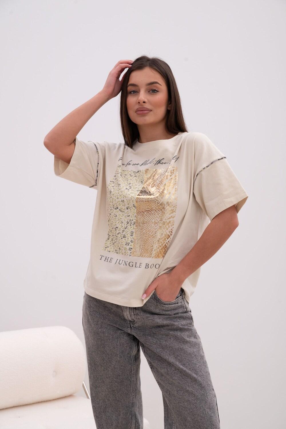 Трикотажная футболка премиум качества с модным принтом от NINEL. Модель выполнена из высококачественного кулирного волокна с лайкрой.