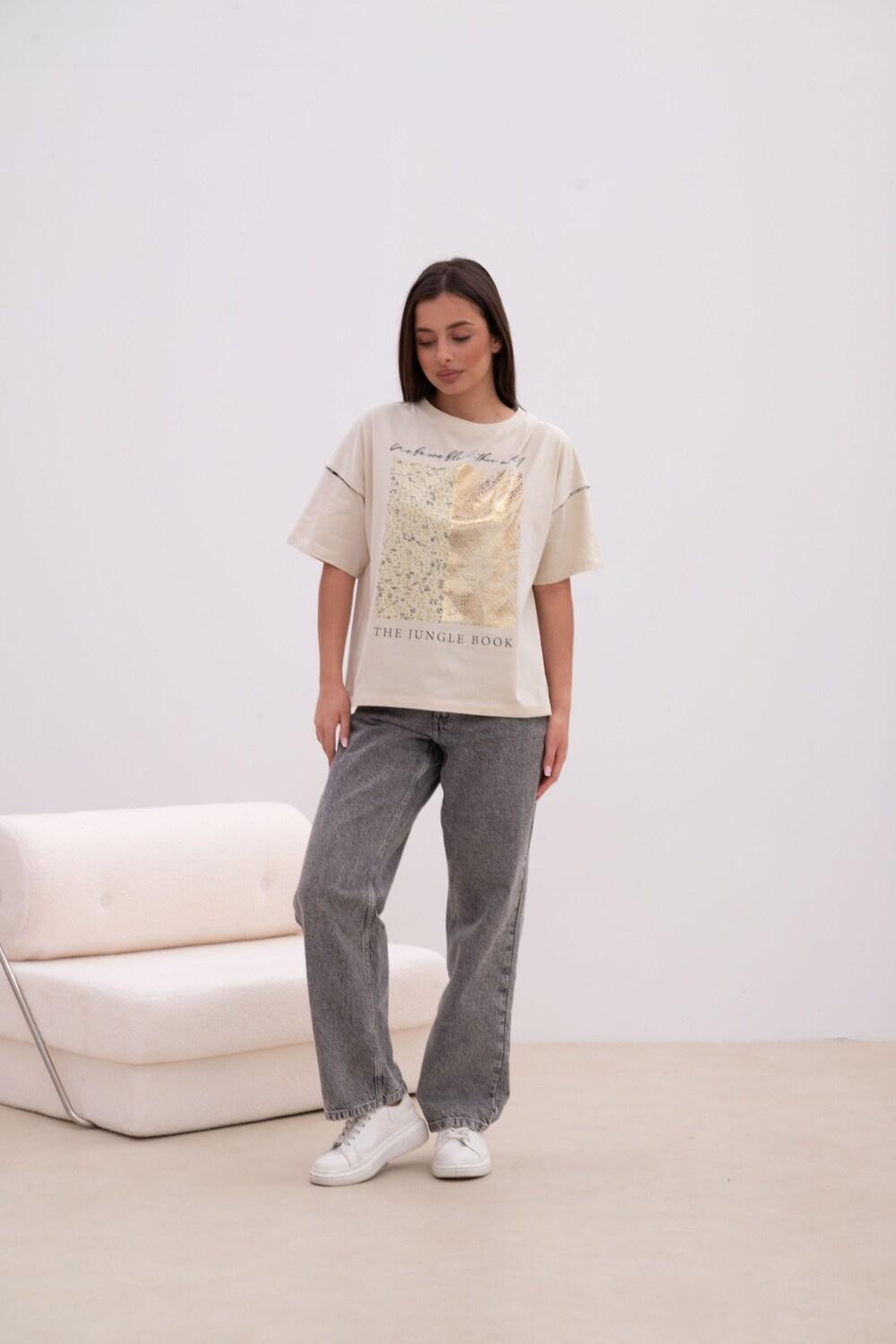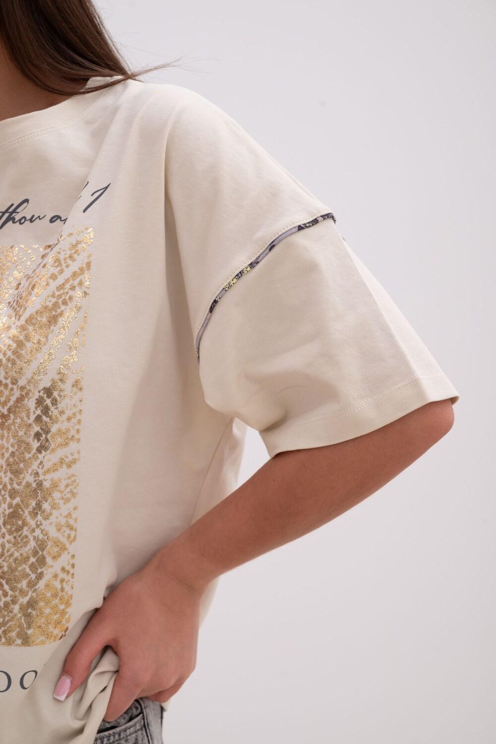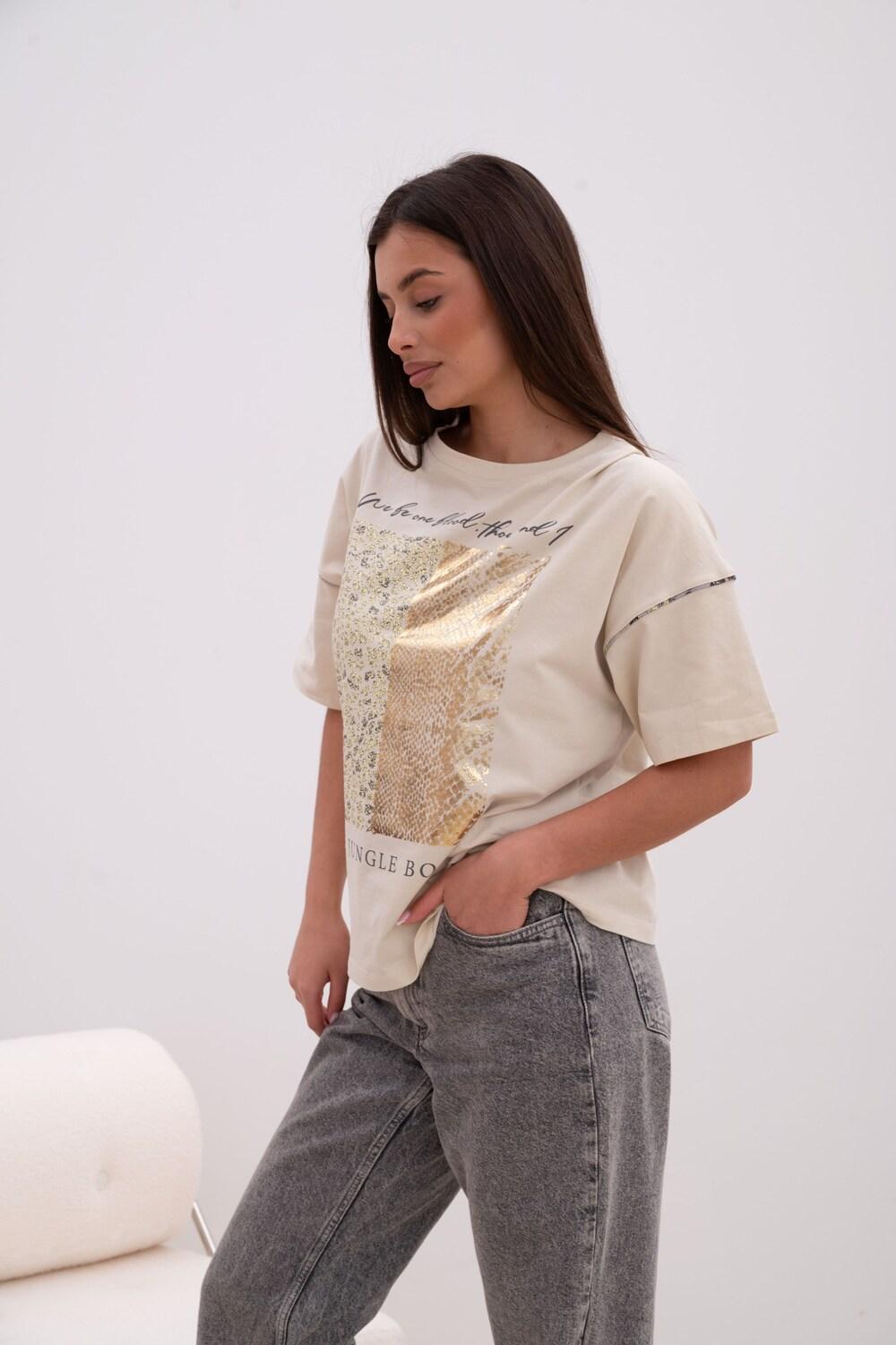 Трикотажная футболка премиум качества с модным принтом от NINEL. Модель выполнена из высококачественного кулирного волокна с лайкрой.