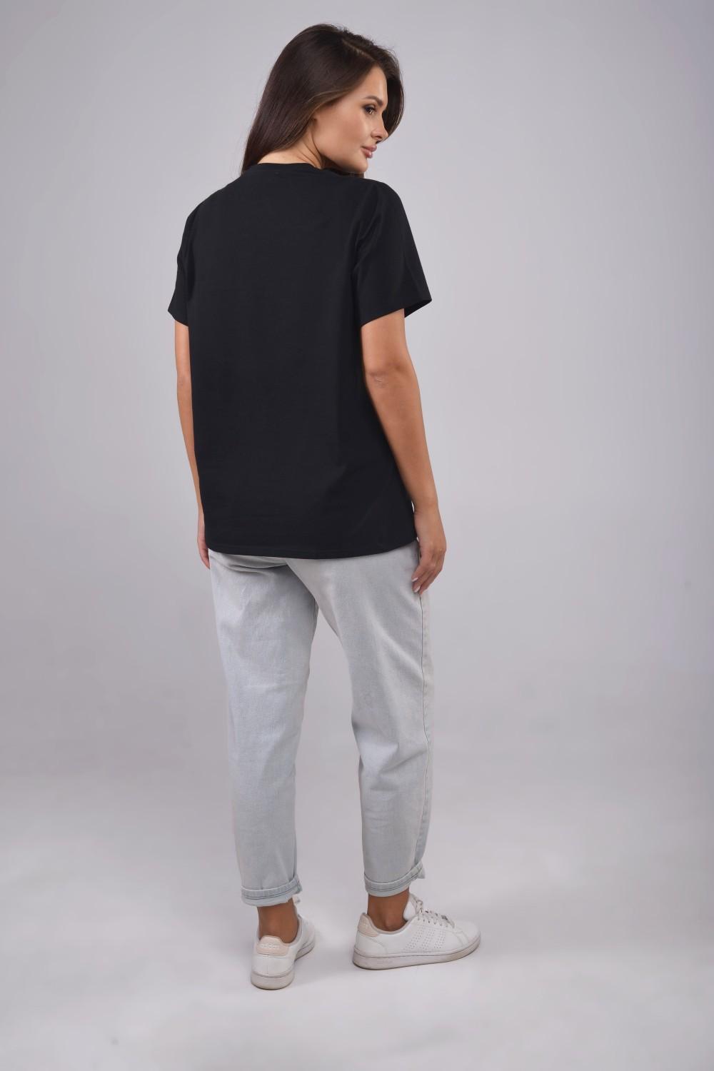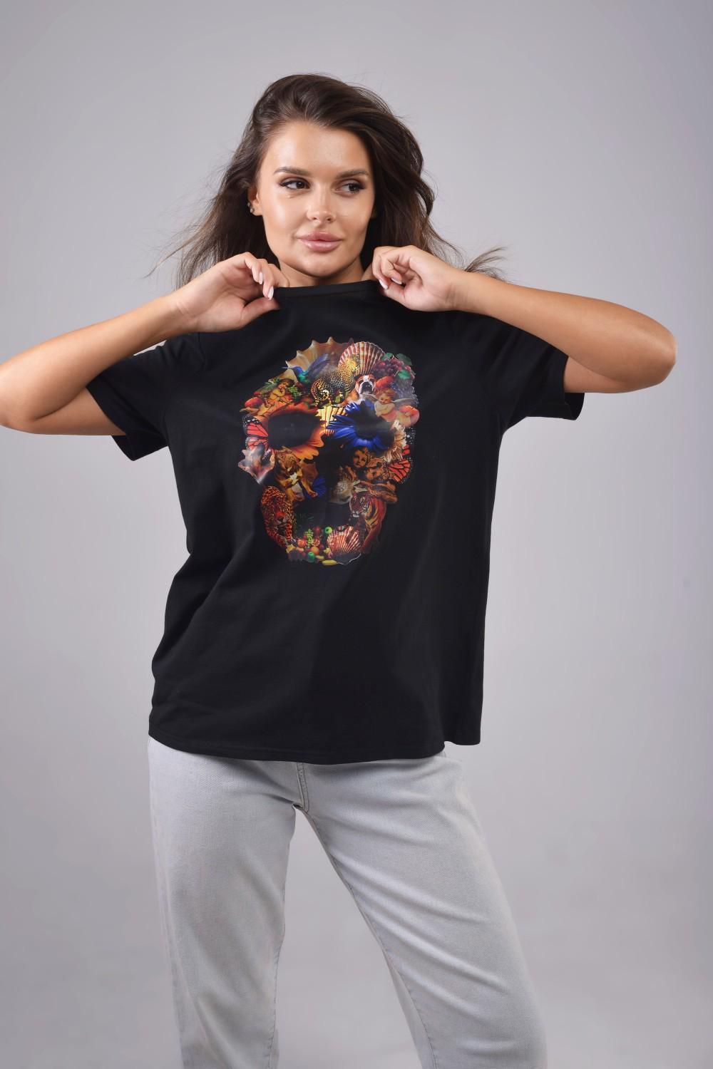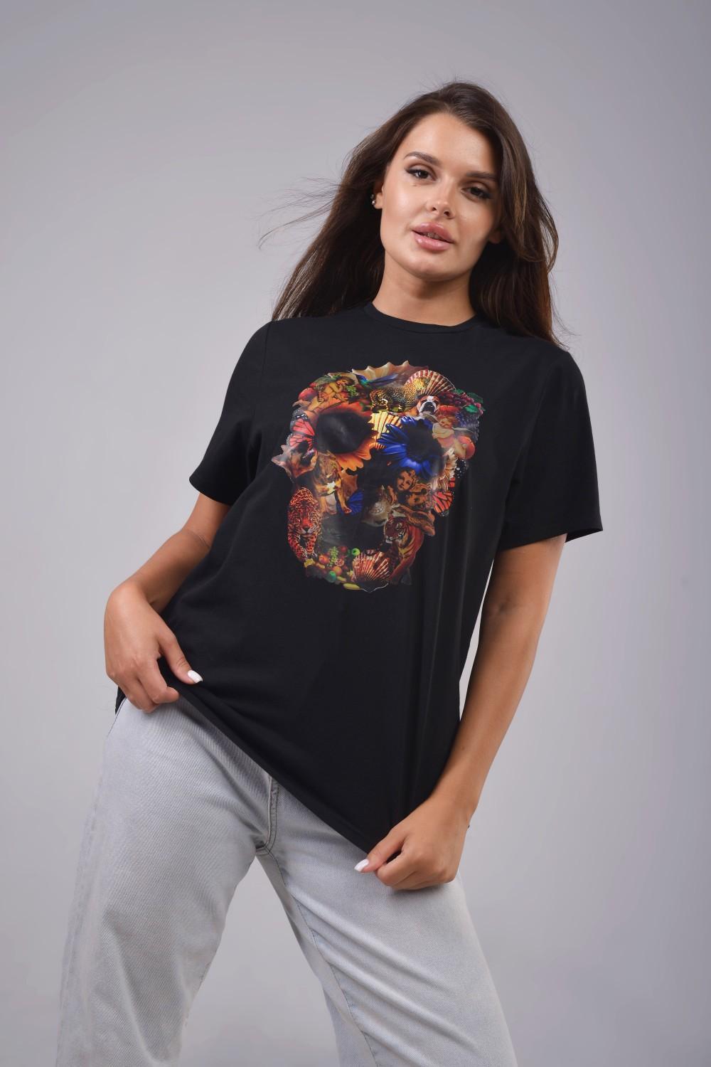 Футболка женская, повседневная, нарядная, спортивная, большие размеры, свободный крой, удлиненная, круглая горловина, стильная, черного цвета из трикотажного хлопок с эластаном, 170 г/м2 с прикольным принтом. Принт трансфер принт - технологией нанесения картинки на изделие с использованием высоких температур. Стилизованный принт черепа - стильное сочетание модного и дерзкого дизайна добавляет выразительности и разнообразию ежедневному стилю одежды.