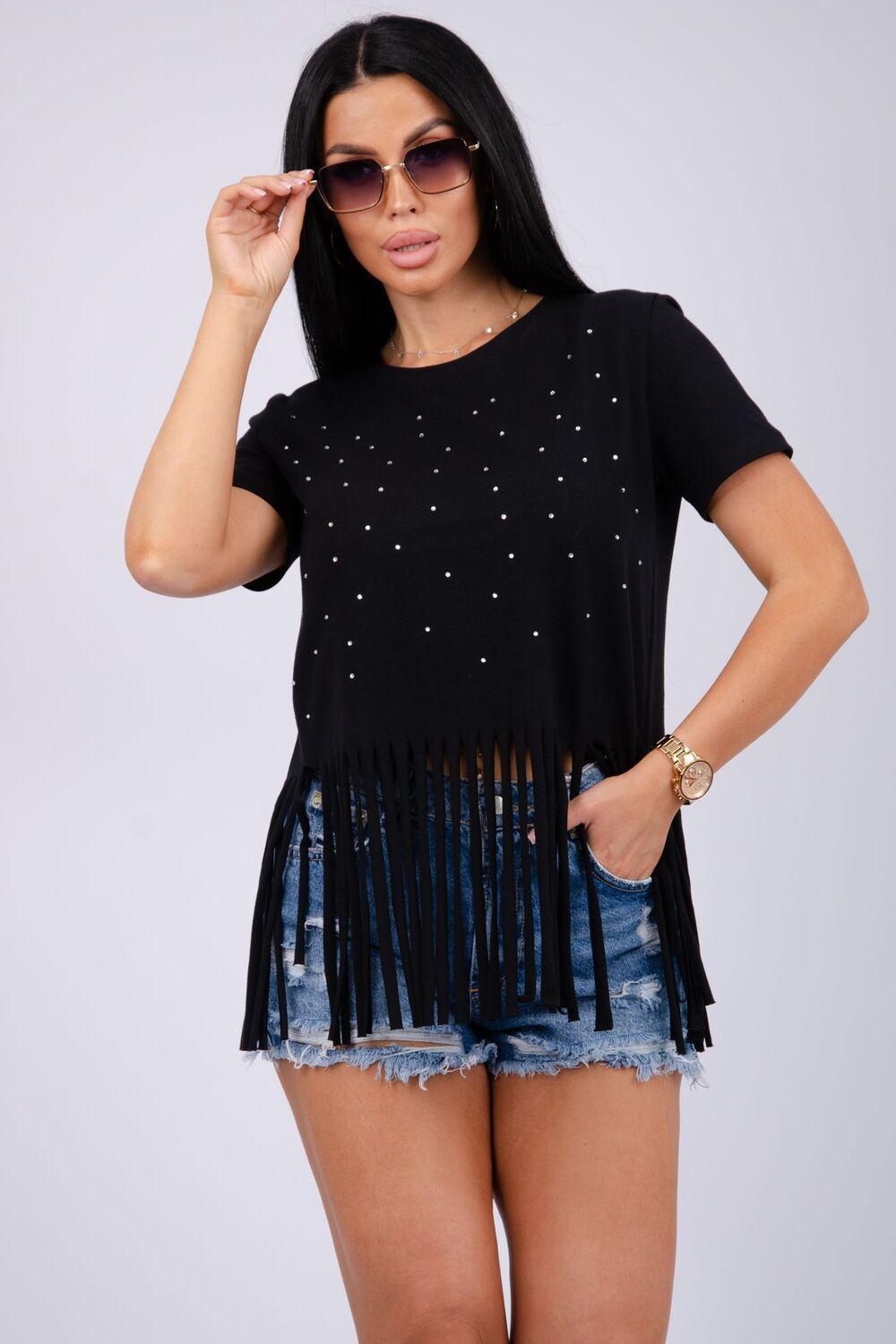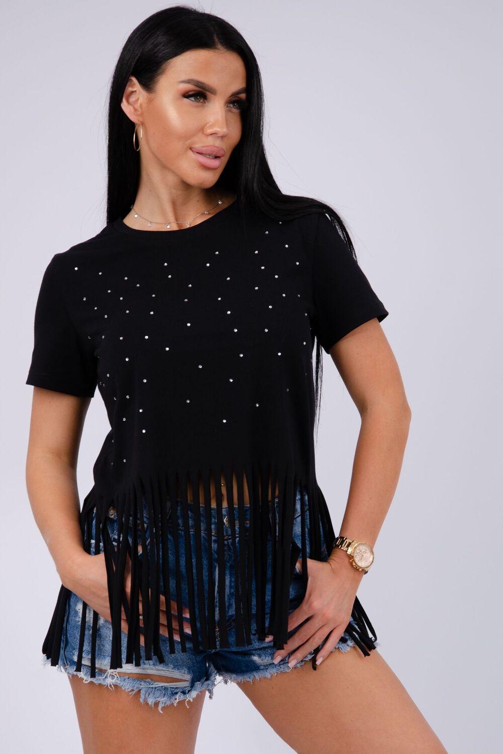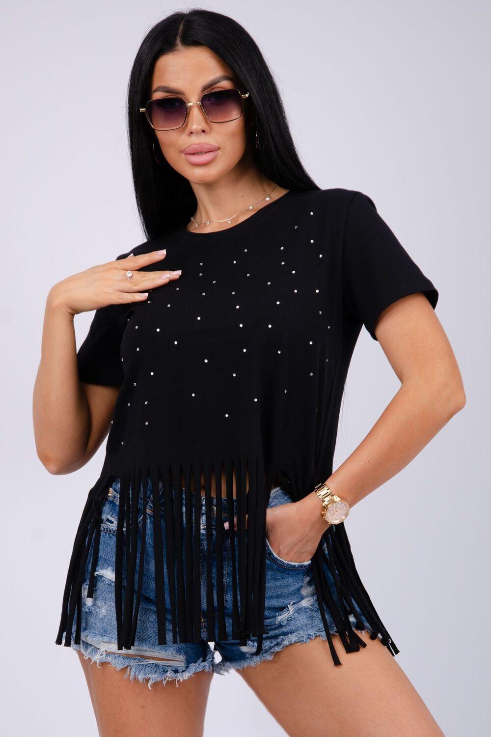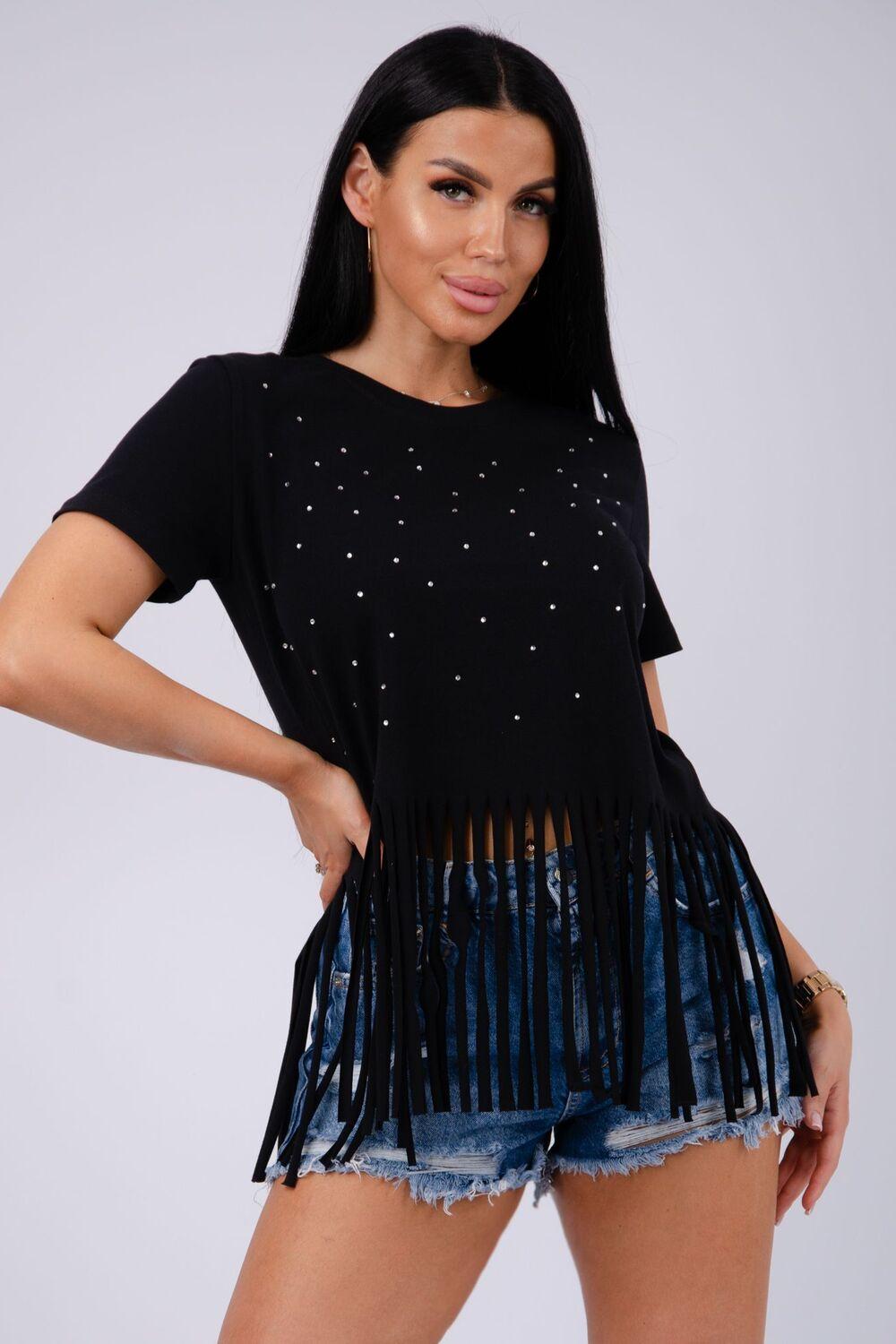 Футболка женская из хлопка с эластаном. Футболка со стразами и бахромой подчеркнет вашу индивидуальность.