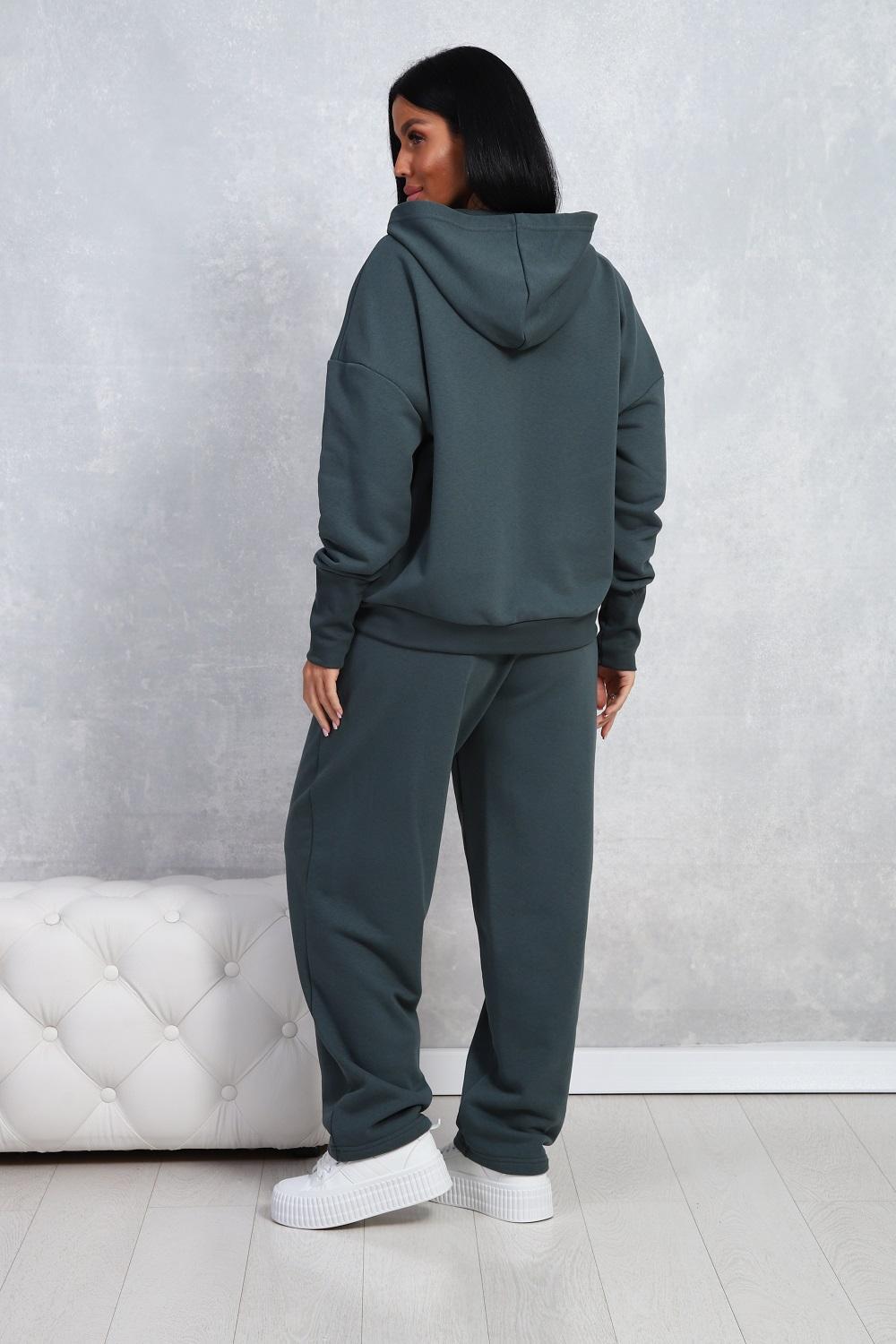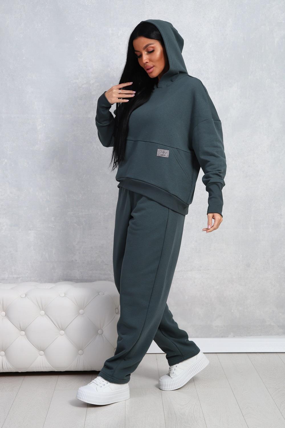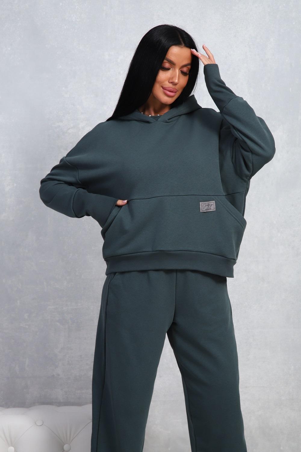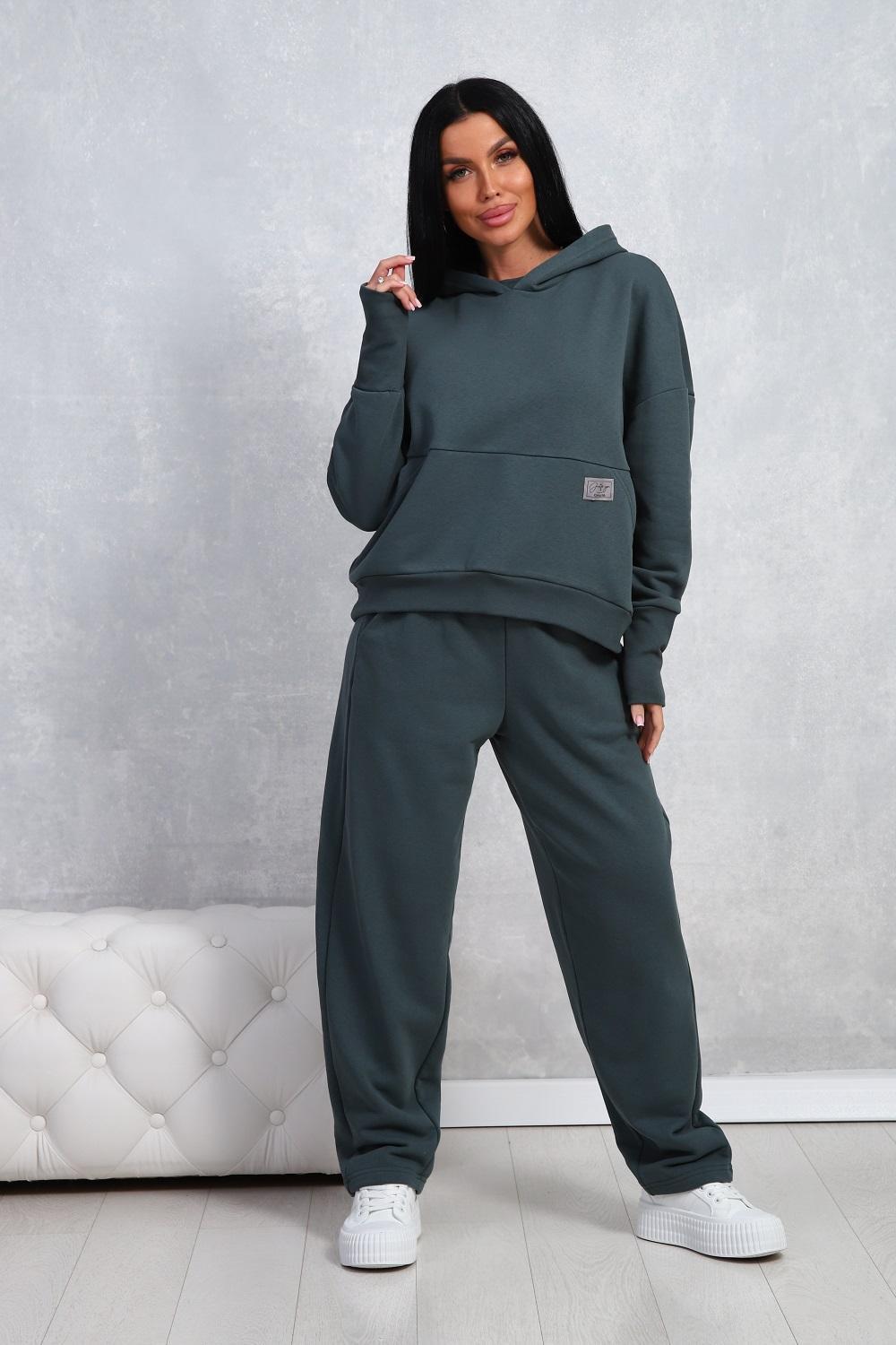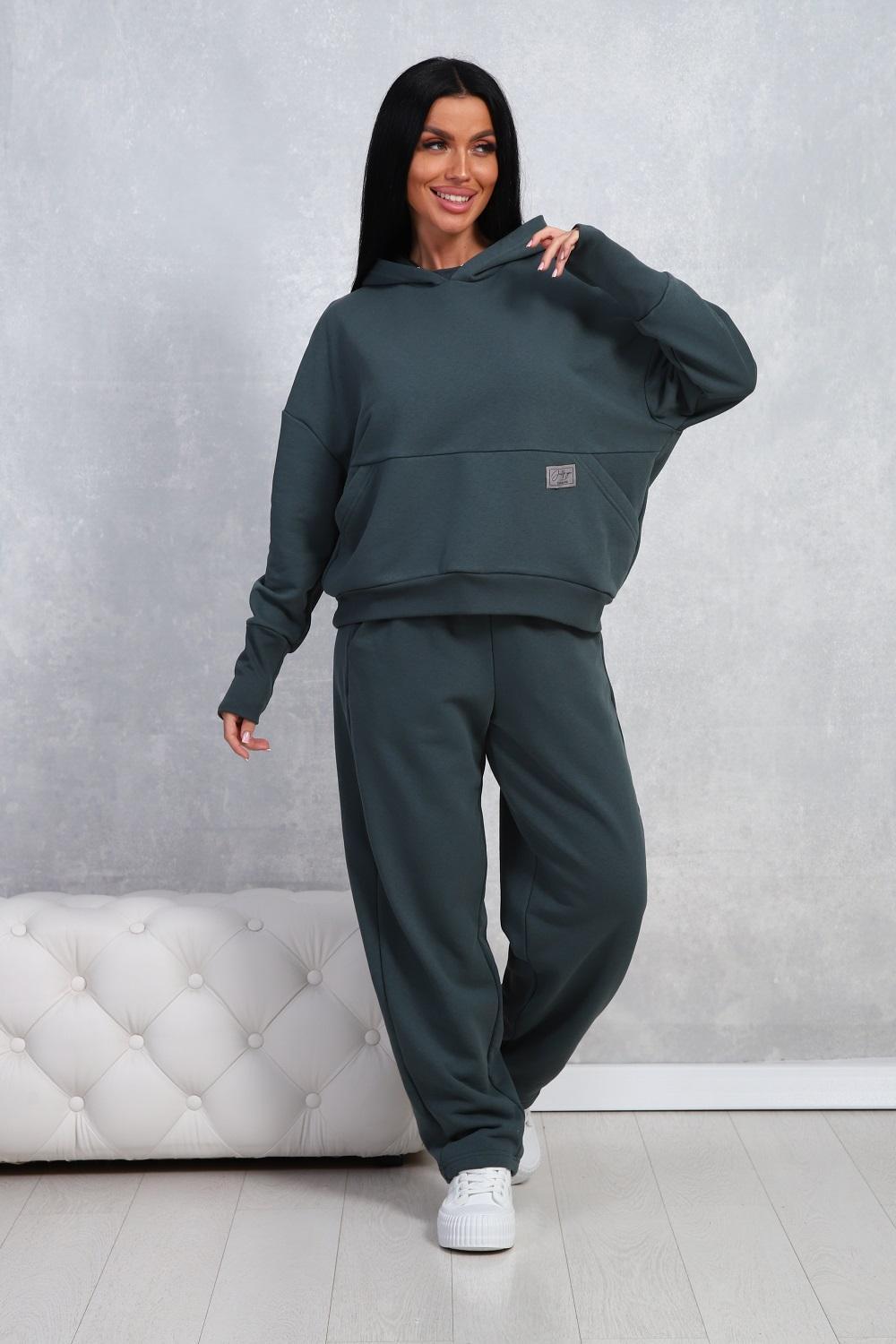 Костюм женский трикотажный: толстовка с капюшоном, карман "Кенгуру", спинка немного длиннее полочки, спущенное плечо, трендовый высокий манжет у рукавов; брюки "бананы" на широком эластичном поясе, с боковыми карманами.