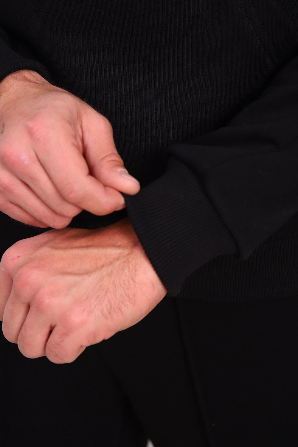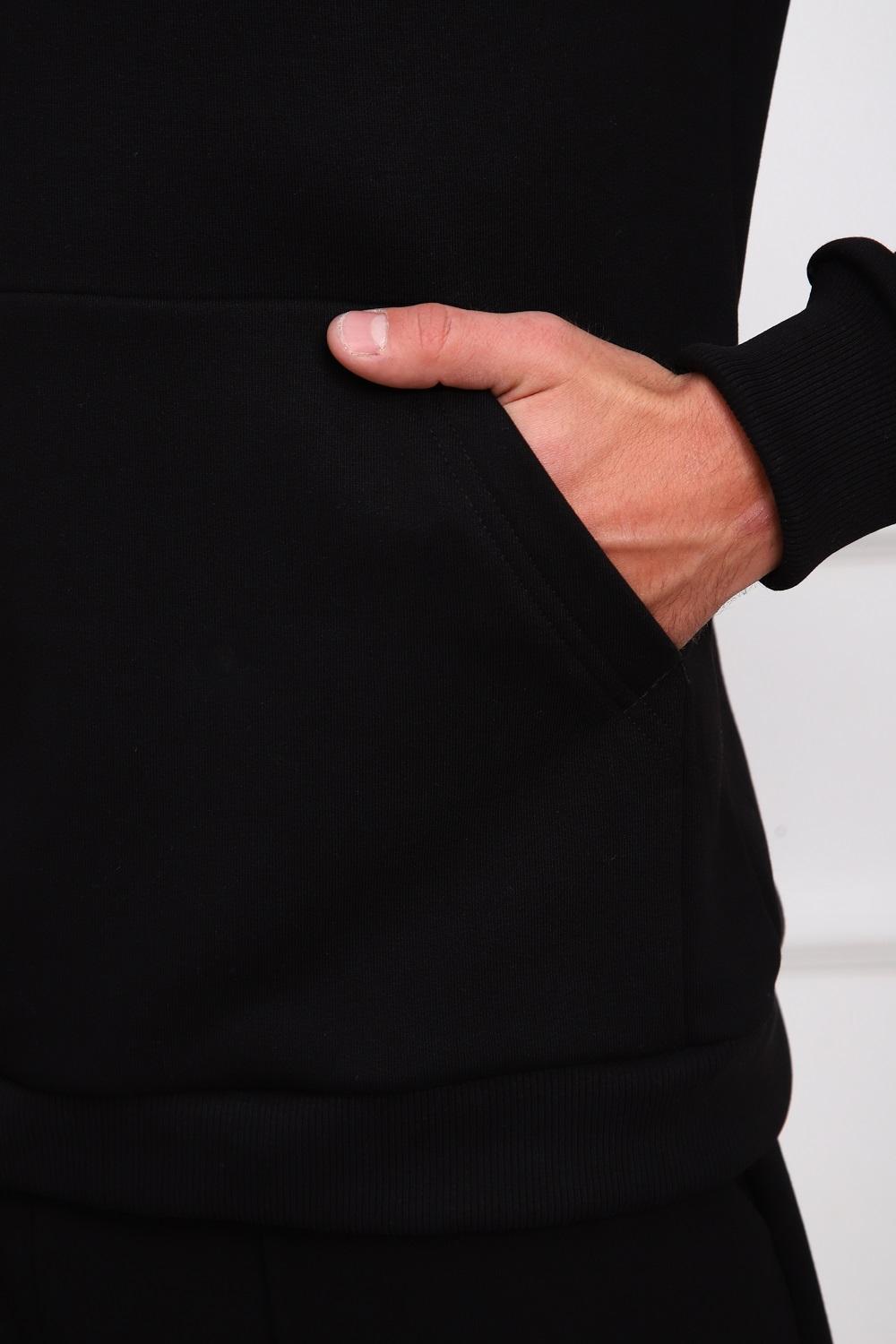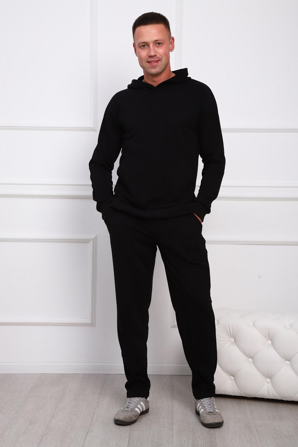 Костюм мужской: толстовка с брюками. Толстовка с карманом-кенгуру и с капюшоном. Рукава - реглан, на манжетах. Брюки на эластичном поясе, с боковыми карманами, с манжетами по низу брючин. Материал - плотный премиальный трикотаж с высоким содержанием хлопка (60%).