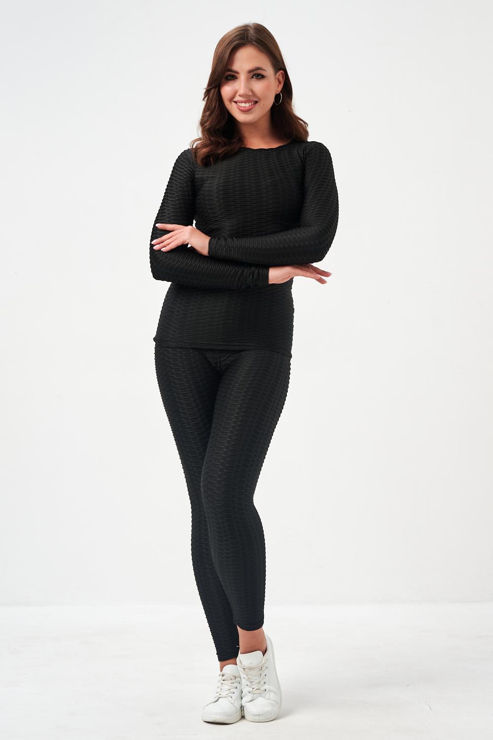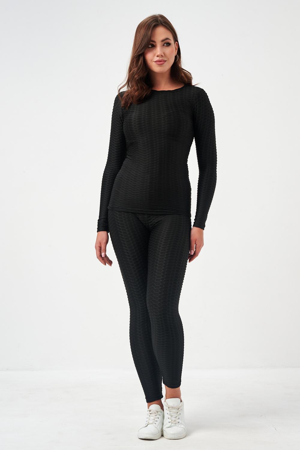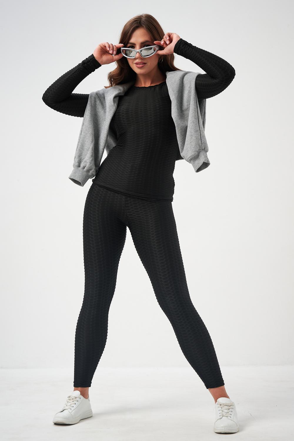 Лосины, входящие в комплект, имеют высокую посадку, которая обеспечивает поддержку и формирует силуэт. Плоские швы предотвращают натирание и дискомфорт даже во время самых активных движений. Эластичный пояс надежно фиксирует лосины на талии, не сковывая движений.
