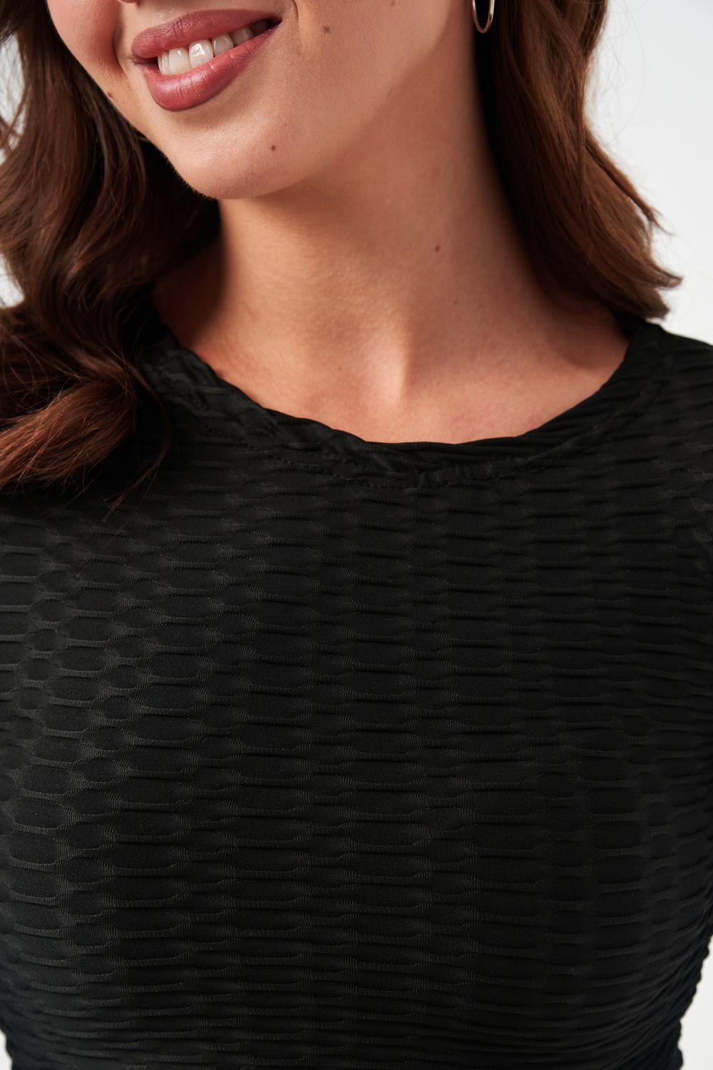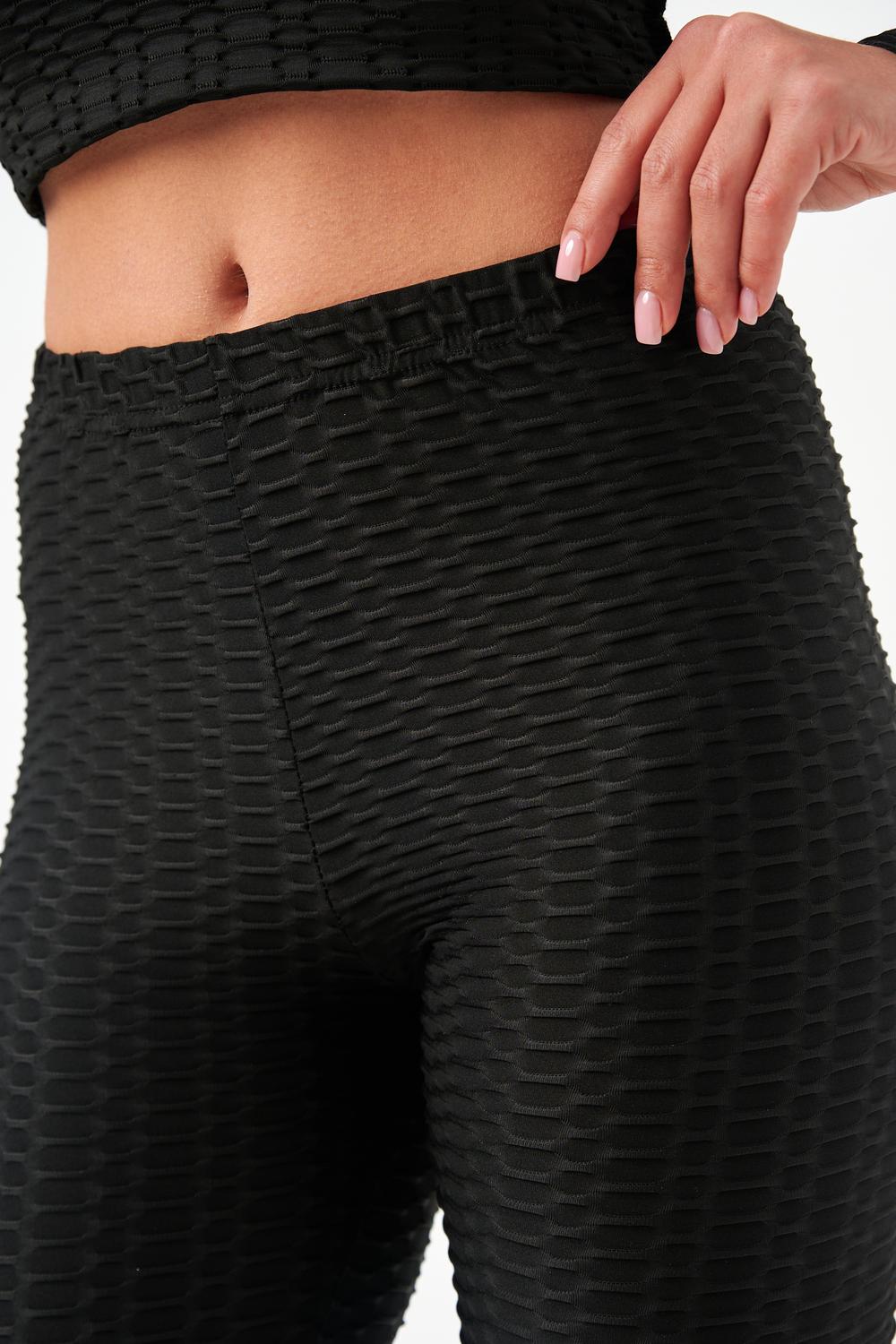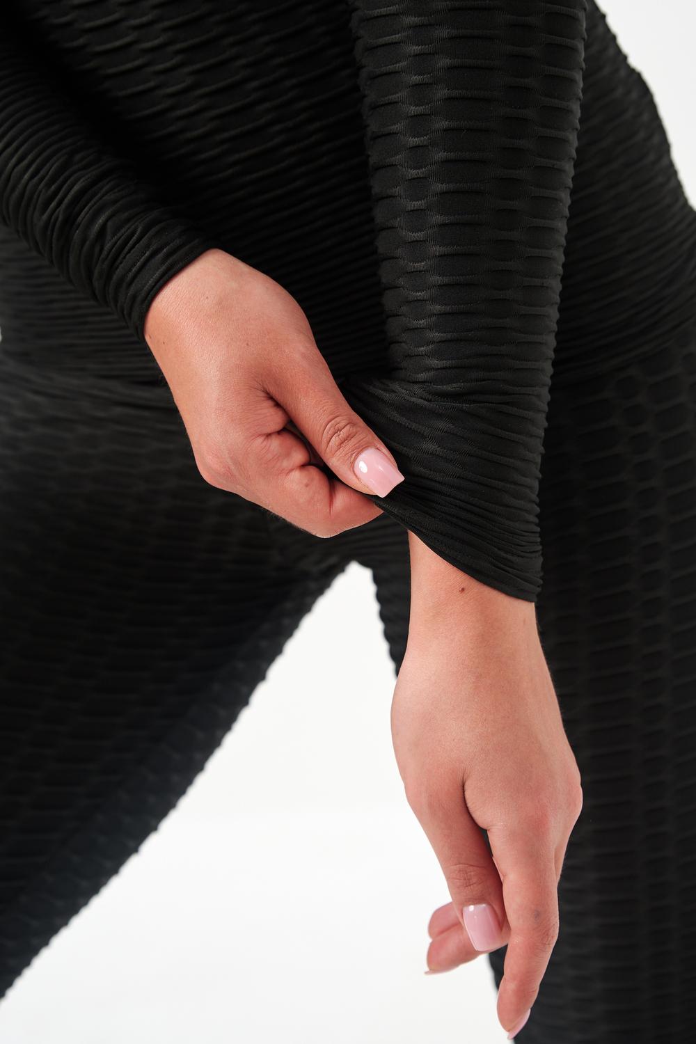 Лосины, входящие в комплект, имеют высокую посадку, которая обеспечивает поддержку и формирует силуэт. Плоские швы предотвращают натирание и дискомфорт даже во время самых активных движений. Эластичный пояс надежно фиксирует лосины на талии, не сковывая движений.