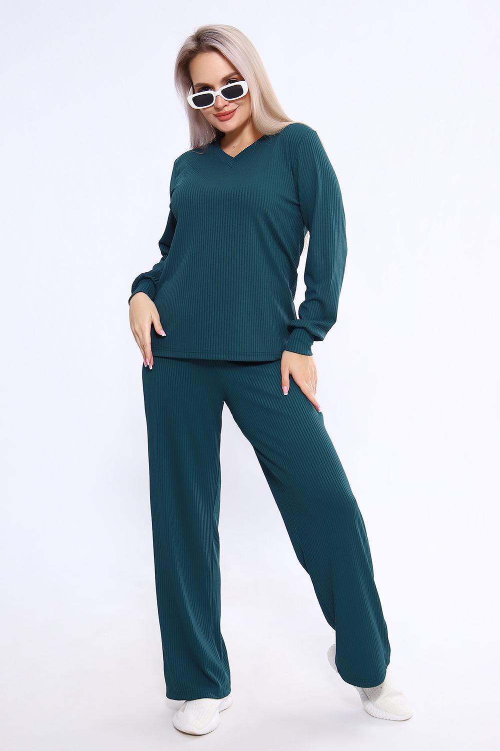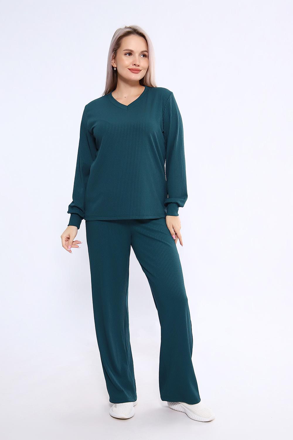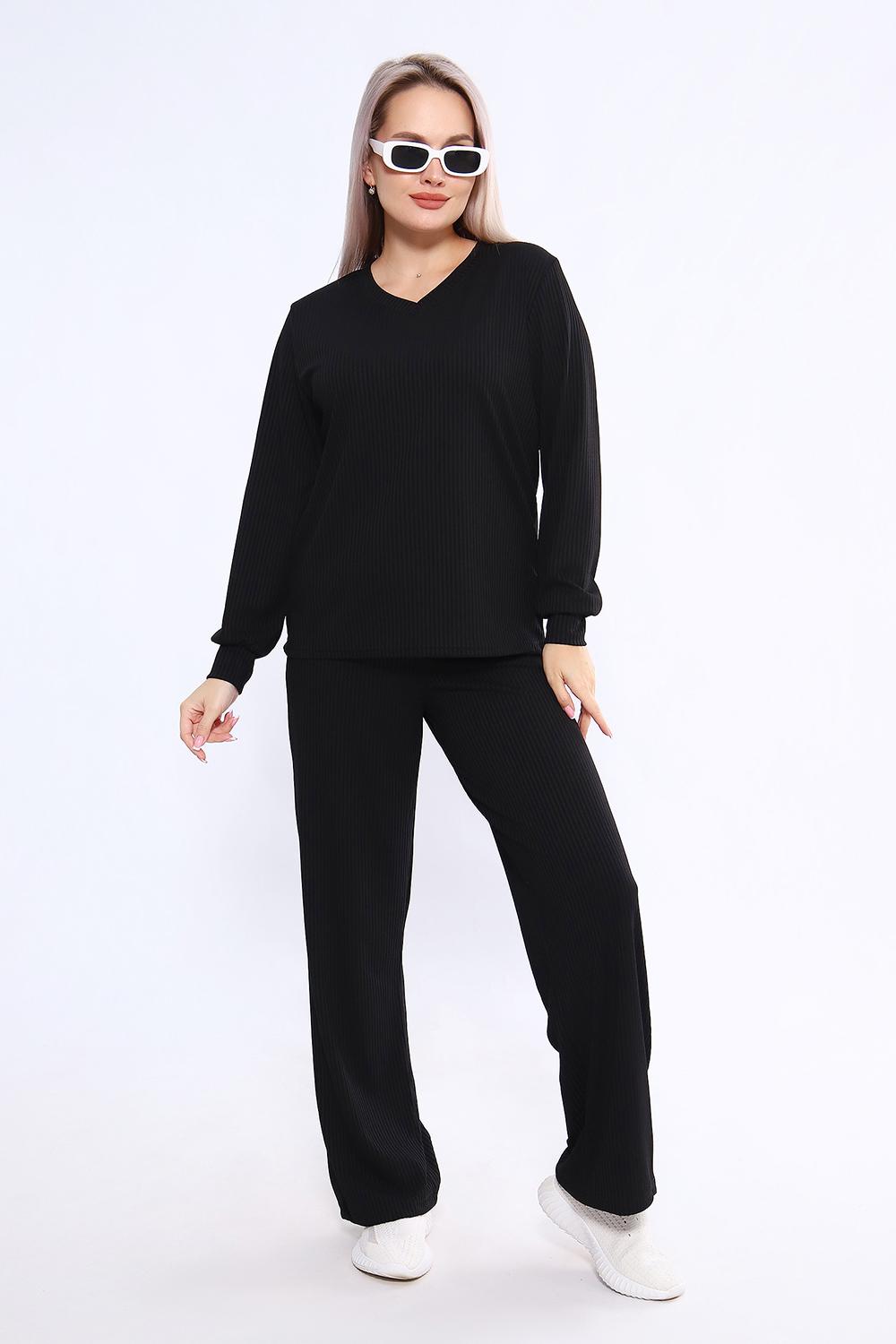 Женский костюм из трикотажа "лапша" (рубчик) состоит из лонгслива с длинными рукавами и манжетами и свободных брюк, выполнен из материала с преобладанием полиэстера (95%) и добавлением спандекса (5%), что обеспечивает комфорт и практичность. Костюм подходит как для повседневного ношения, так и в качестве домашней одежды, и представлен в широком размерном диапазоне от 46 до 60