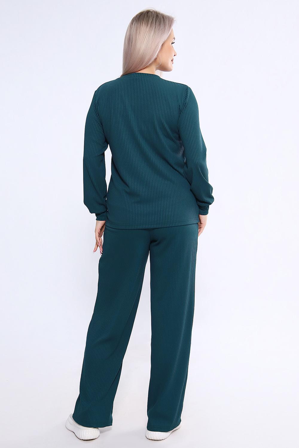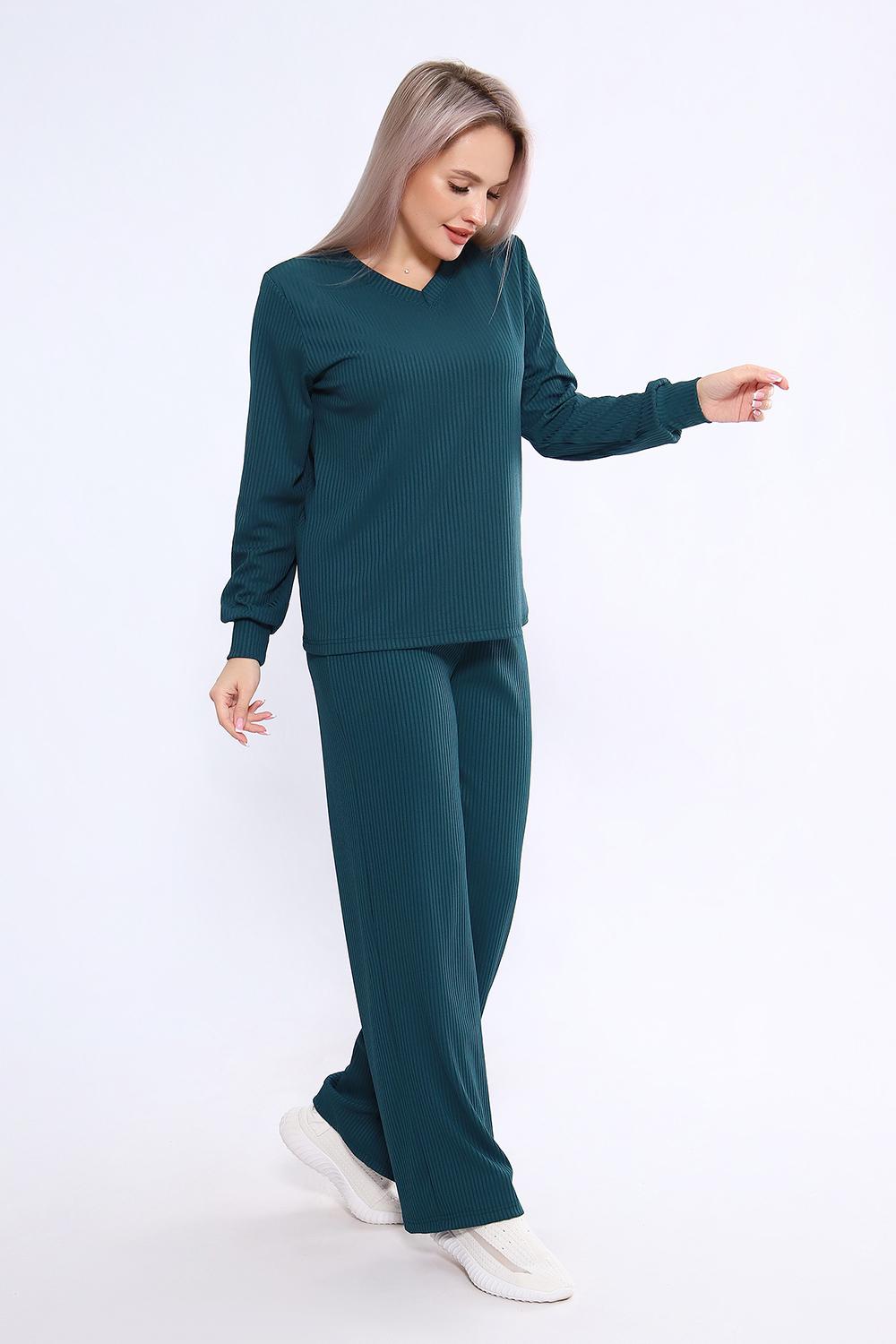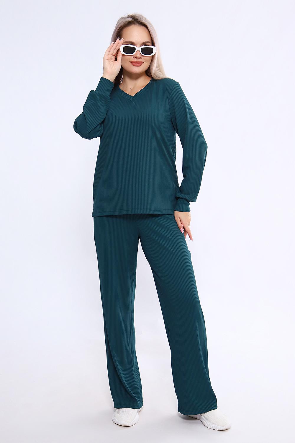 Женский костюм из трикотажа "лапша" (рубчик) состоит из лонгслива с длинными рукавами и манжетами и свободных брюк, выполнен из материала с преобладанием полиэстера (95%) и добавлением спандекса (5%), что обеспечивает комфорт и практичность. Костюм подходит как для повседневного ношения, так и в качестве домашней одежды, и представлен в широком размерном диапазоне от 46 до 60