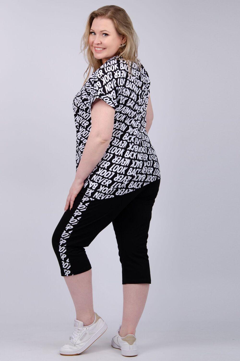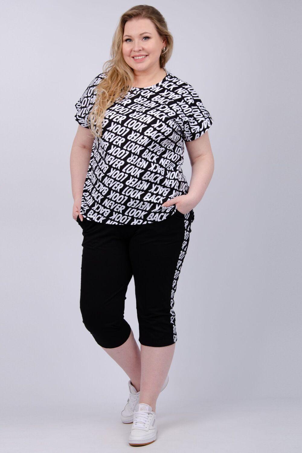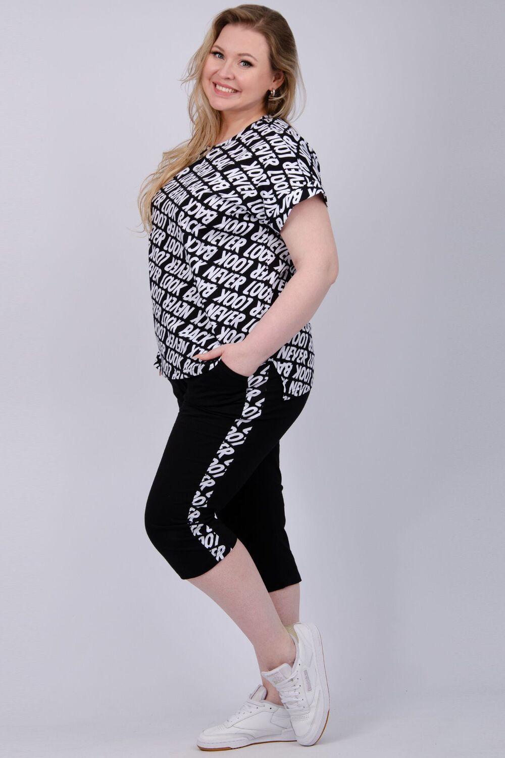 Женский костюм из футболки и бриджей — отличный выбор для дачного сезона и прогулок. Бриджи черного цвета из 100% хлопка обеспечивают комфорт и свободу движения, что особенно важно для активного отдыха на свежем воздухе или дома.