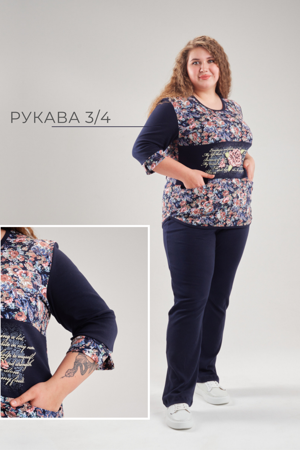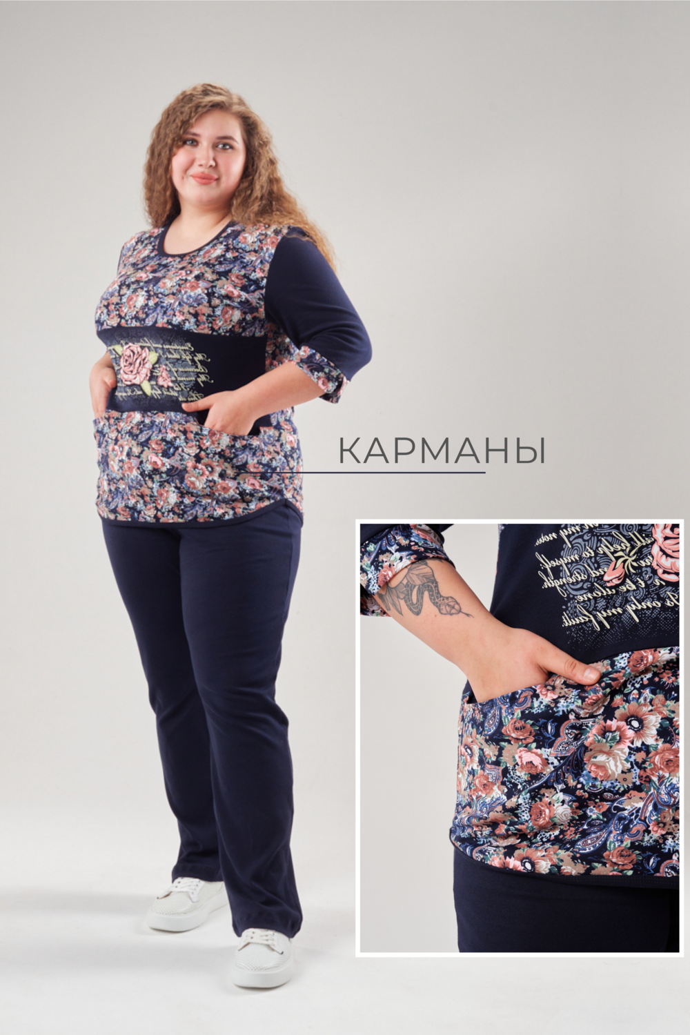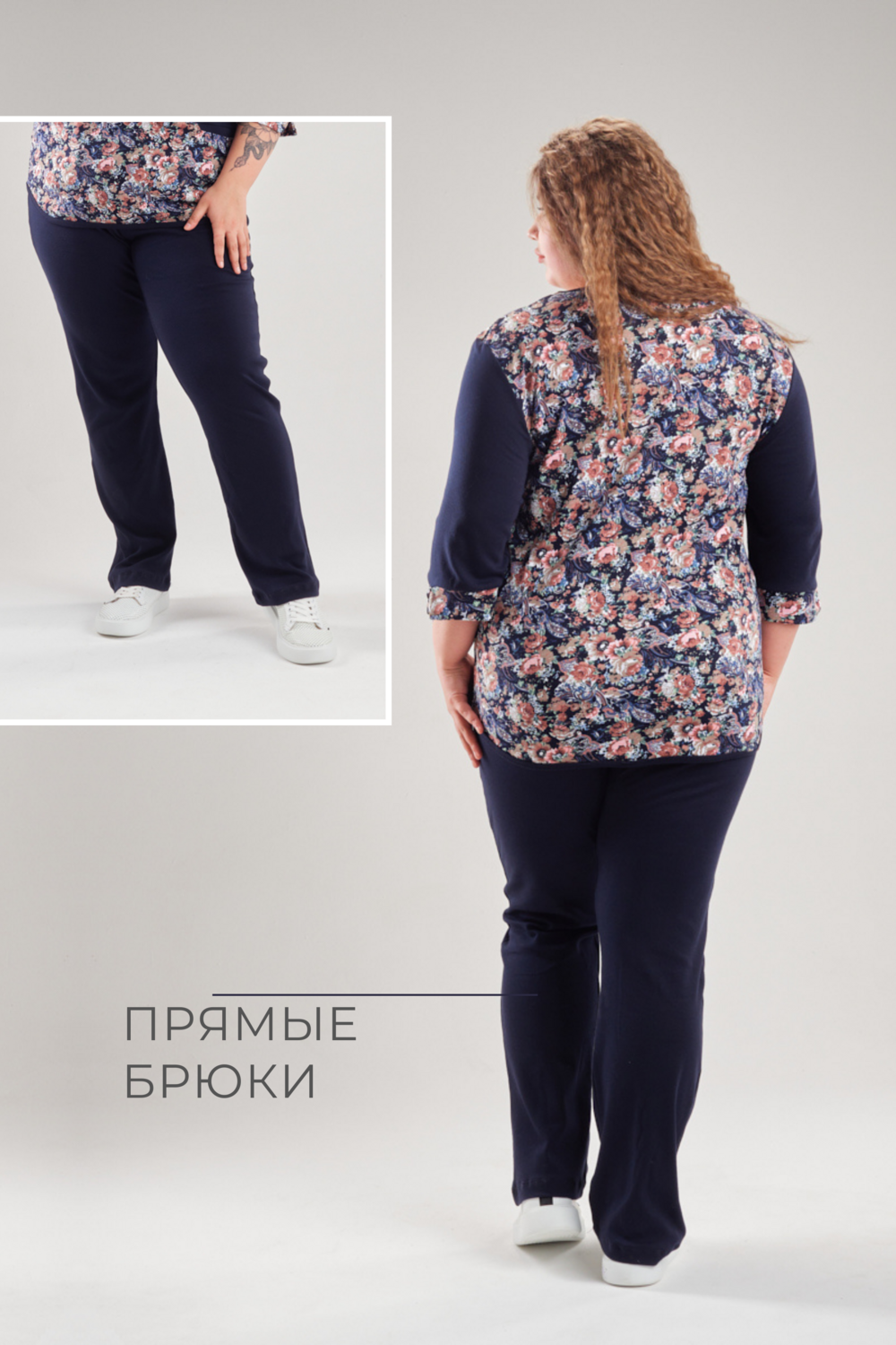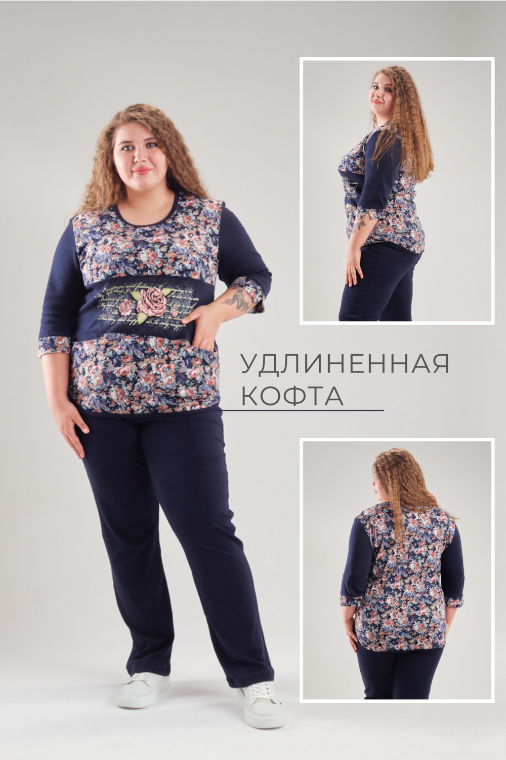 Женский костюм с брюками из хлопкового трикотажа и удлиненной кофтой с карманами.