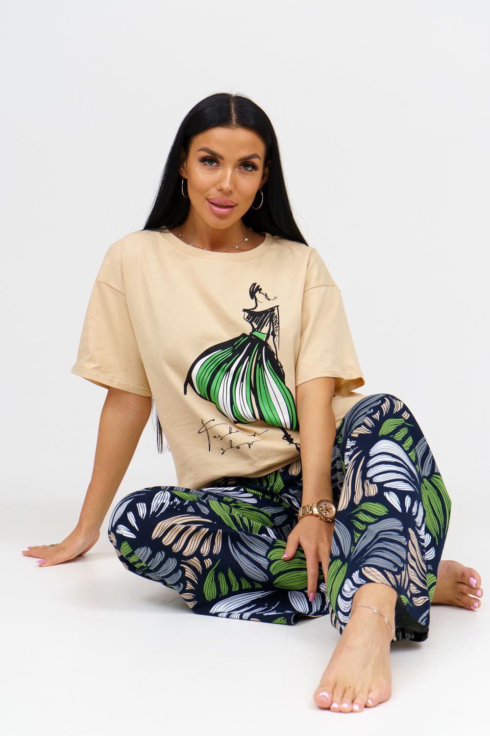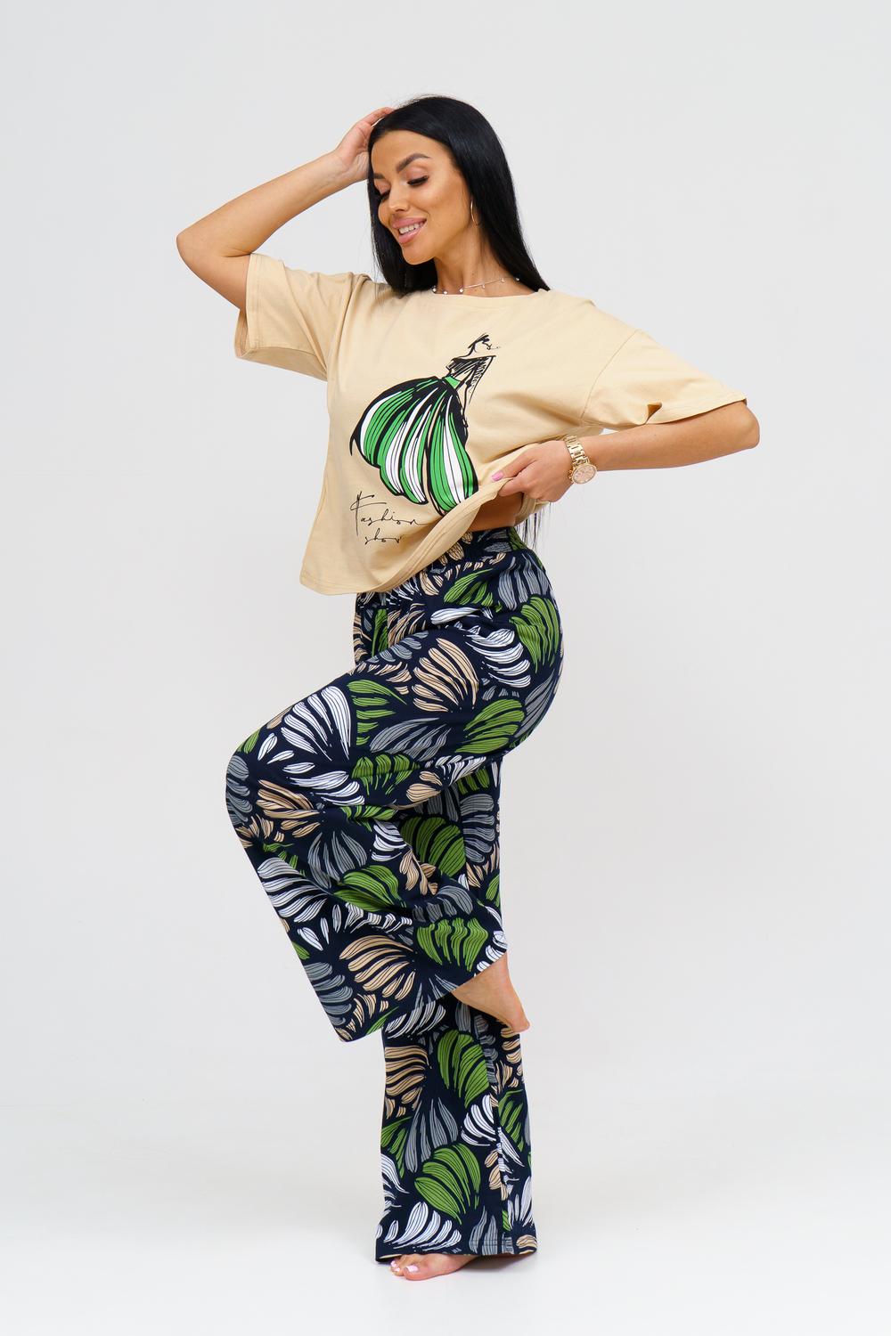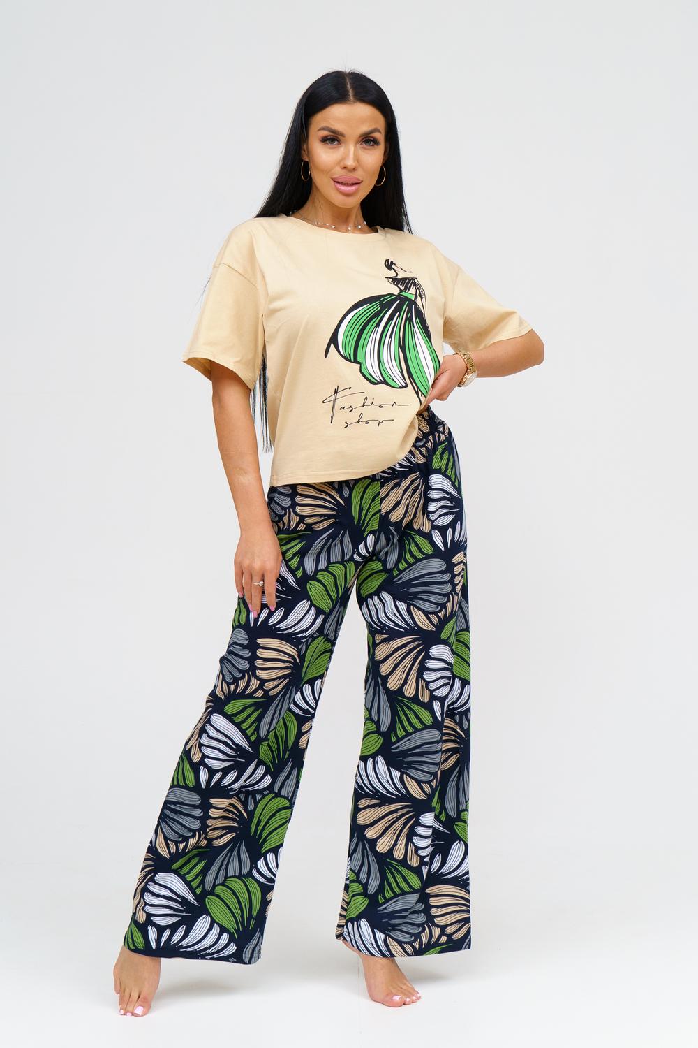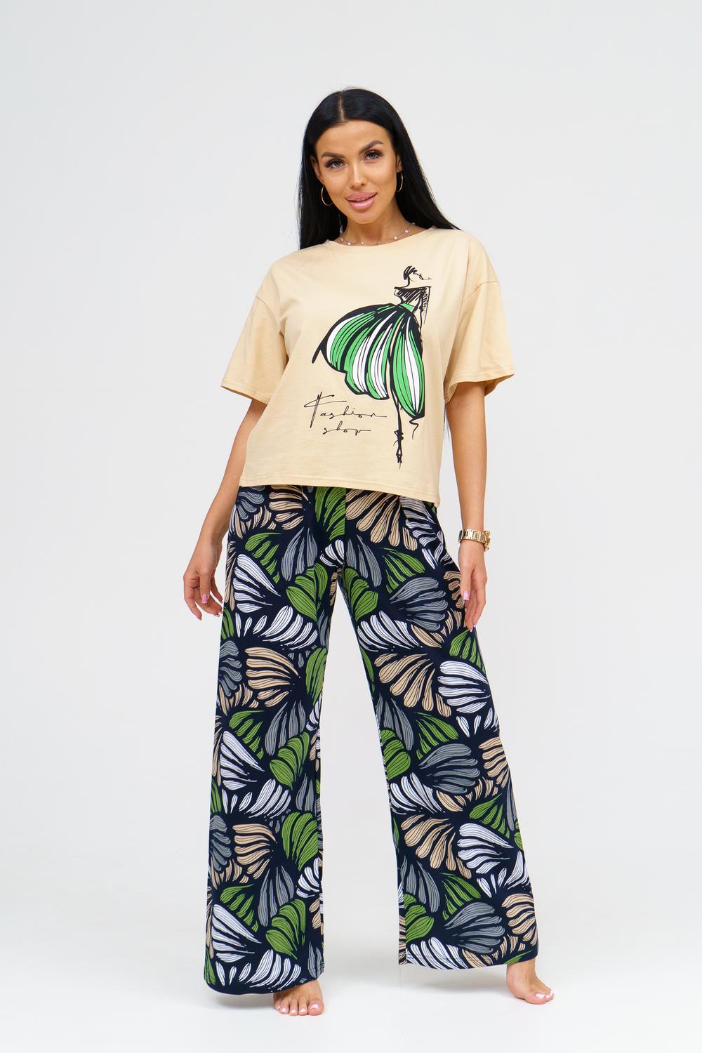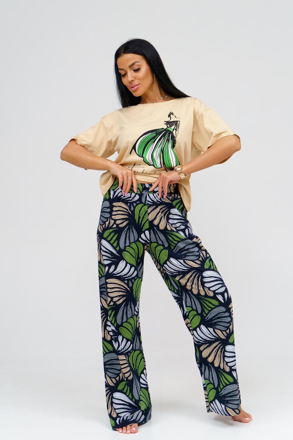 Комплект из широких брюк без бокового шва и оригинальной футболки с печатью. Пояс брюк отстрочен на спецмашине. Срезы футболки подшиты на плоскошовке.