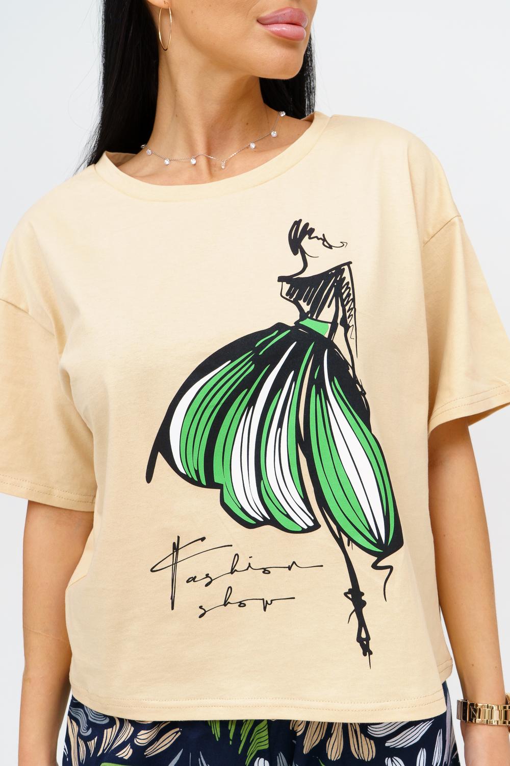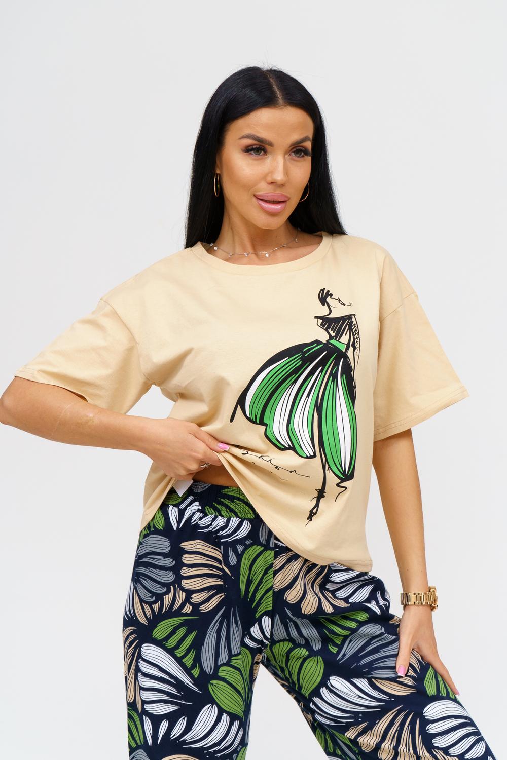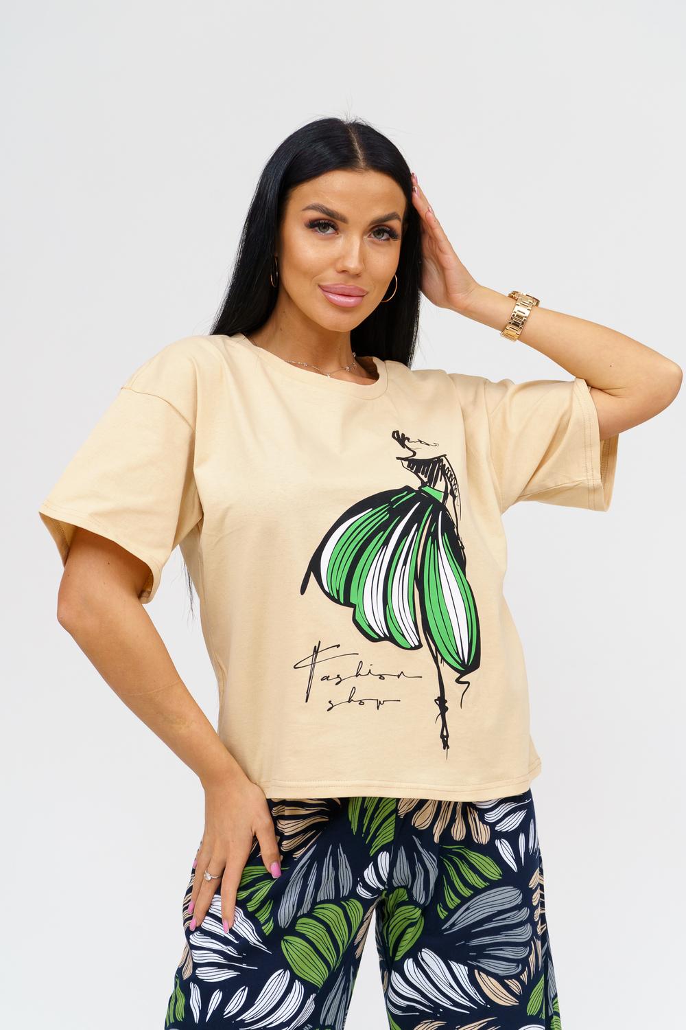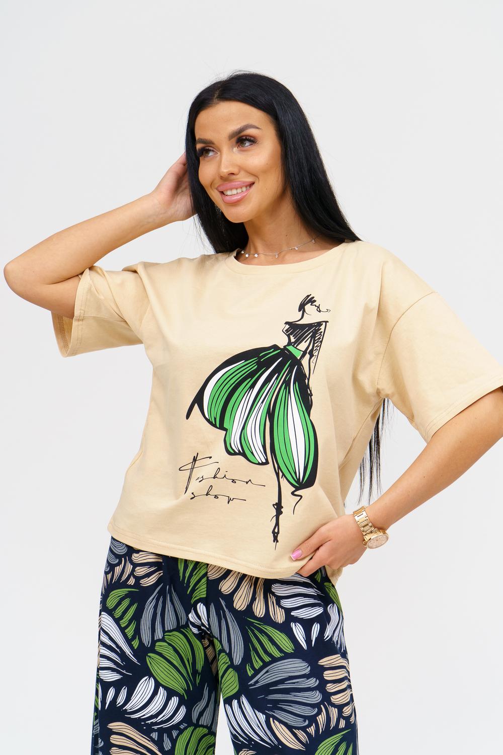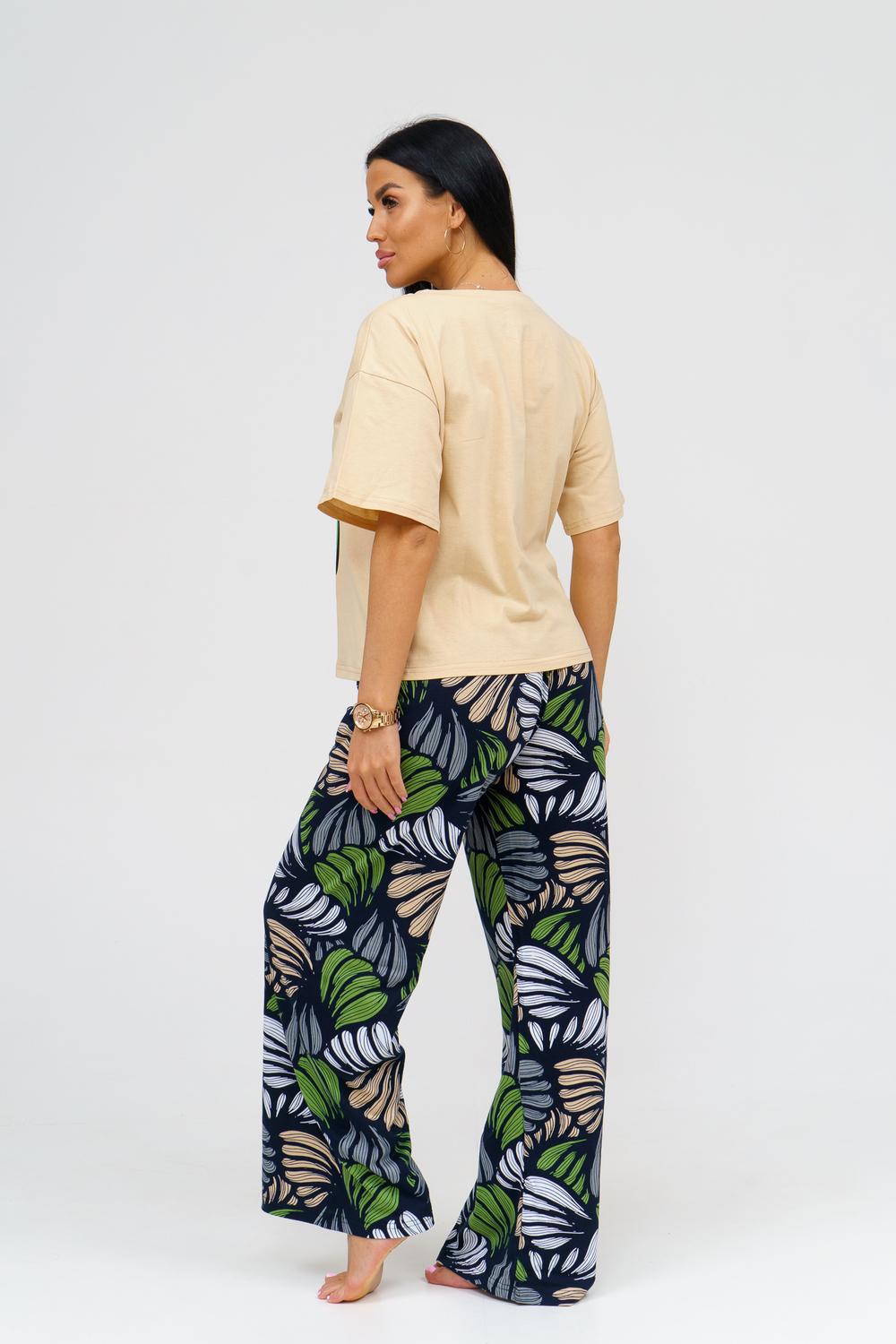 Комплект из широких брюк без бокового шва и оригинальной футболки с печатью. Пояс брюк отстрочен на спецмашине. Срезы футболки подшиты на плоскошовке.